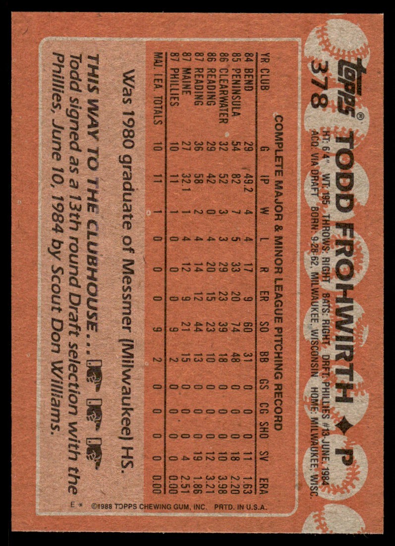 1988 Topps Todd Frohwirth Rookie Philadelphia Phillies #378