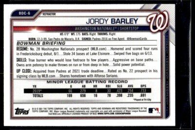 2021 Bowman Draft Chrome Refractor Jordy Barley Washington Nationals #BDC-6