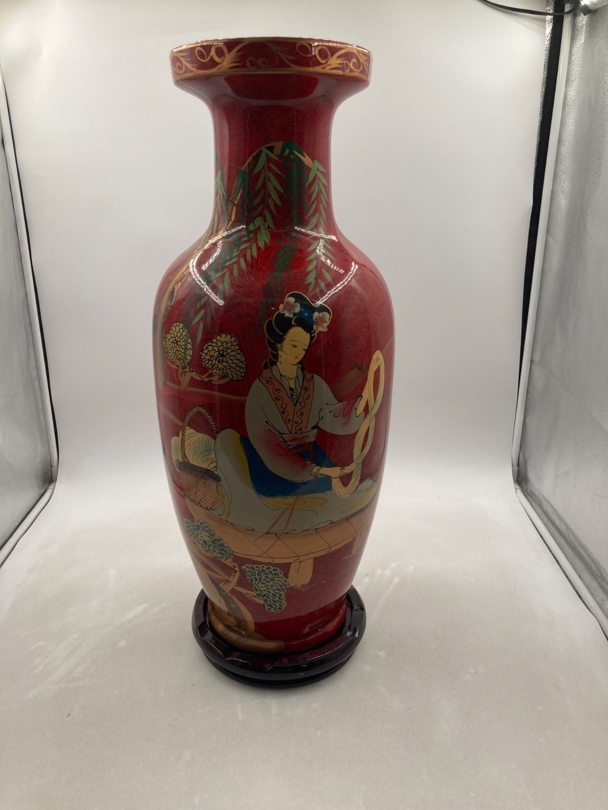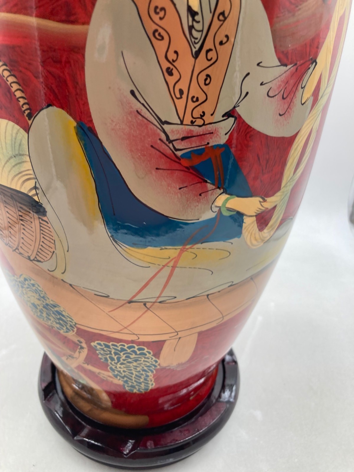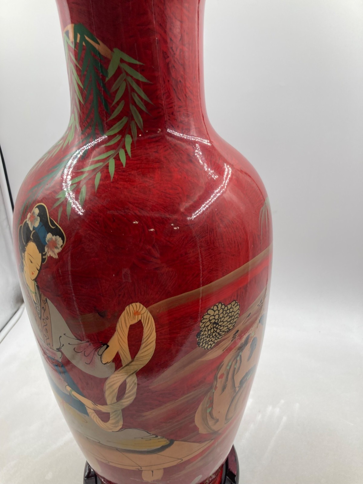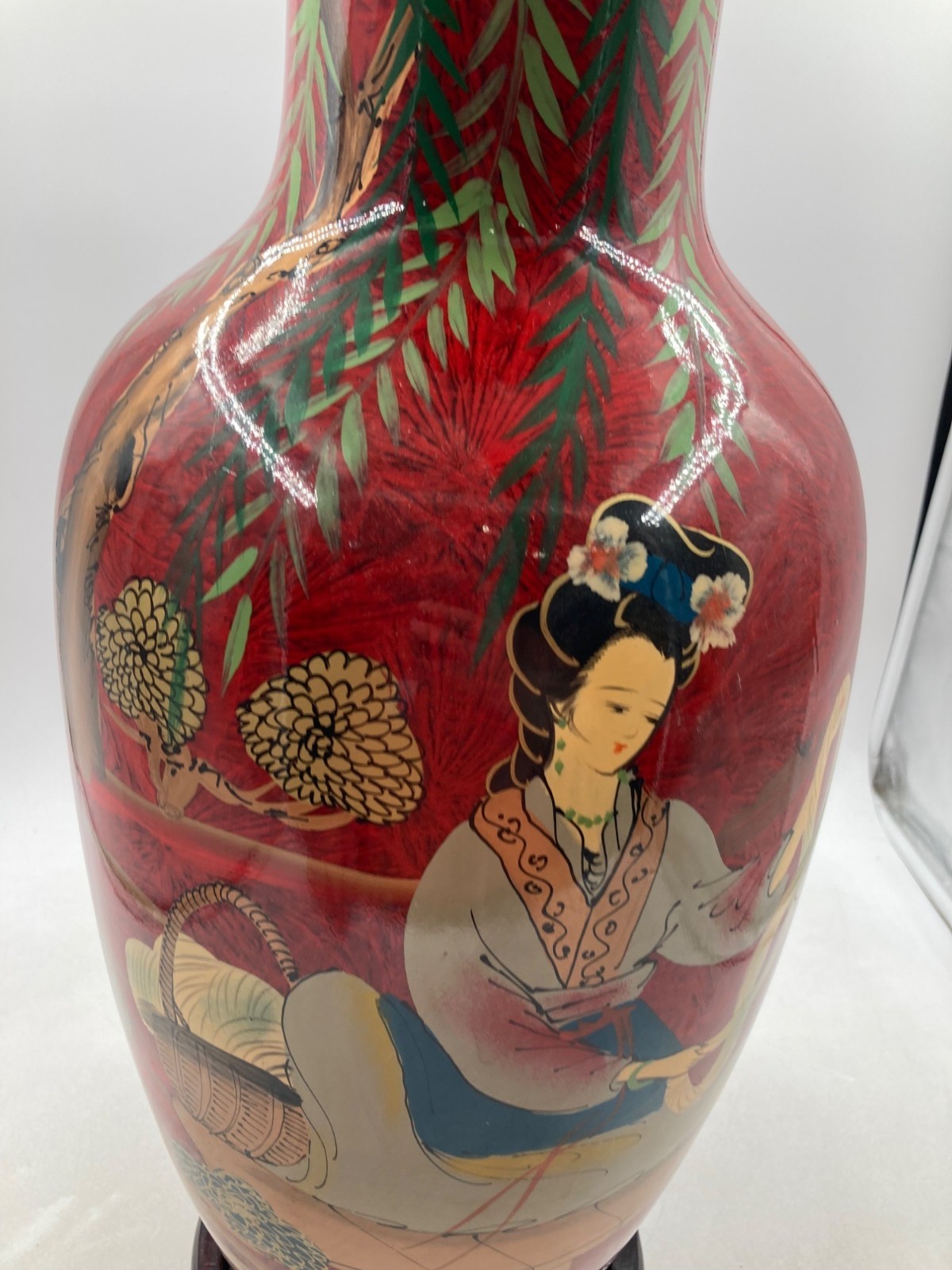 24IN VINTAGE CHINESE HAND PAINTED VASE WITH WOOD BASE.
