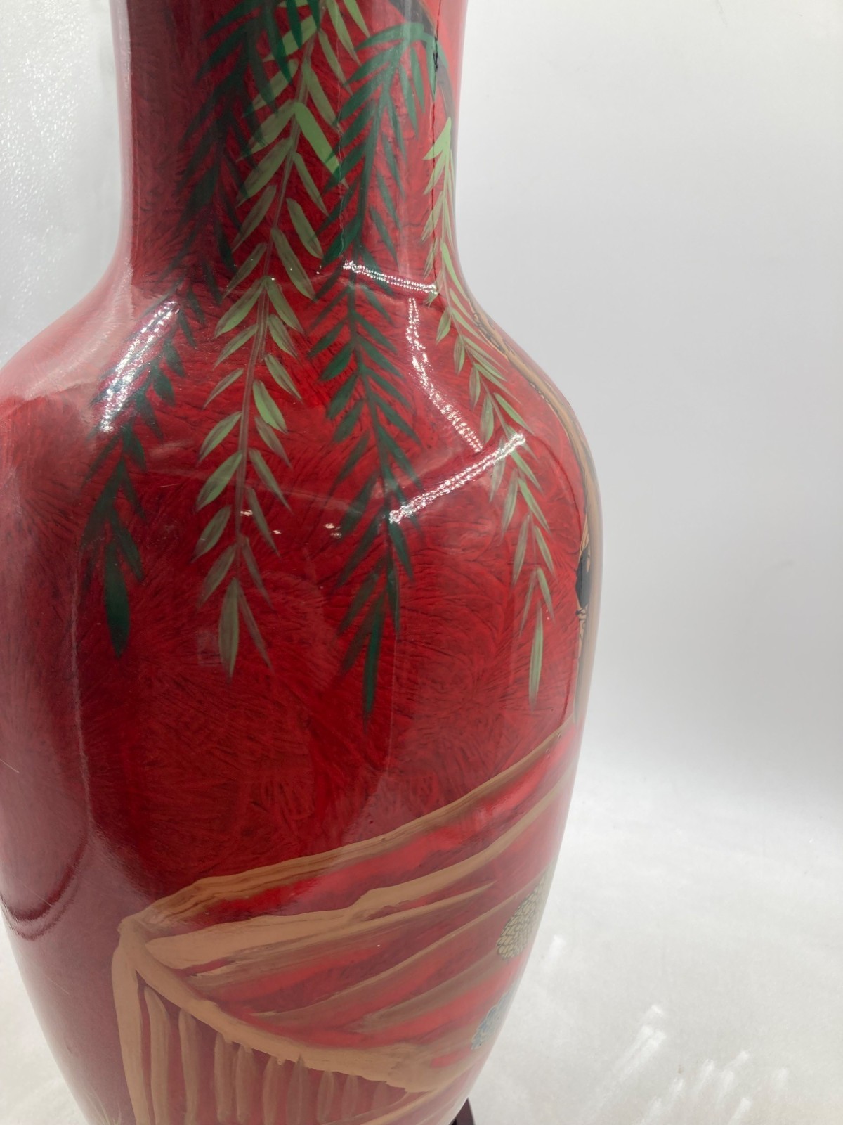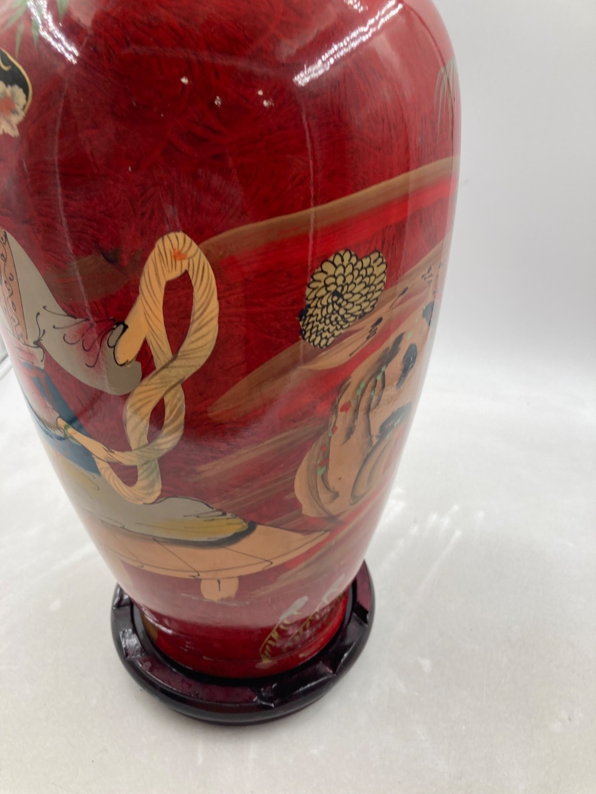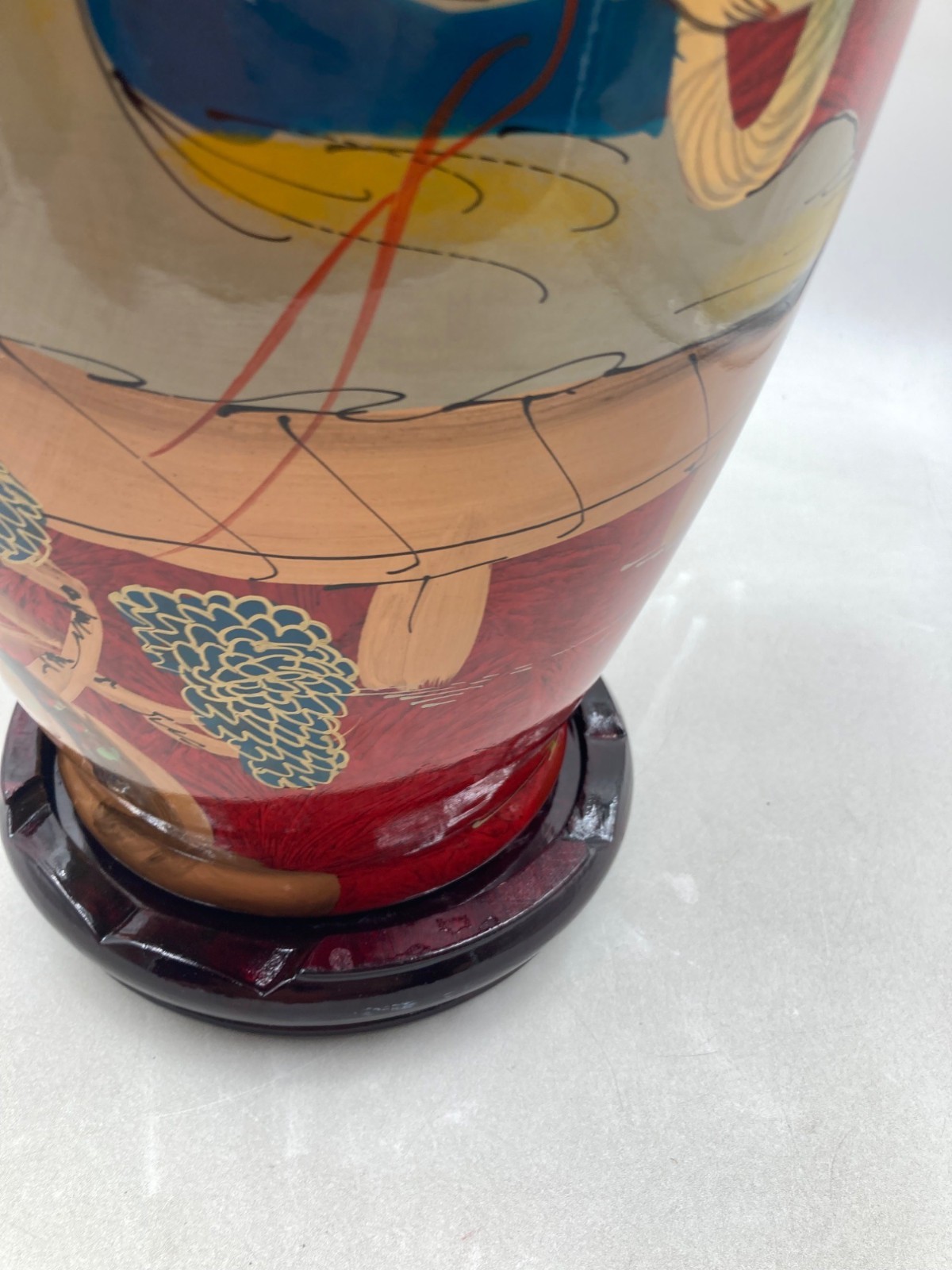 24IN VINTAGE CHINESE HAND PAINTED VASE WITH WOOD BASE.