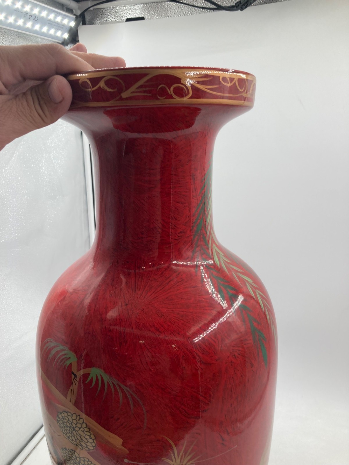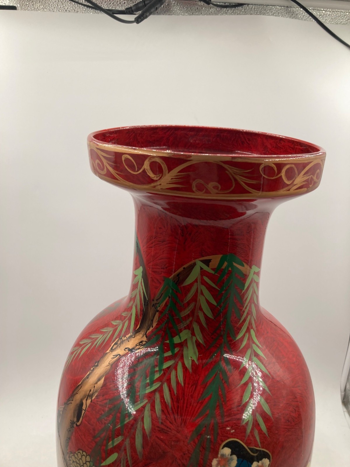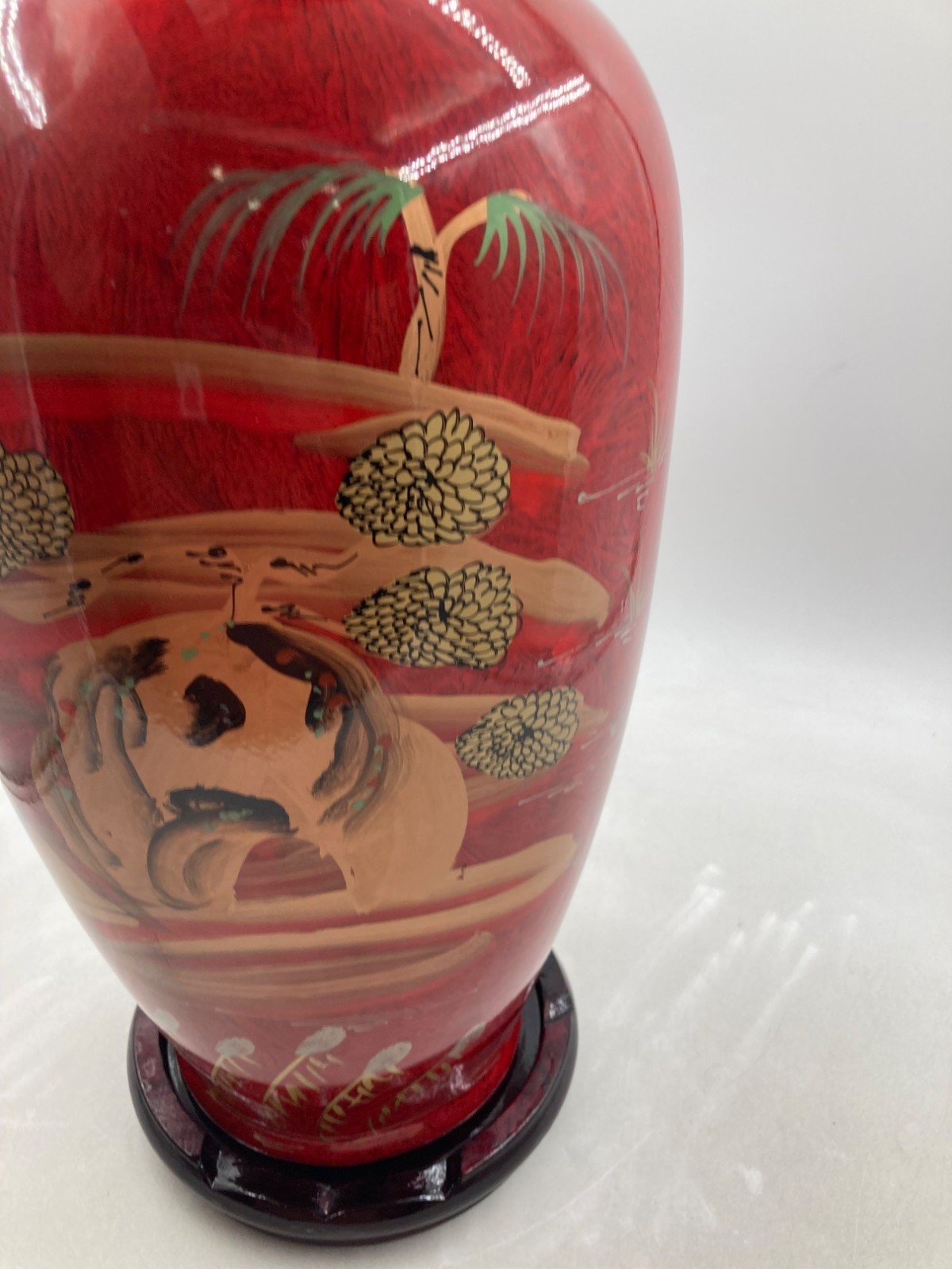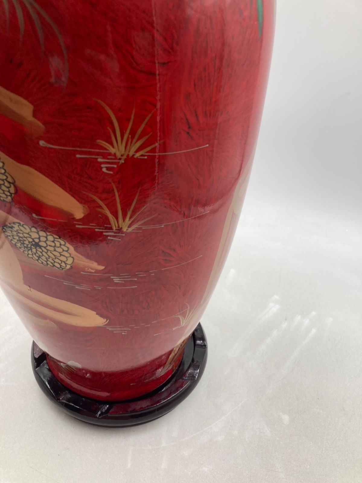24IN VINTAGE CHINESE HAND PAINTED VASE WITH WOOD BASE.