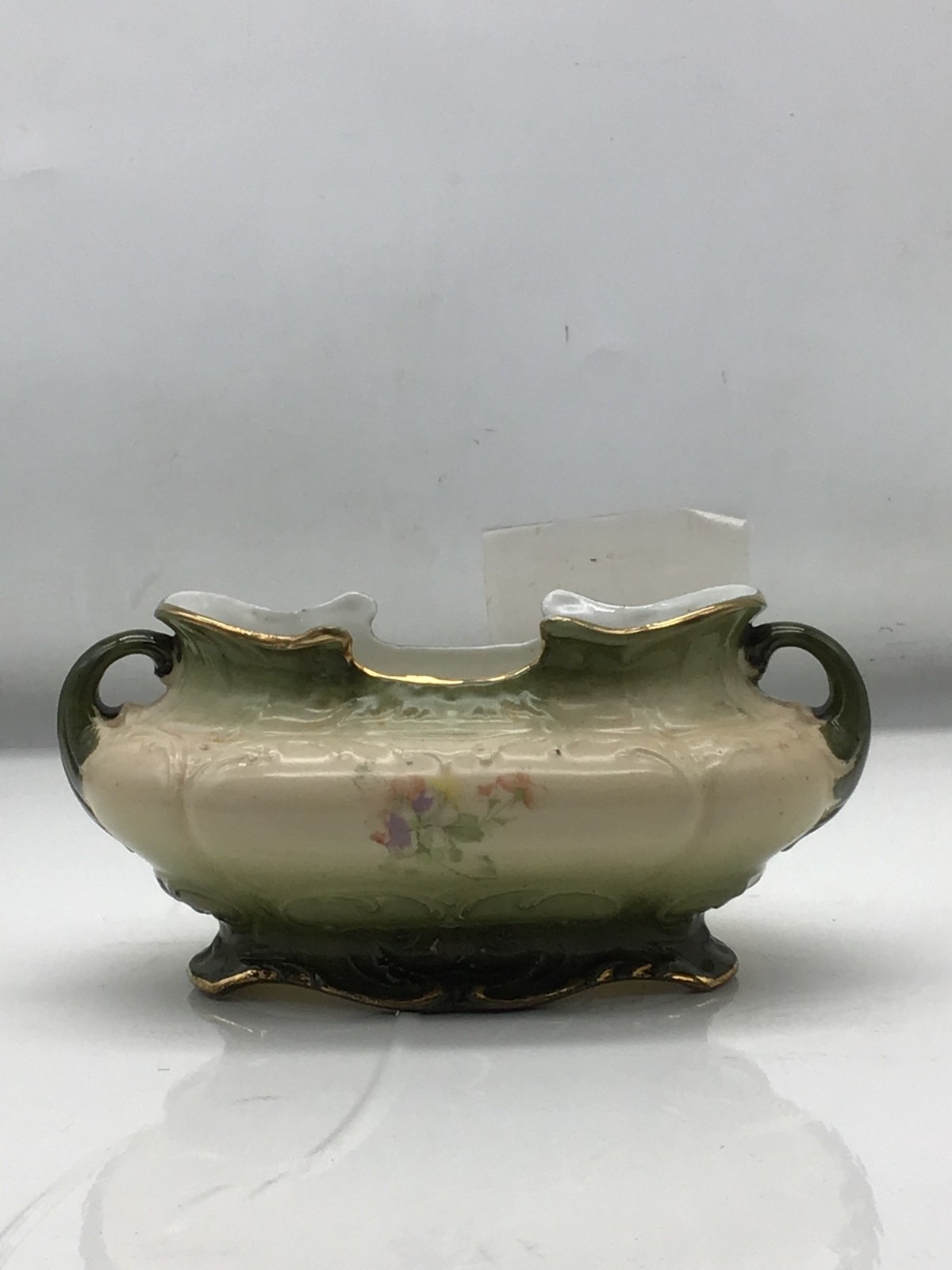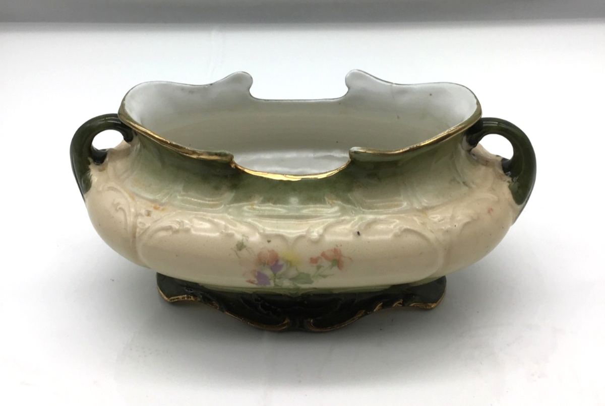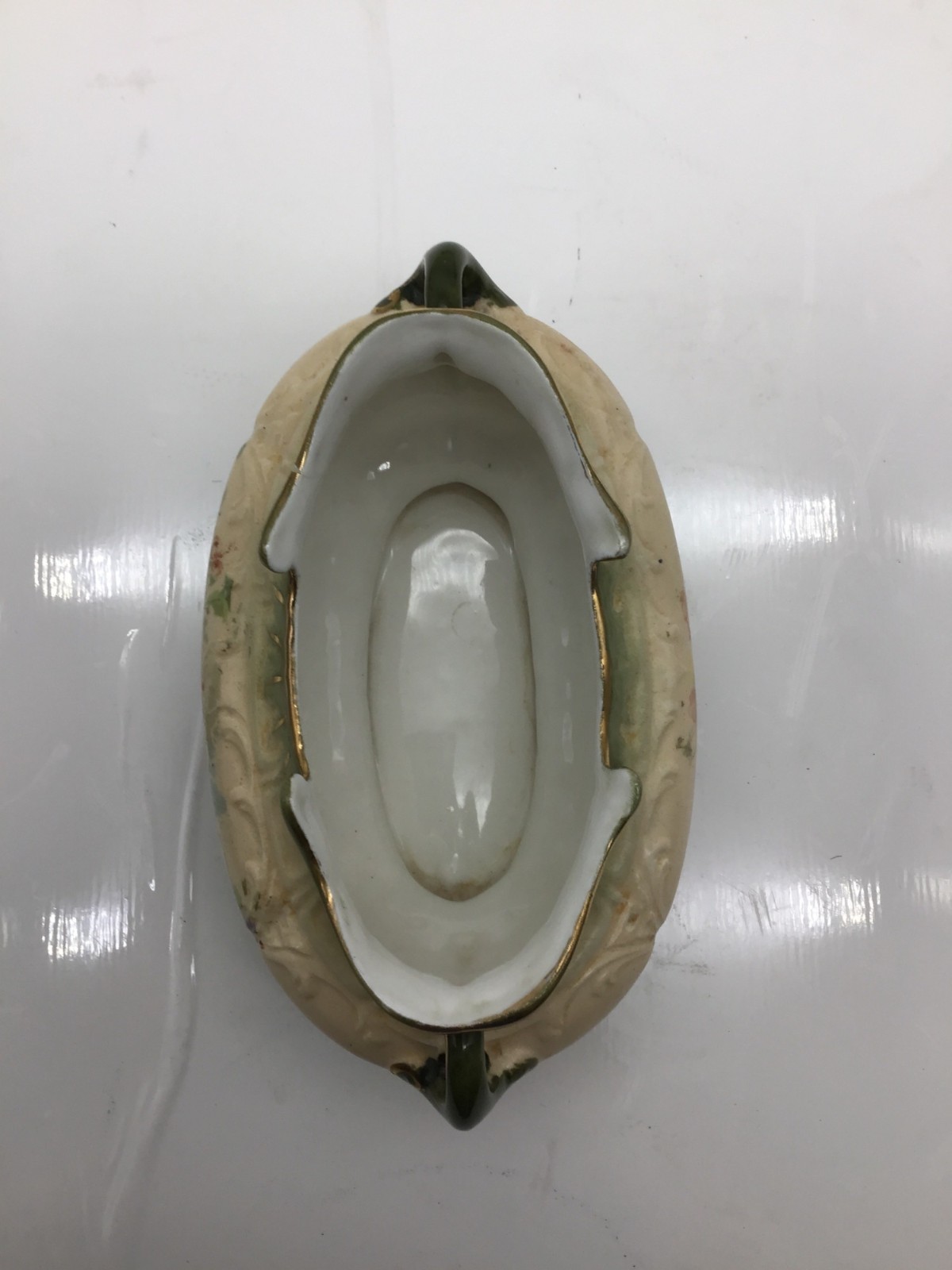 Antique Austrian Glass Green & White Oval Shape Decor Bowl w/ 2 Handles