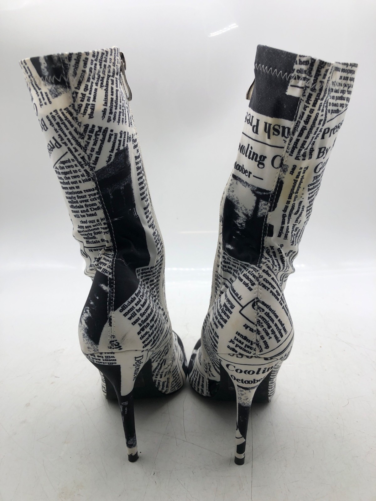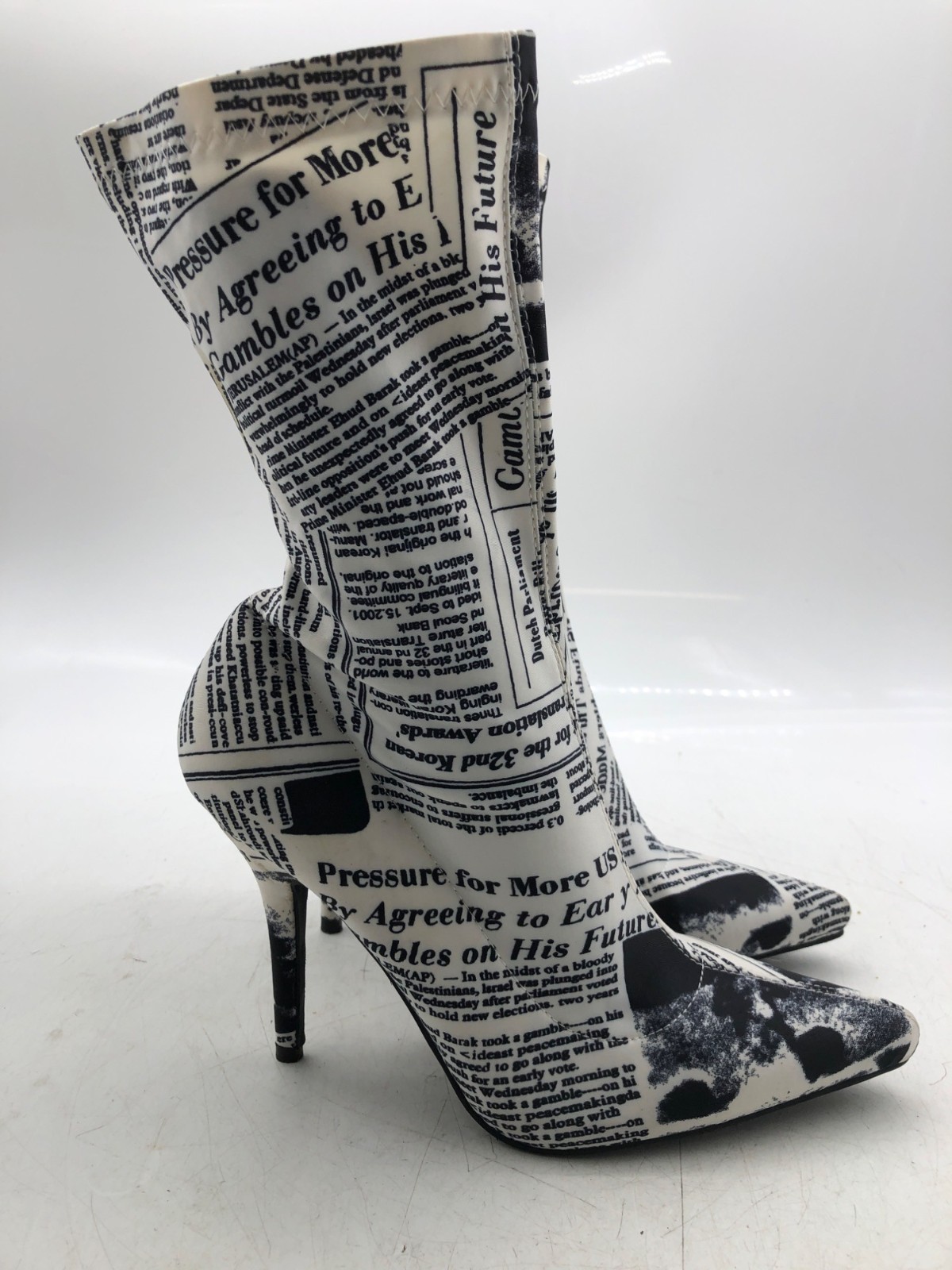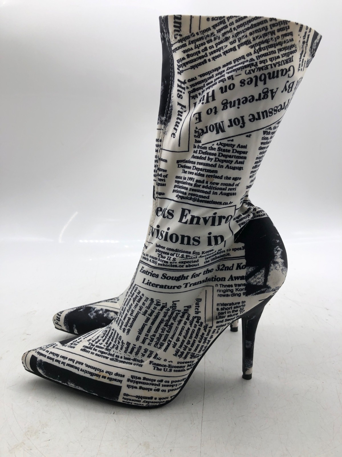 Azalea Wang Womens Black/White Newspaper Graphic Nylon Mid-Calf Heels- Size 8