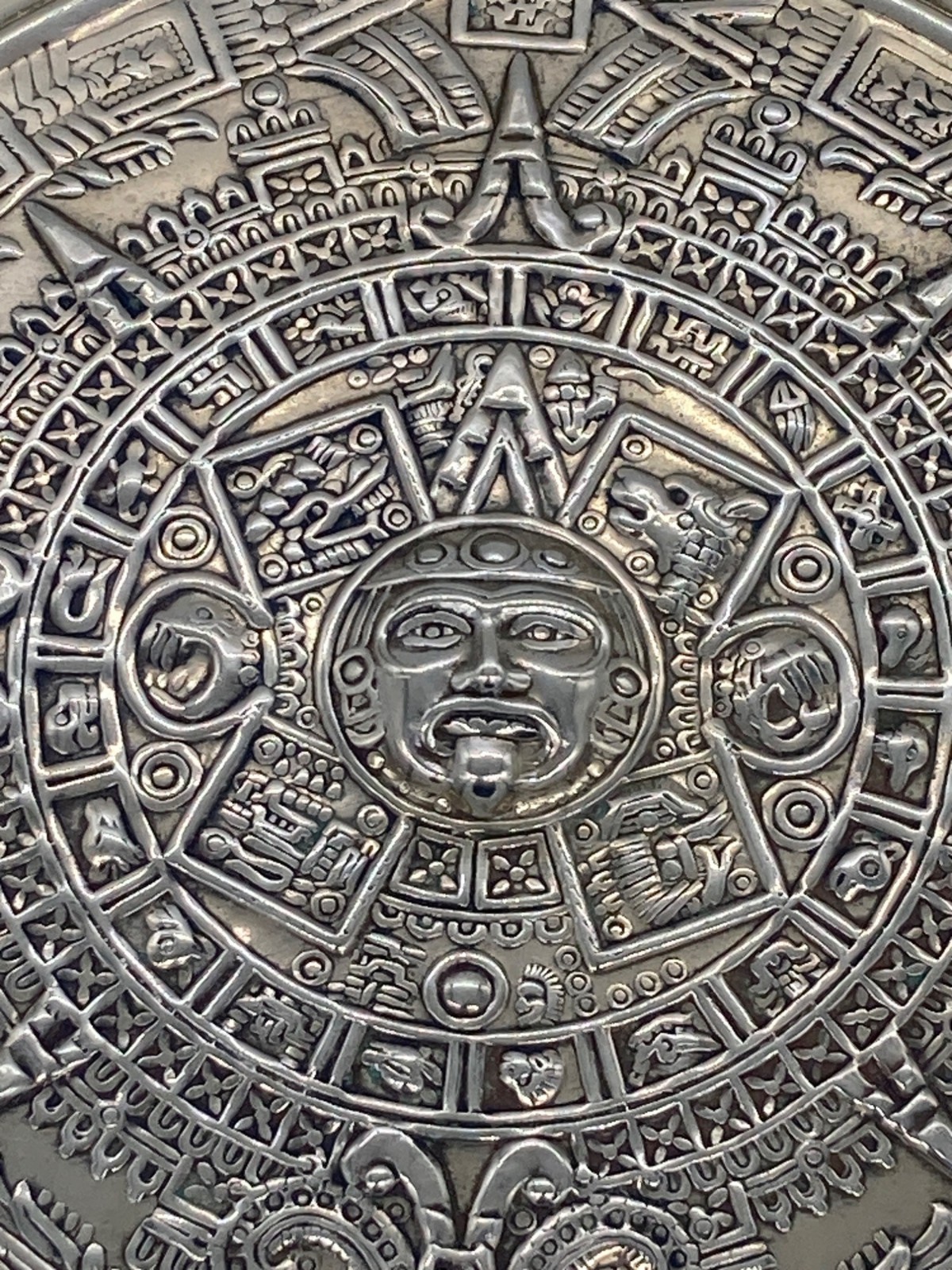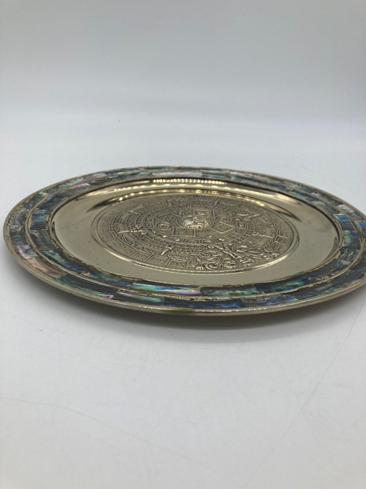 Aztec Calendar Brass Plate With Abalone Shell Inlay Decorative Wall Hanging