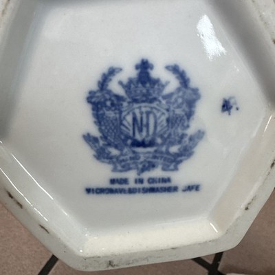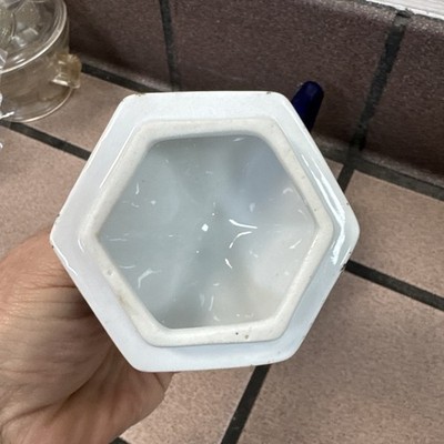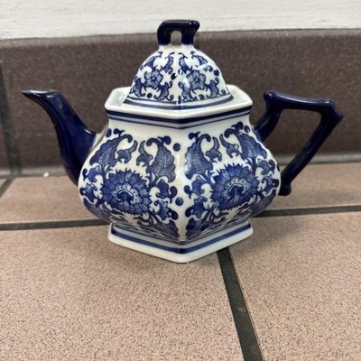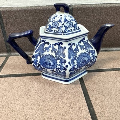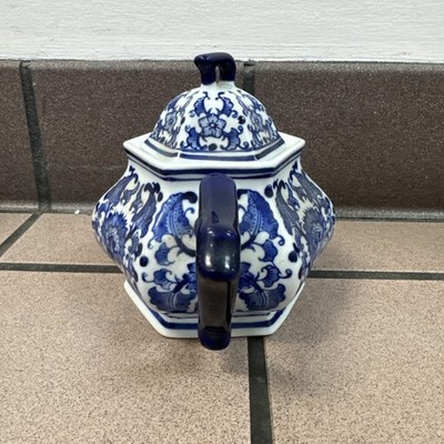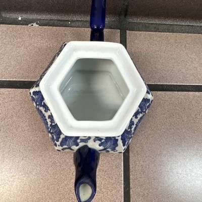 Beautiful Vintage Hexagonal Blue & White Porcelain Teapot Chinoiserie Style, EUC