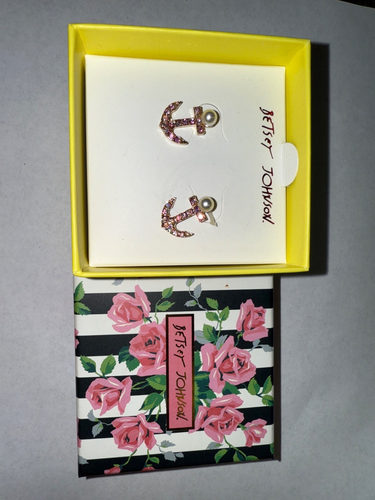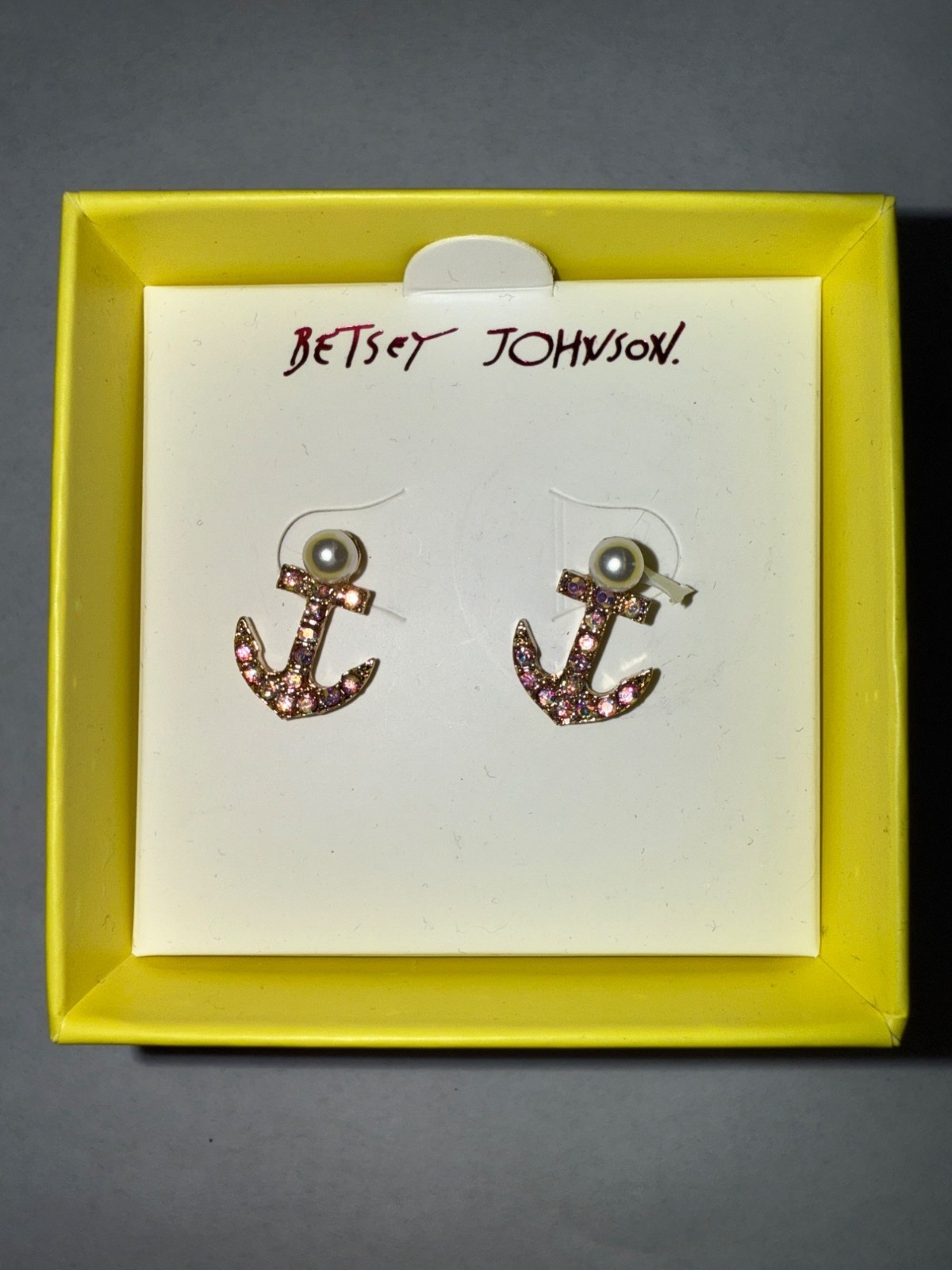 Betsey Johnson Anchor Earrings With Pink Rhinestones & Faux Pearl Studs In Gift