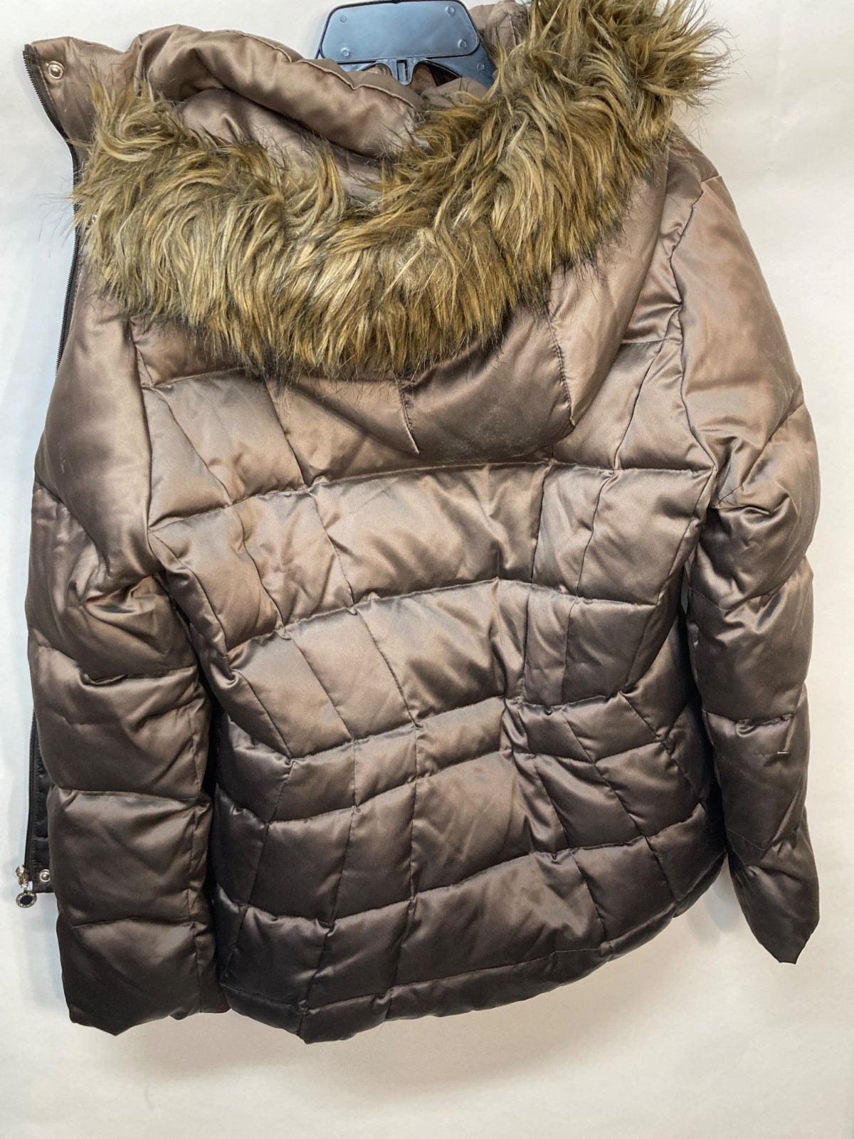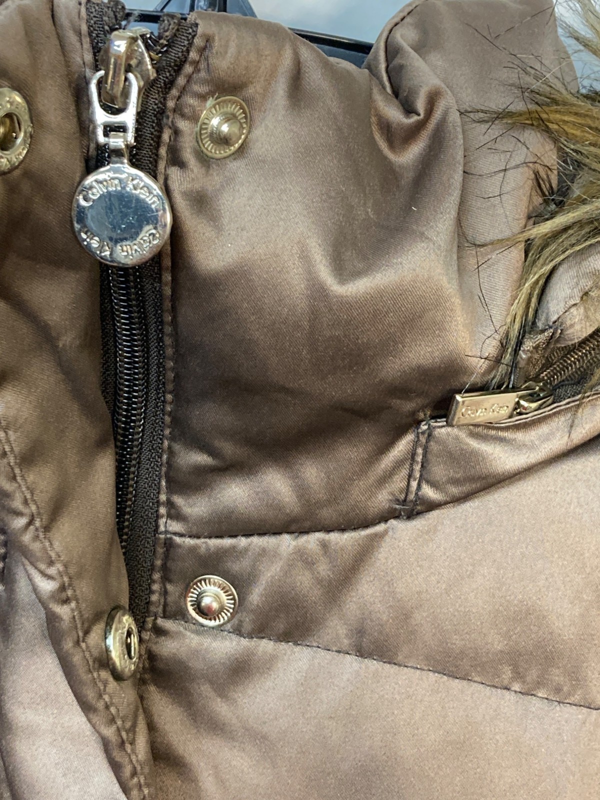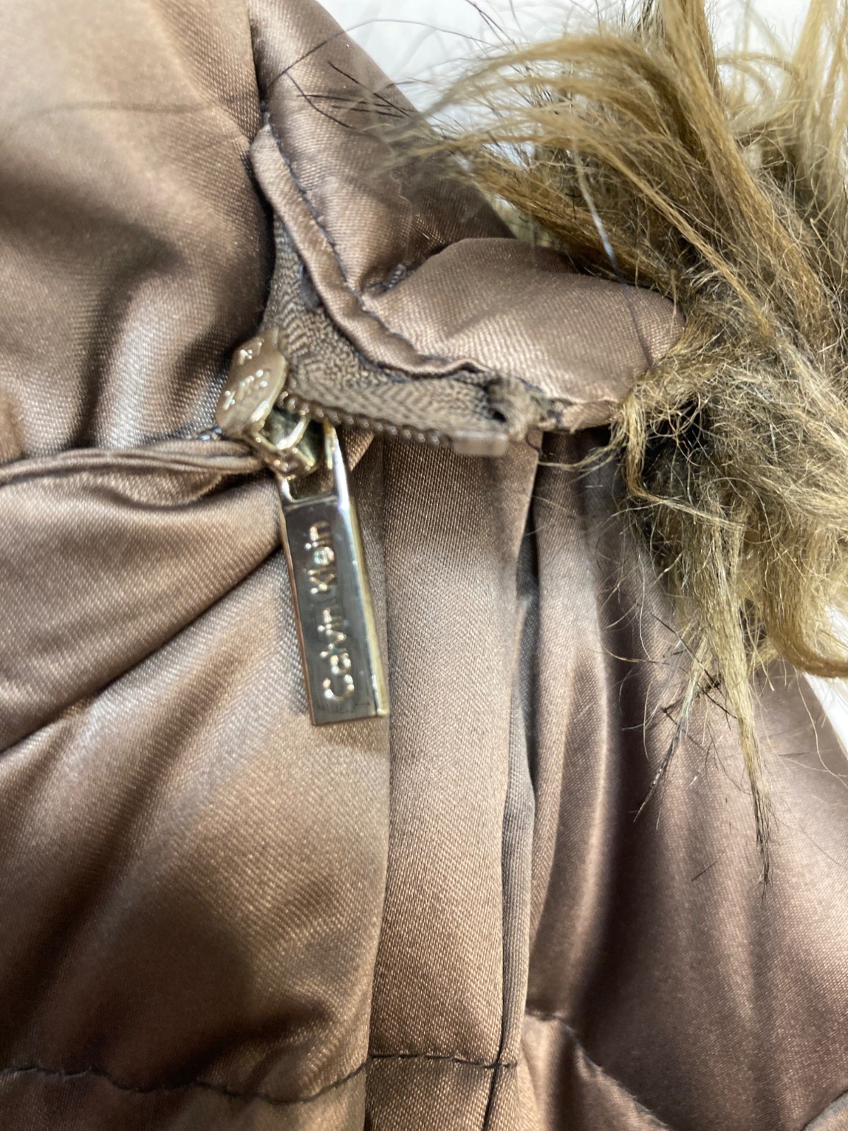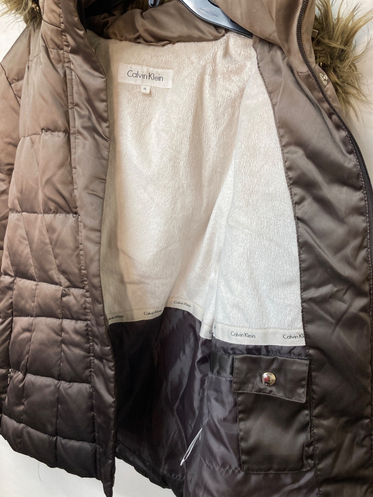 Calvin Klein Womens Quilted Fur Hooded Puffer Coat In Brown Size PL With Zipper
