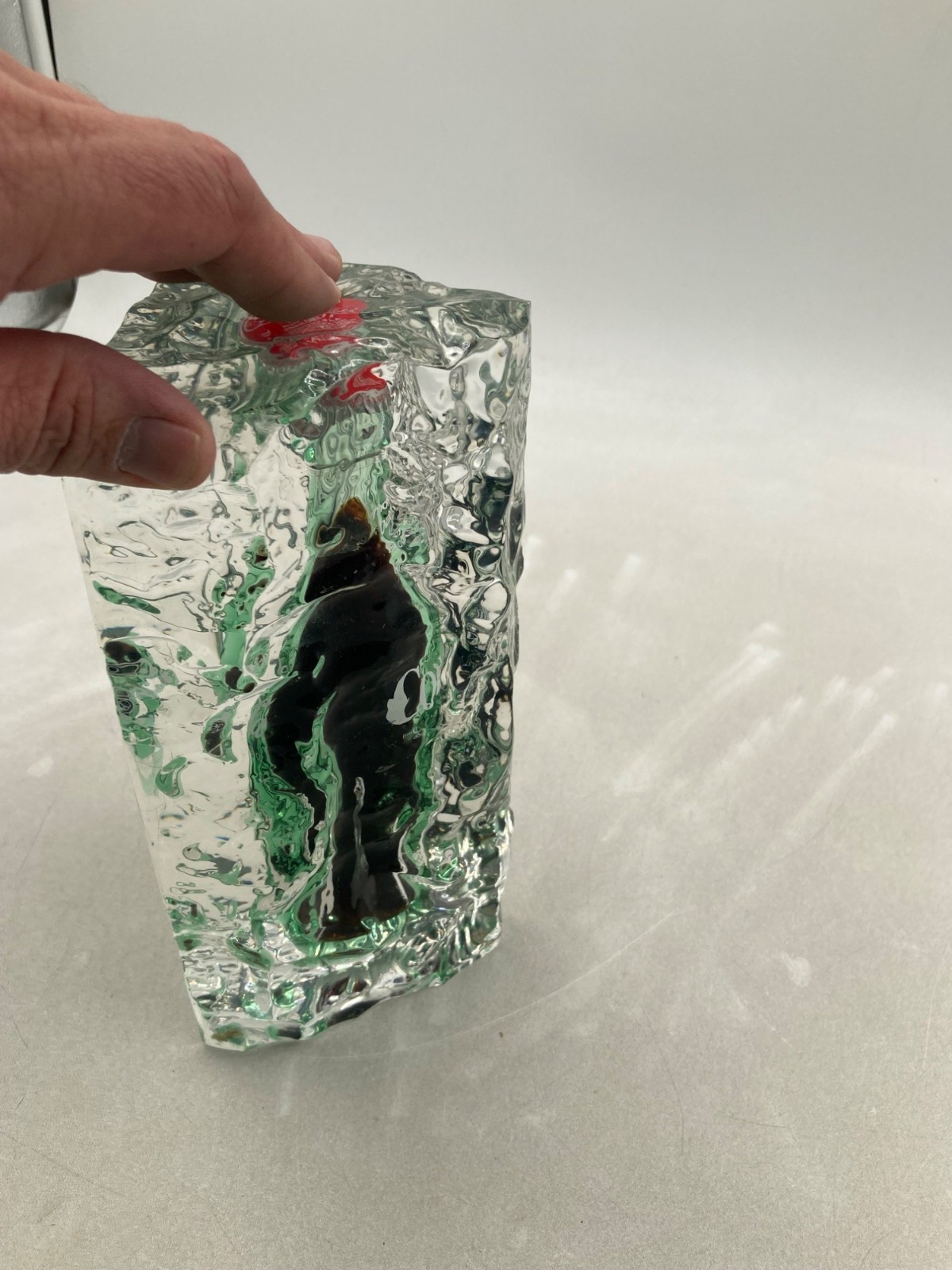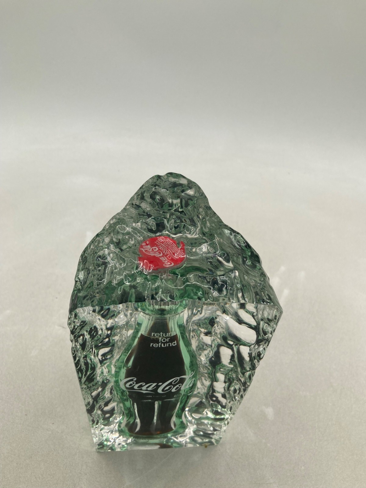 COCA-COLA MINITURE GLASS BOTTLE RED CAP INCAGED IN ACRYLIC