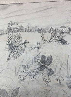 Country Field Birds Dogs Farm Black White Signed Paper Picture Drawing No Frame