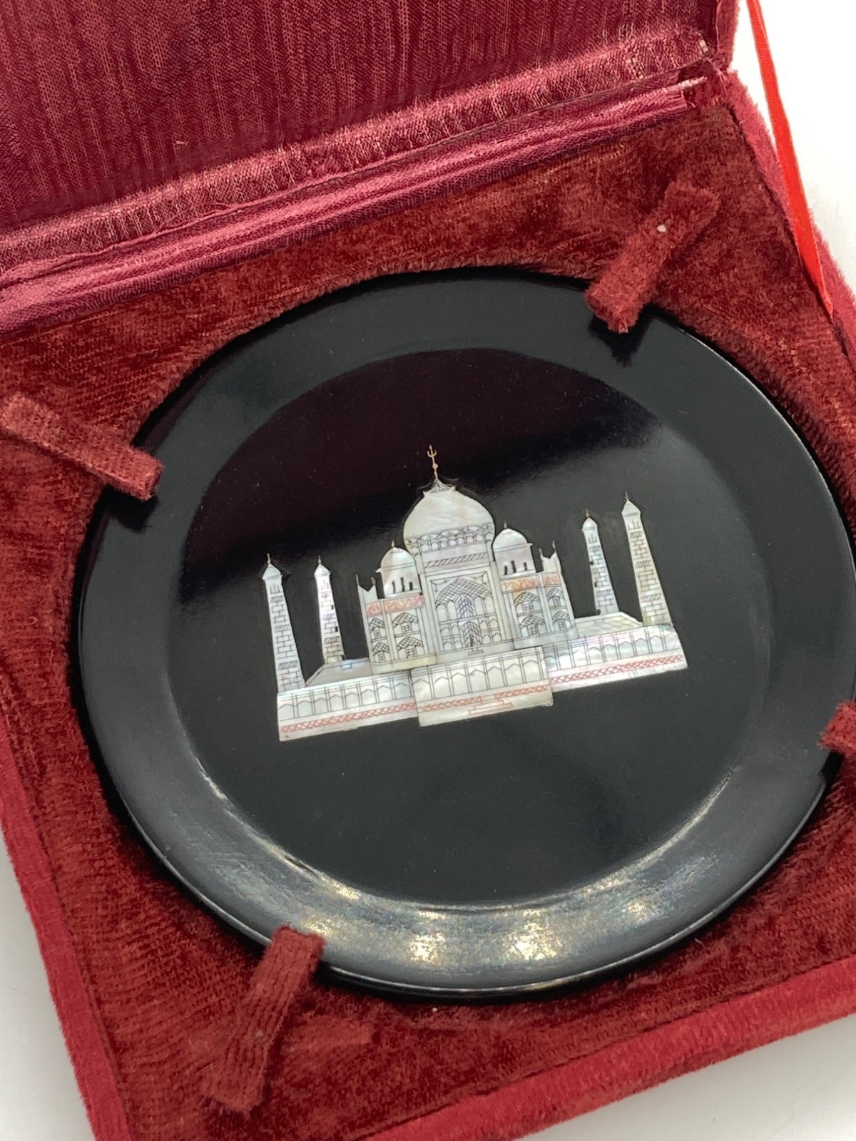 Decorative Black Marble Plate With Taj Mahal Inlay In Velvet Box