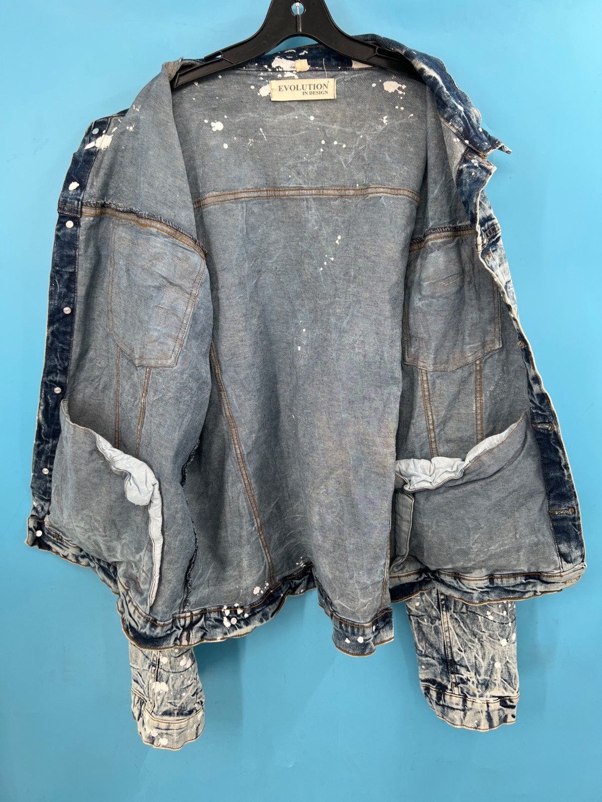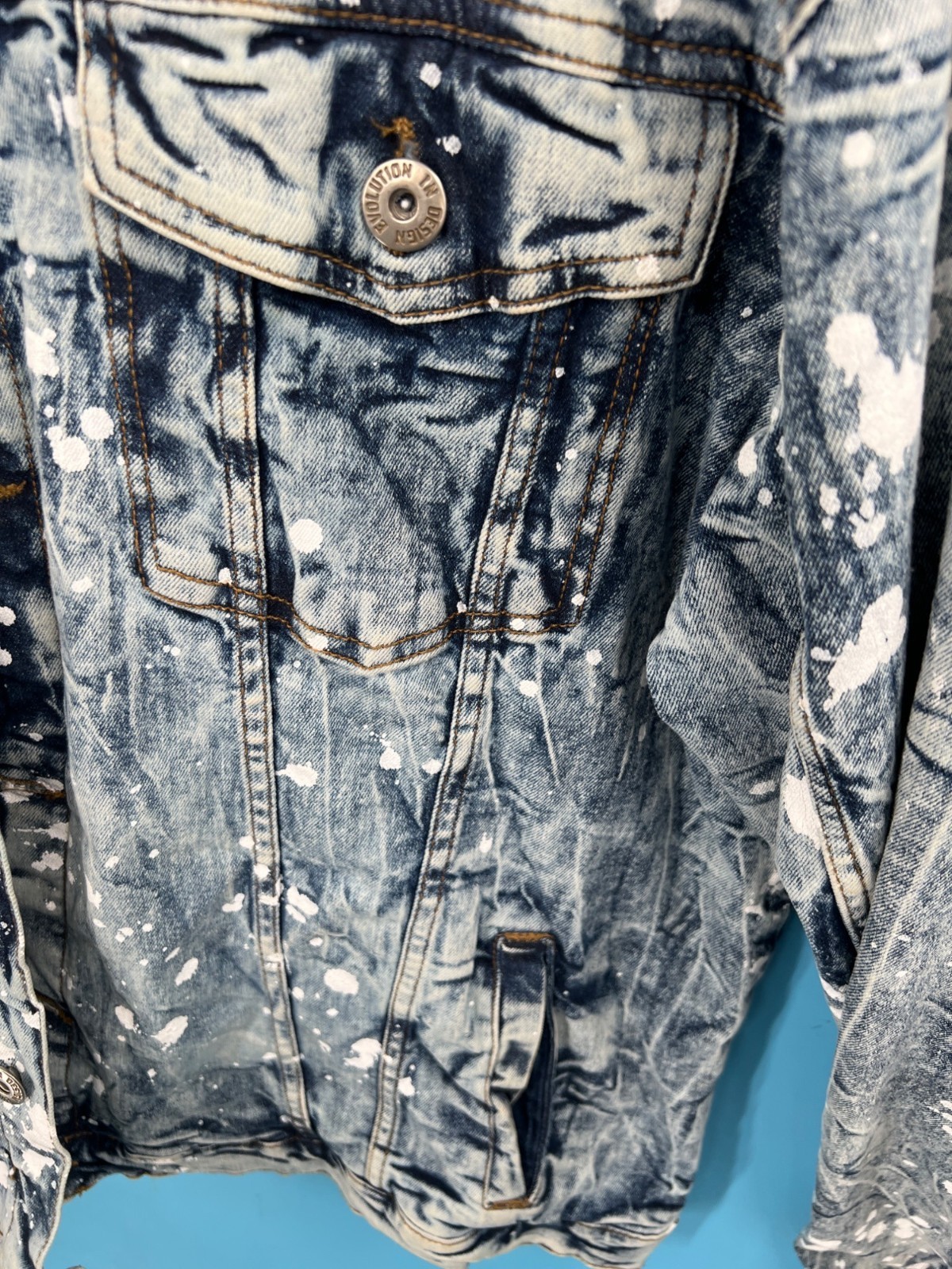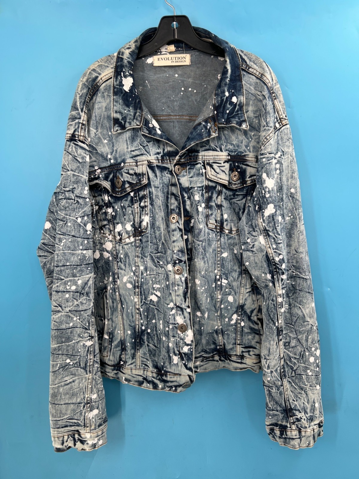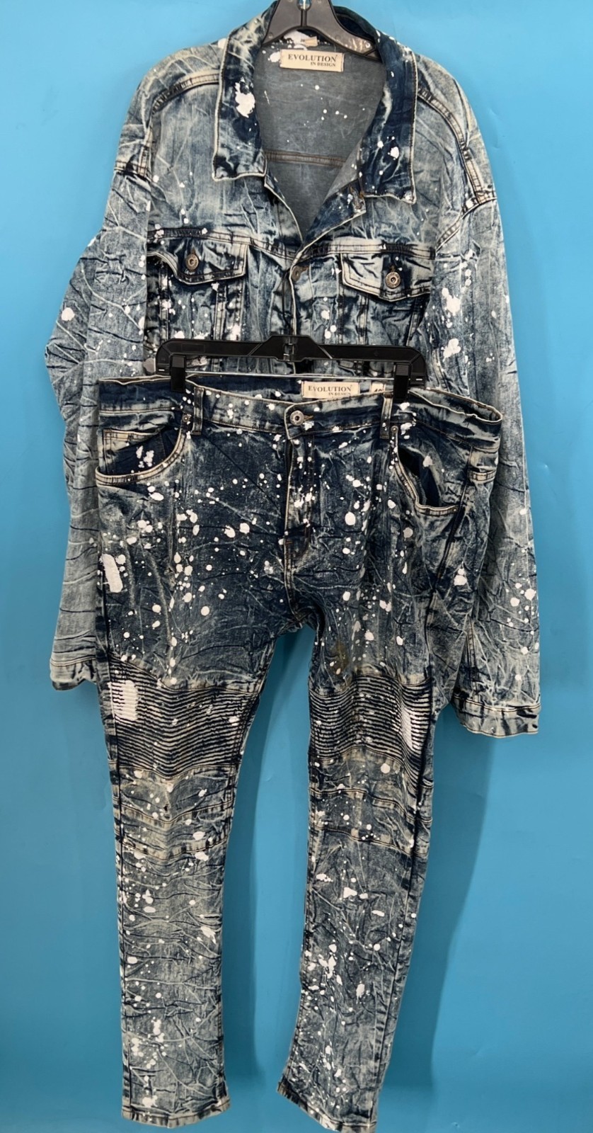 EVOLUTION In Design Paint Splatter Acid Wash Denim Jacket & Jeans Set Men