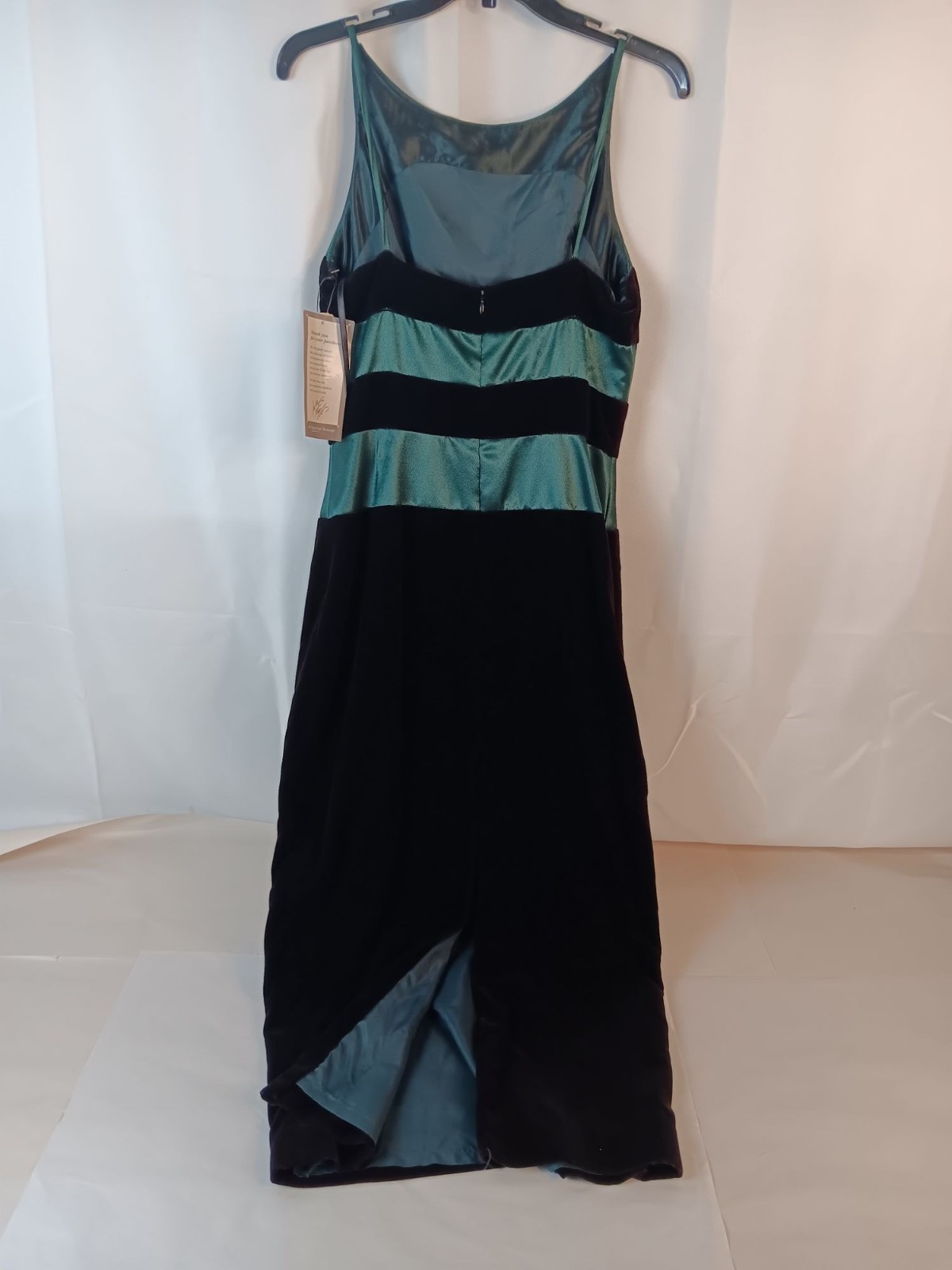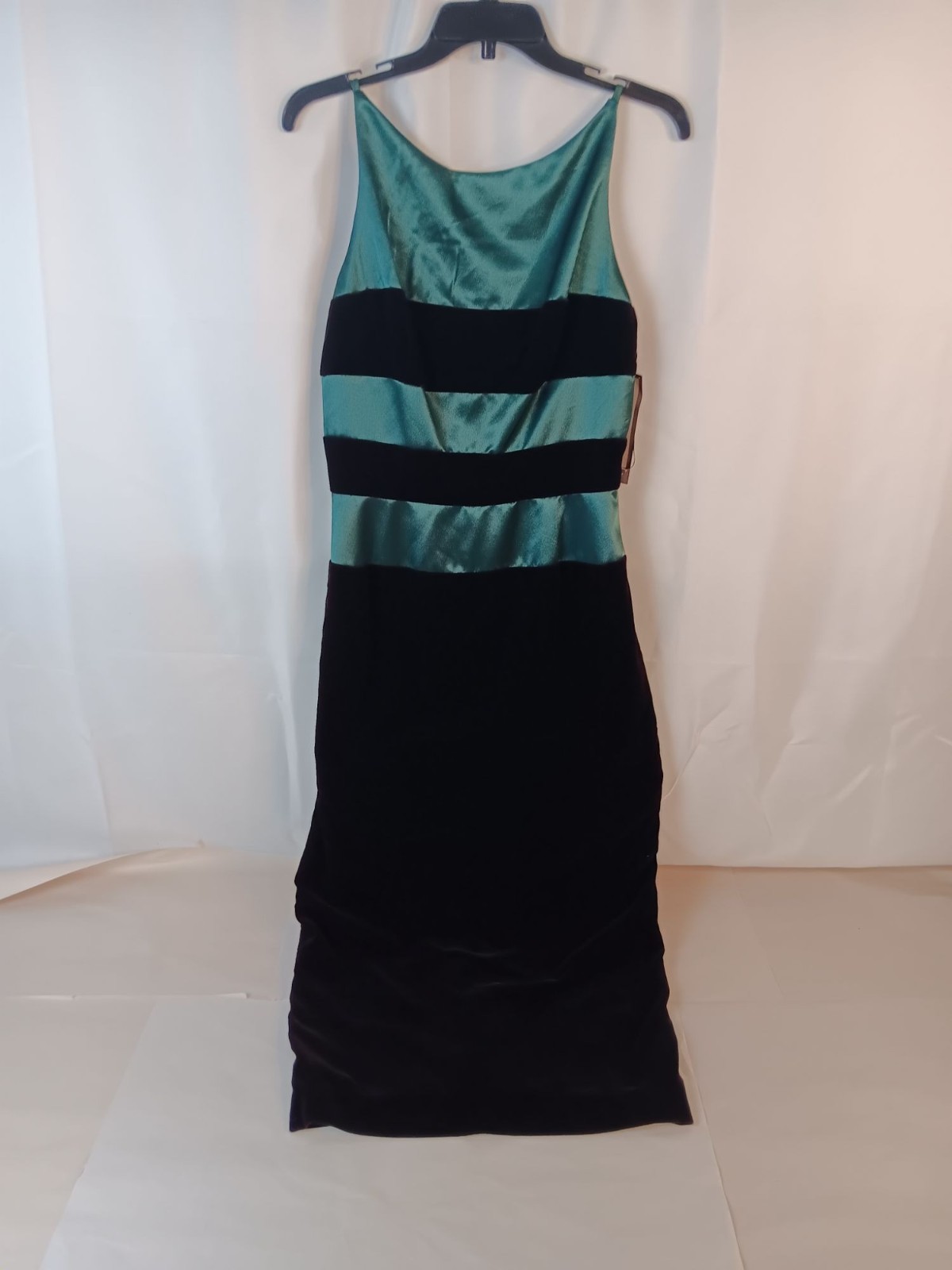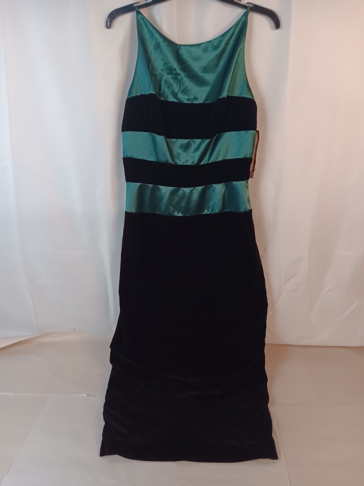 Green & Black Satin & Velvet Sleeveless Evening Gown With Back Slit