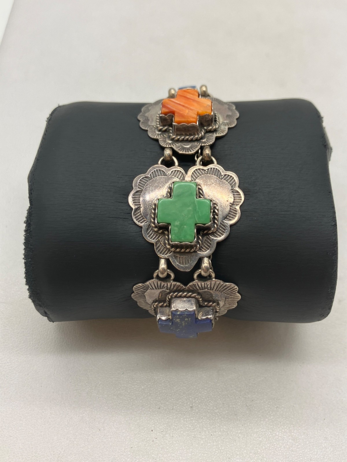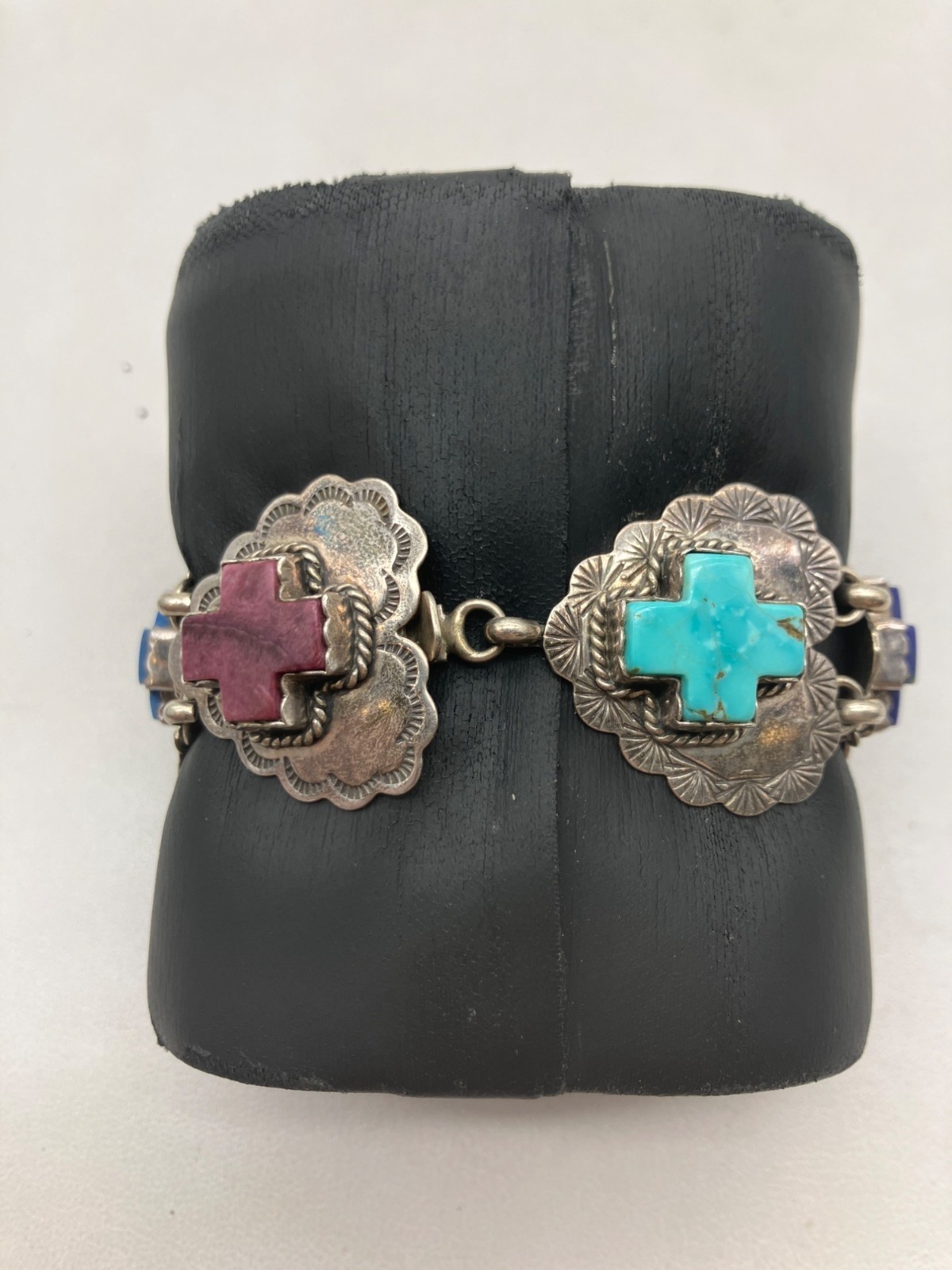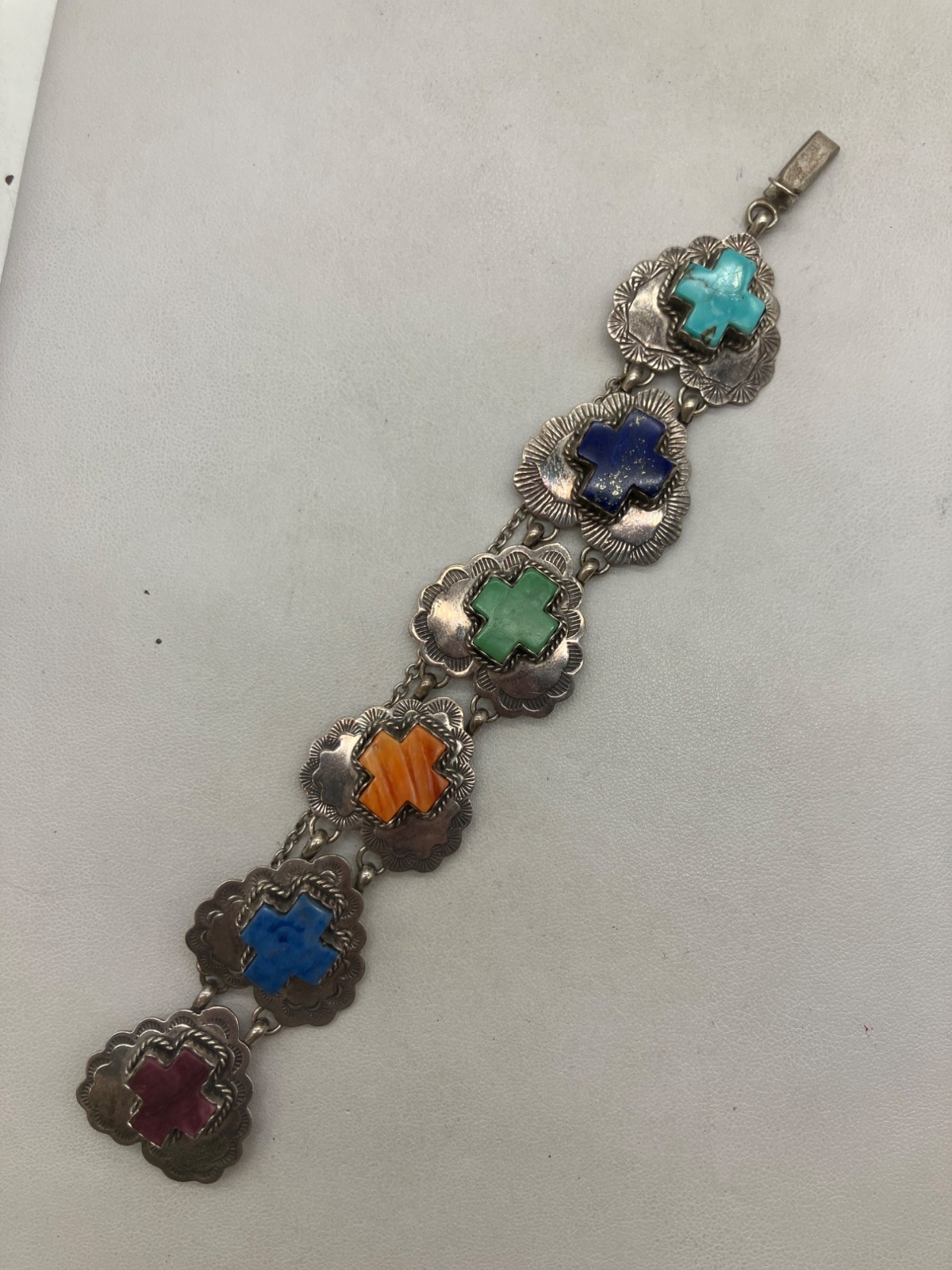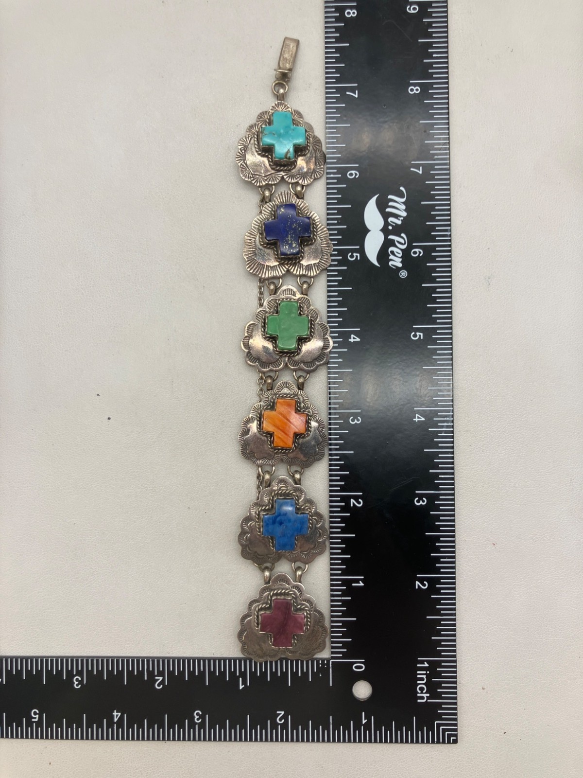 JOAN SLIFKA Sterling Silver Multi-Stone Cross & Heart Bracelet 6.75in - 44.6g