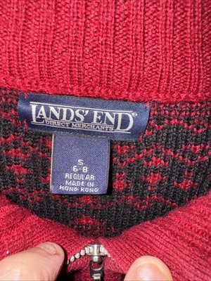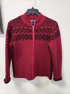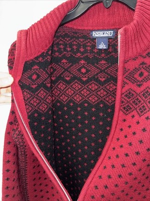 Lands' End Sweater Cardigan Zip Nordic Fair Isle Wool Red Black Crew Neck Size S