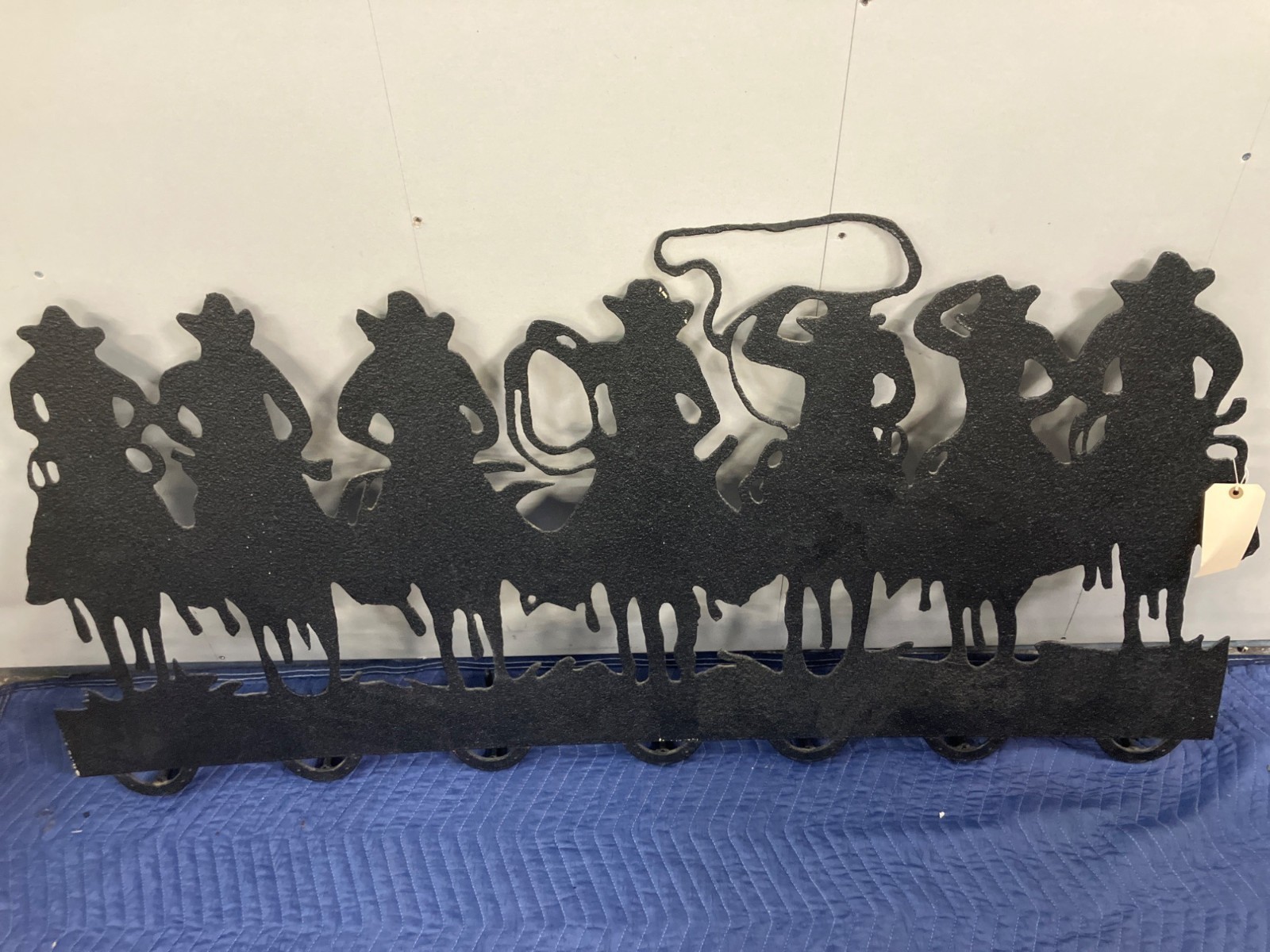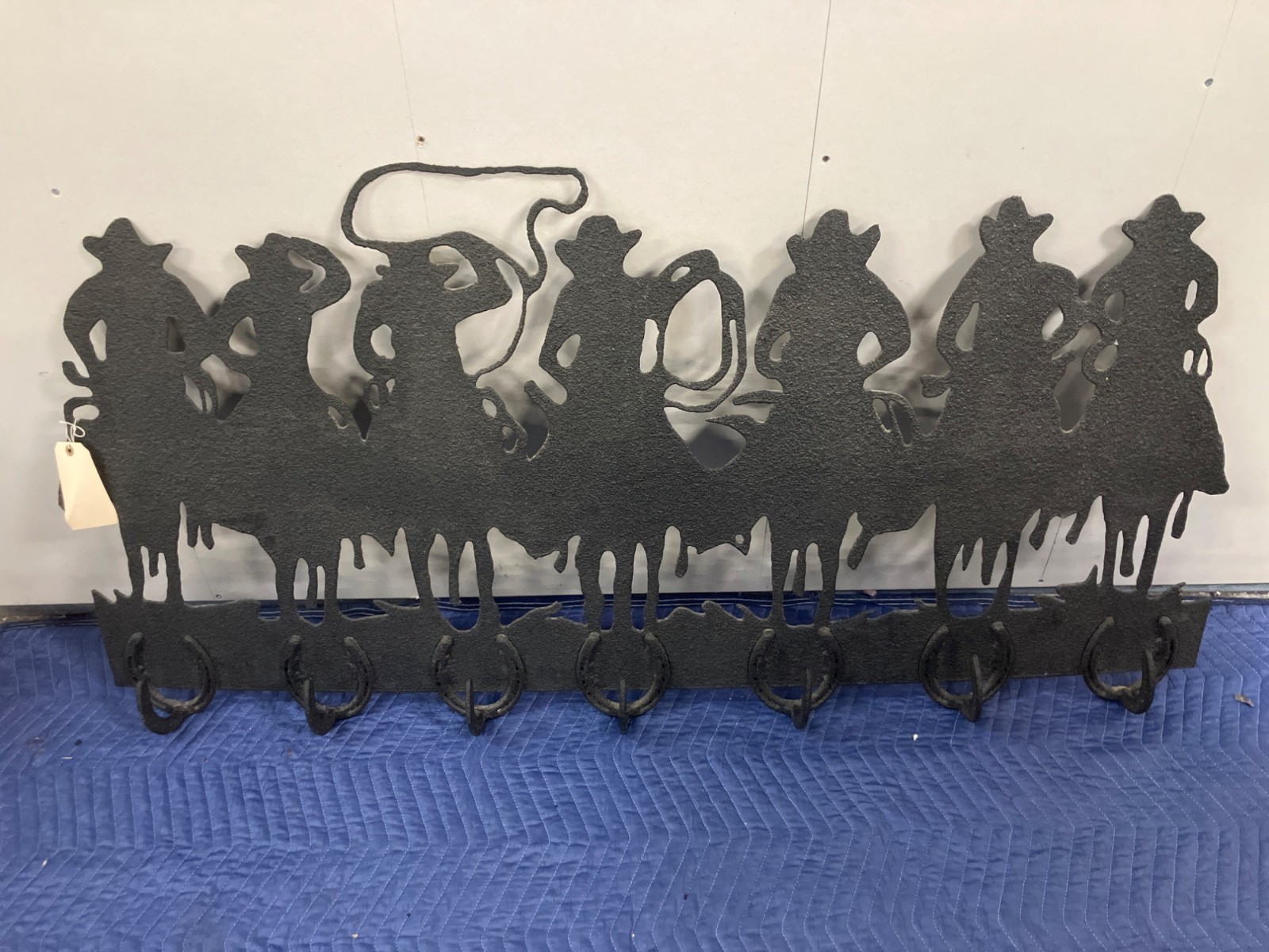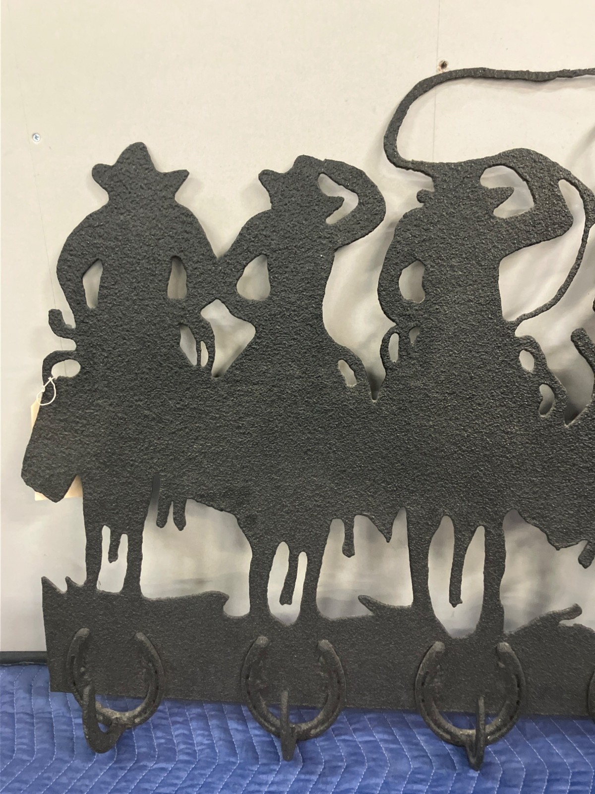 LARGE Wall Rack Metal Cowboy Art Silhouette Horseshoes Hooks 57" x 29"