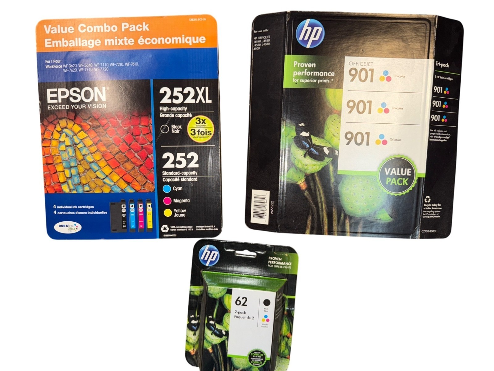 Lot 3 Ink Cartridge Set: Epson 252Xl & Hp 62/901 Printer Ink