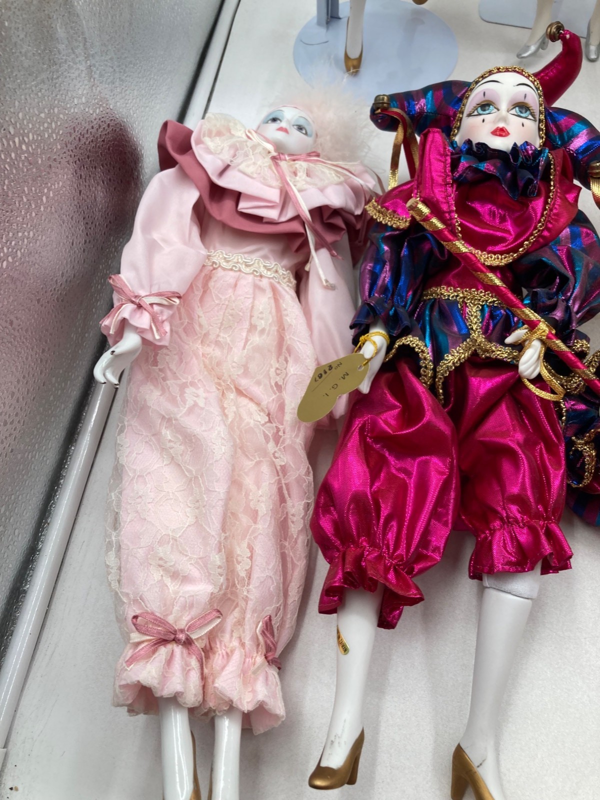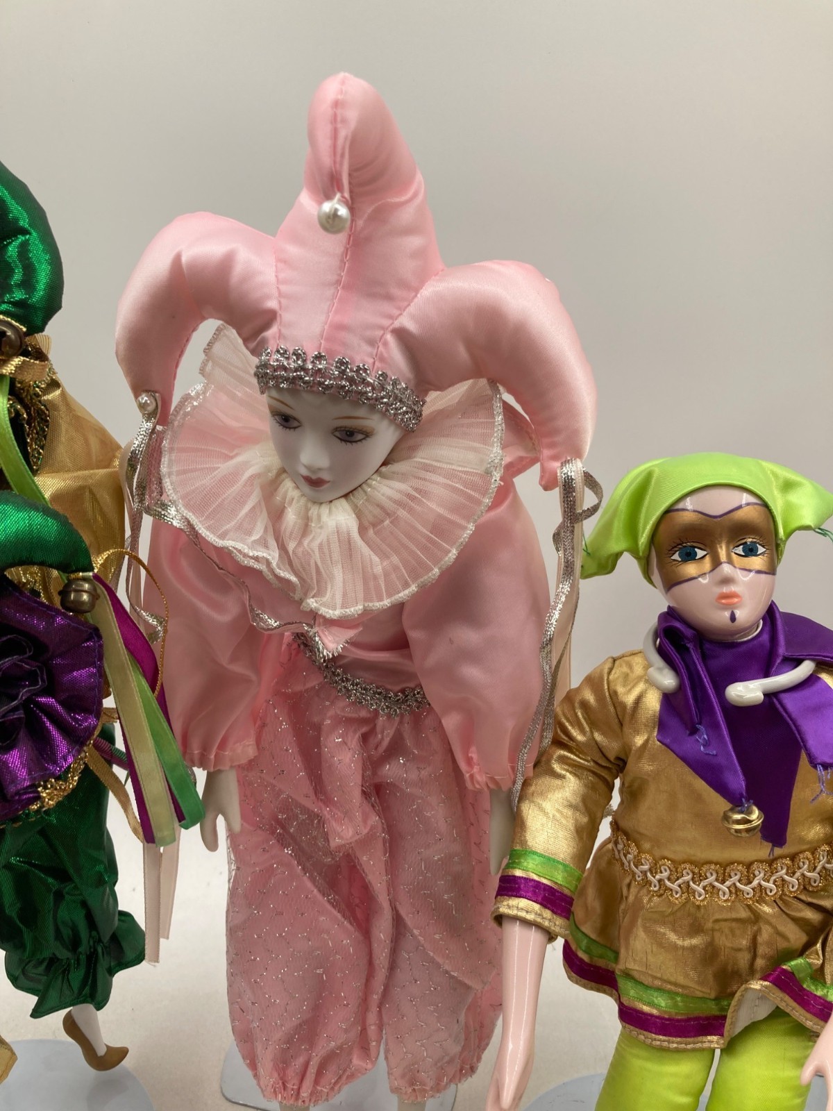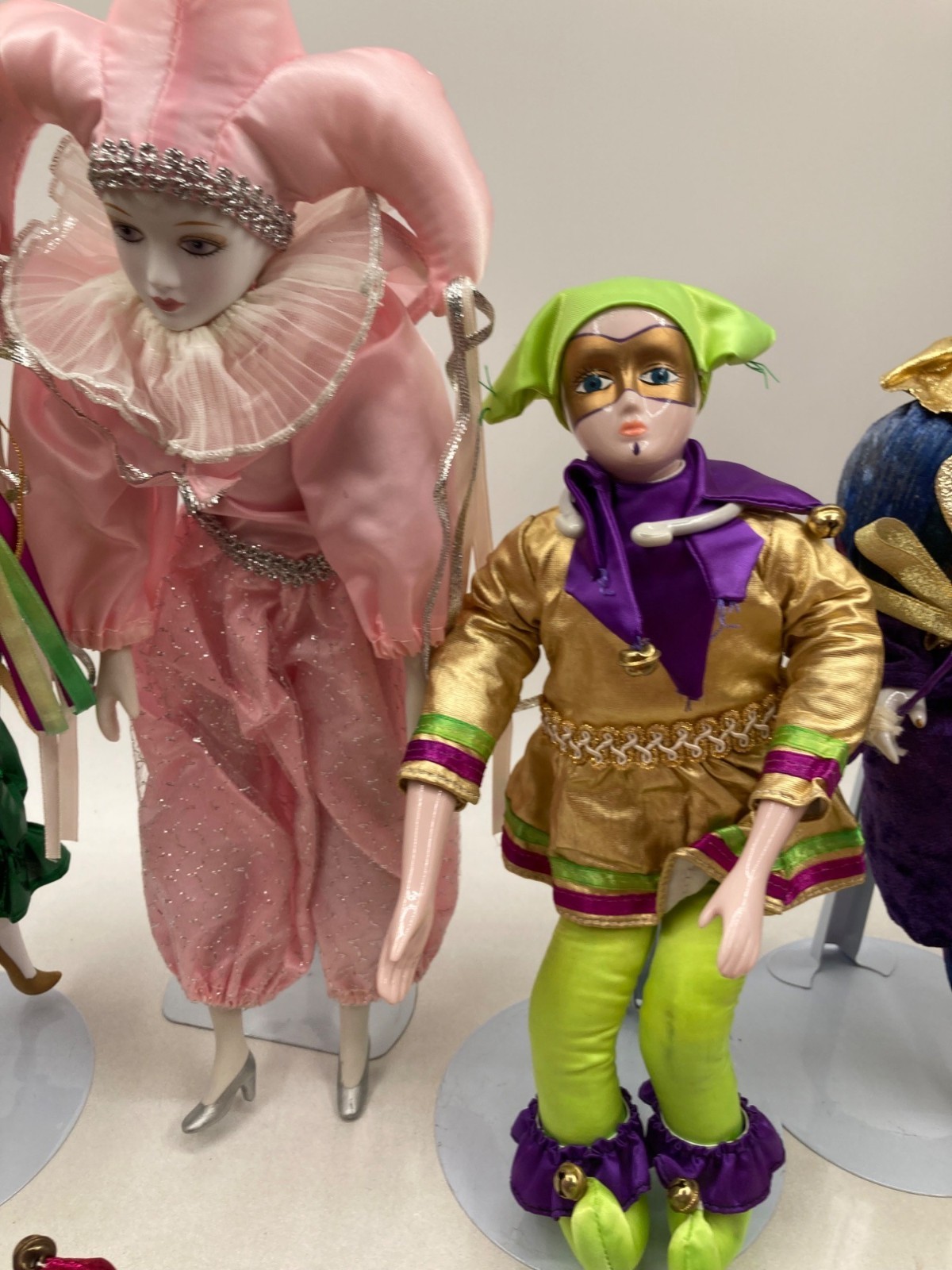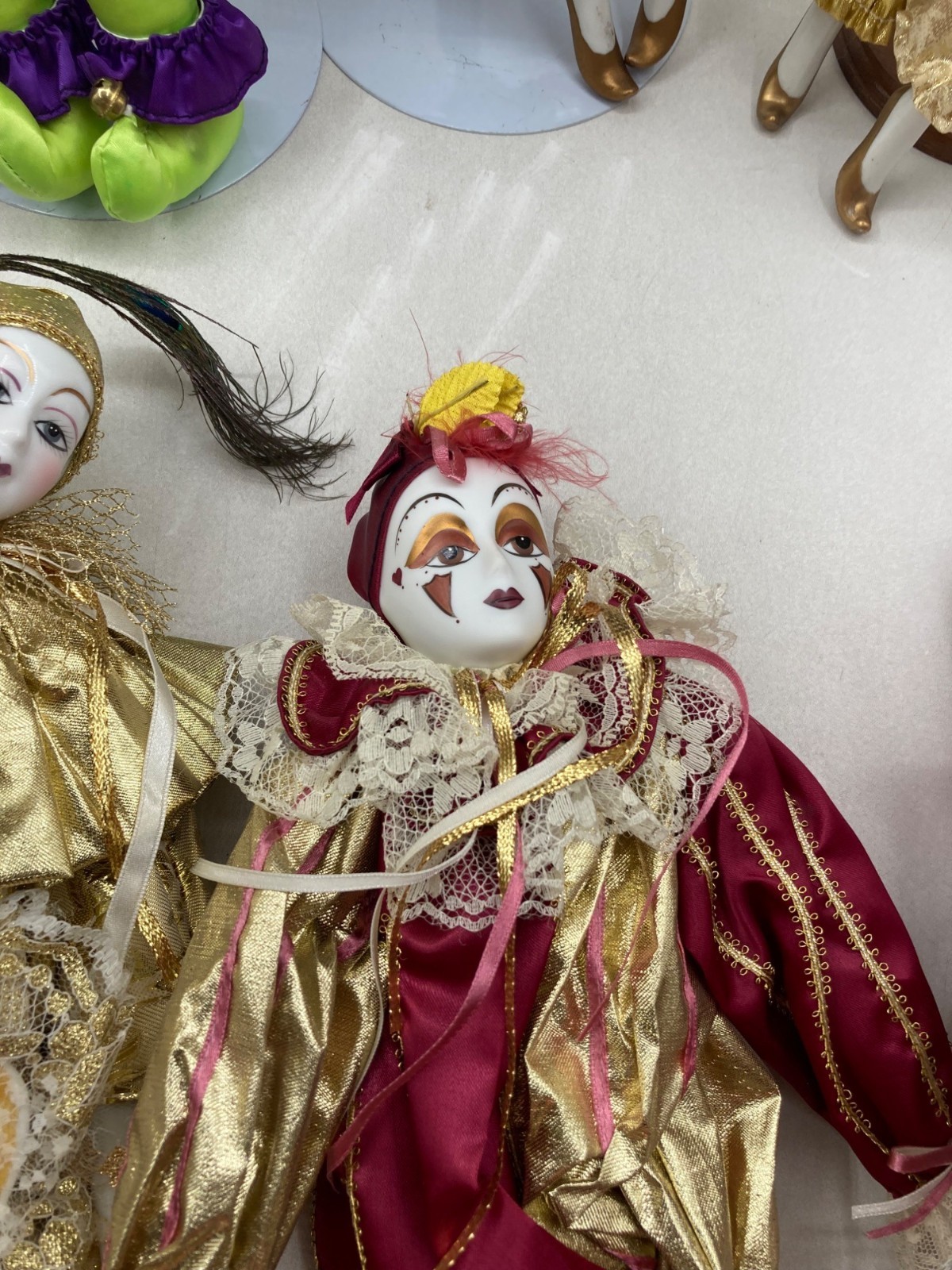 LOT OF 10 PORCELAIN COLLECTIBLE JESTER DOLLS WITH 5 STANDS