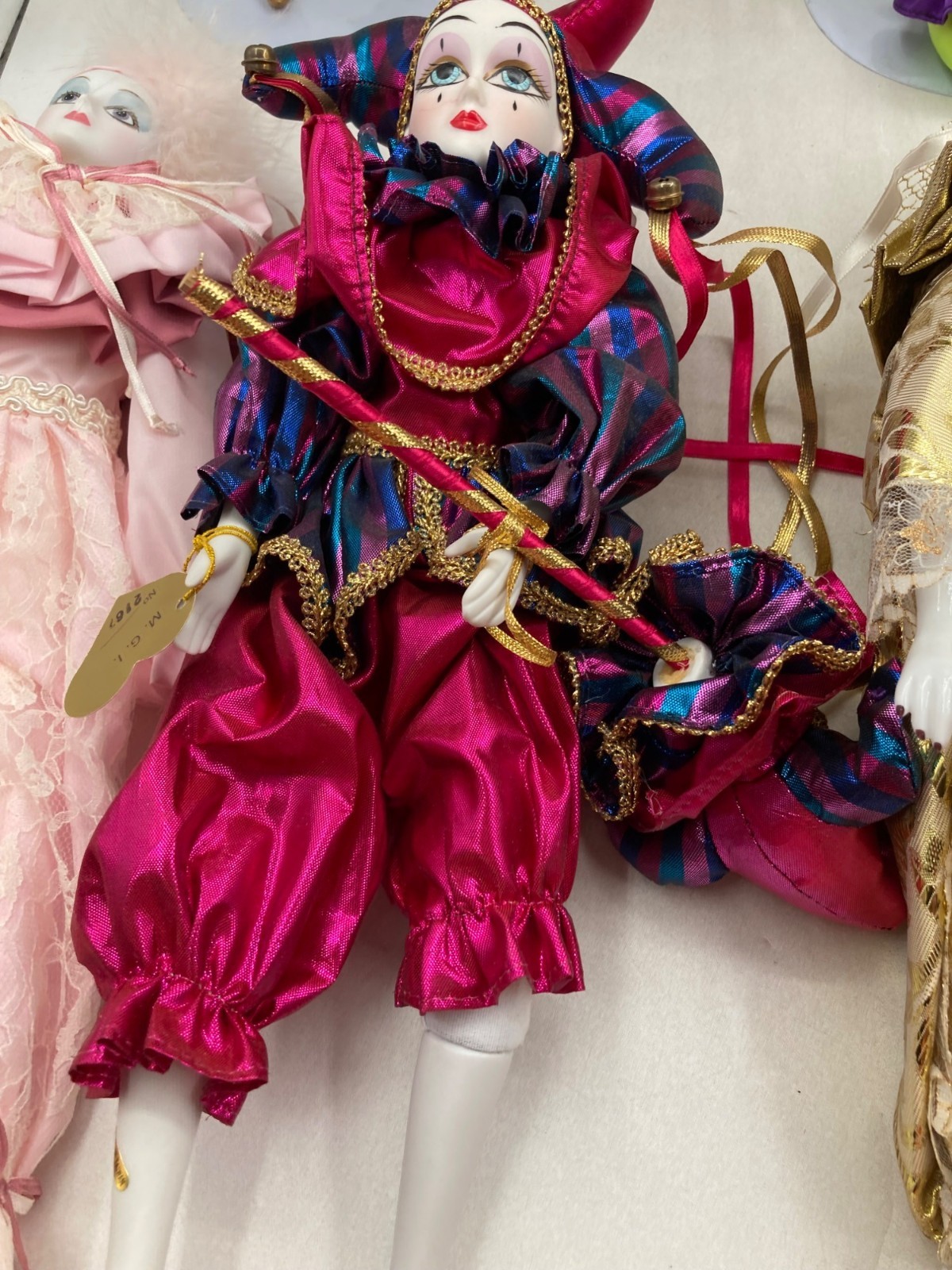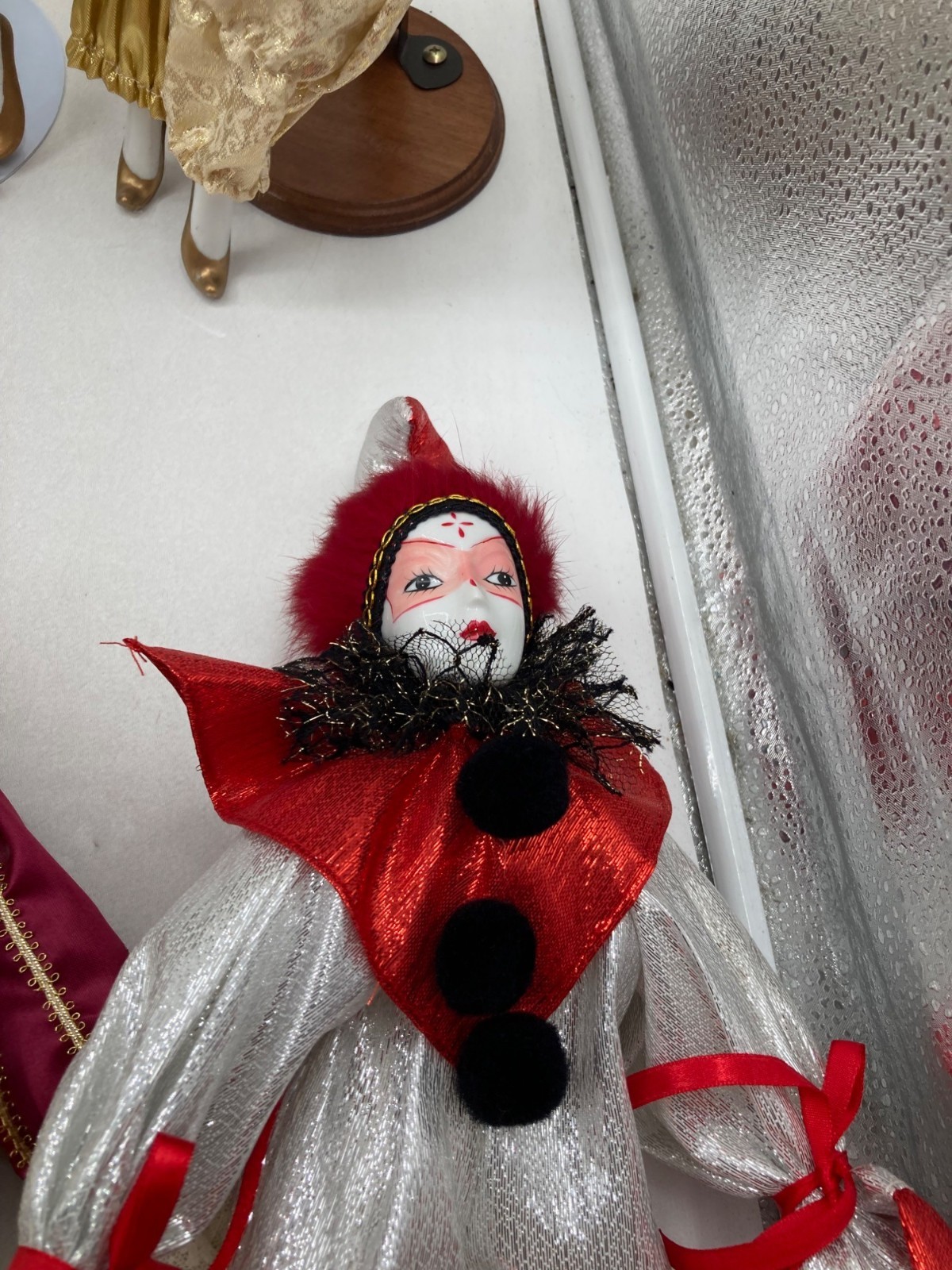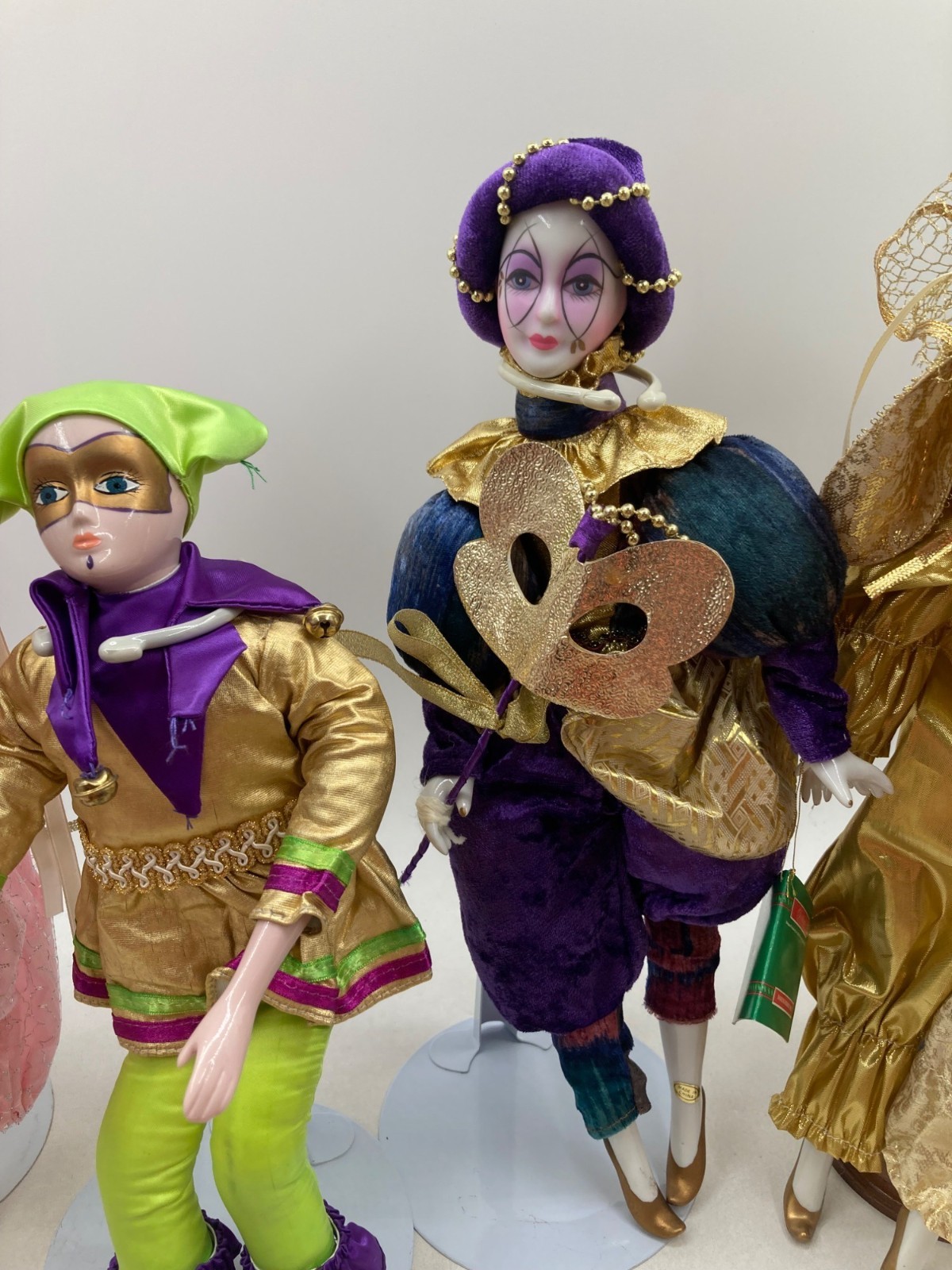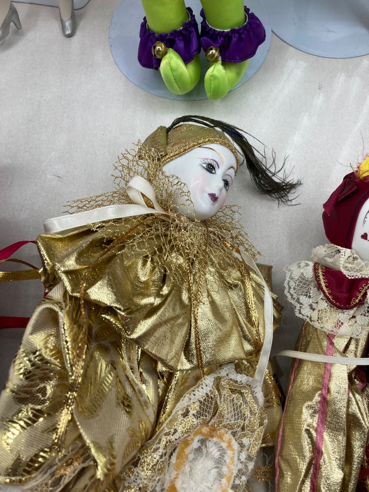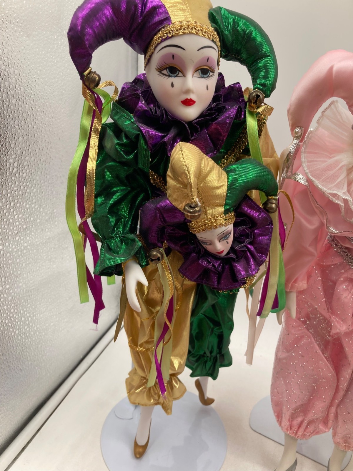 LOT OF 10 PORCELAIN COLLECTIBLE JESTER DOLLS WITH 5 STANDS