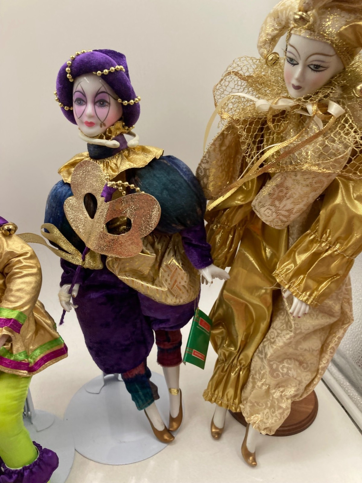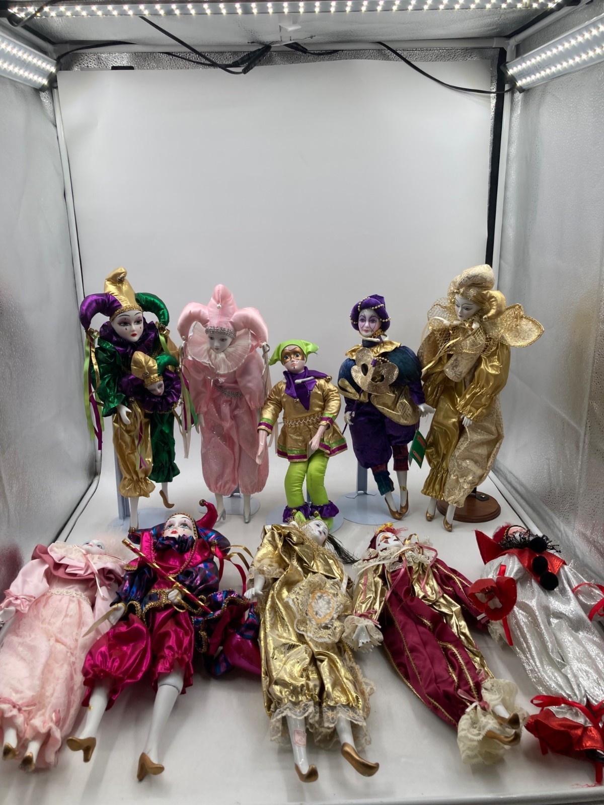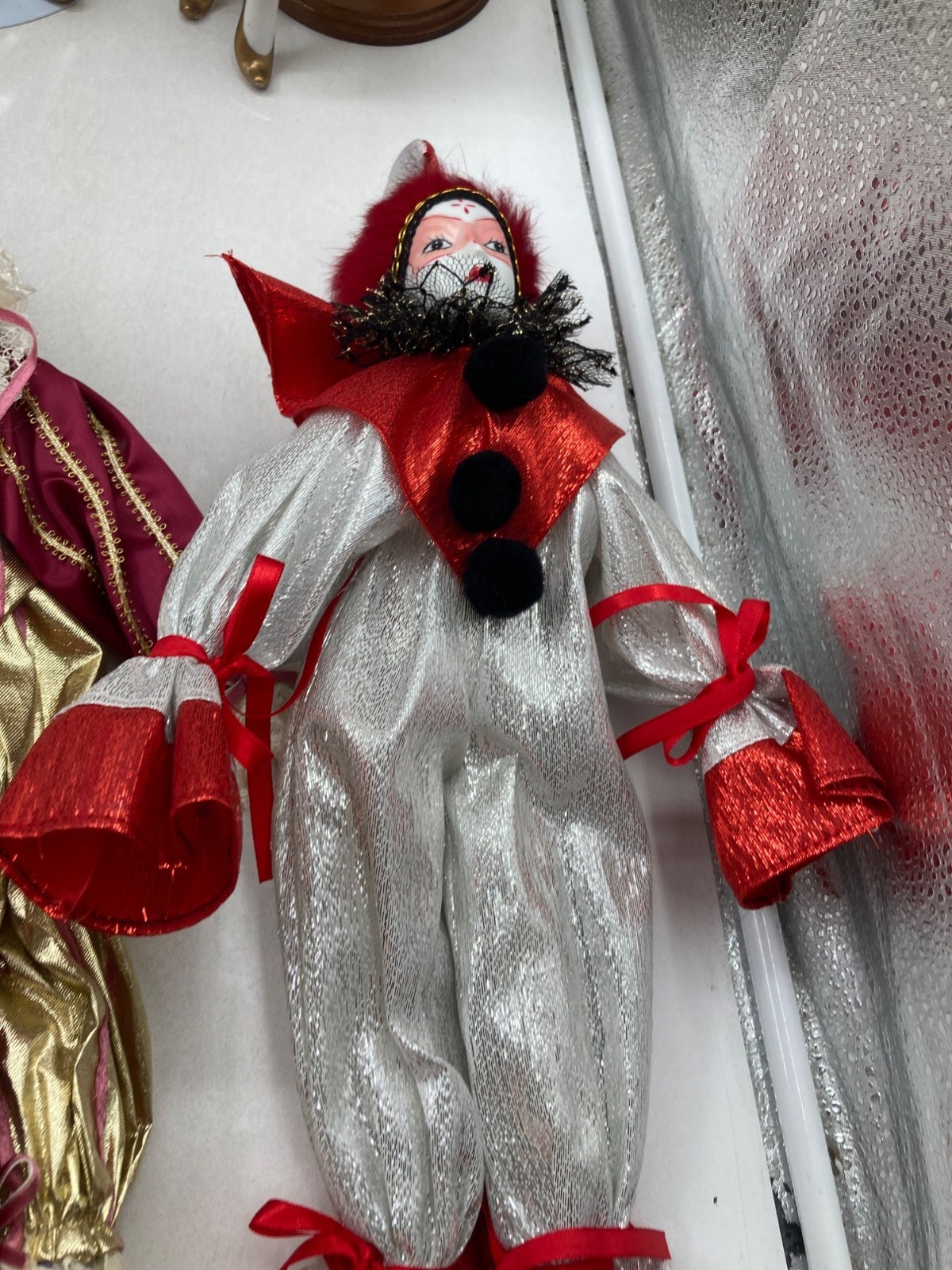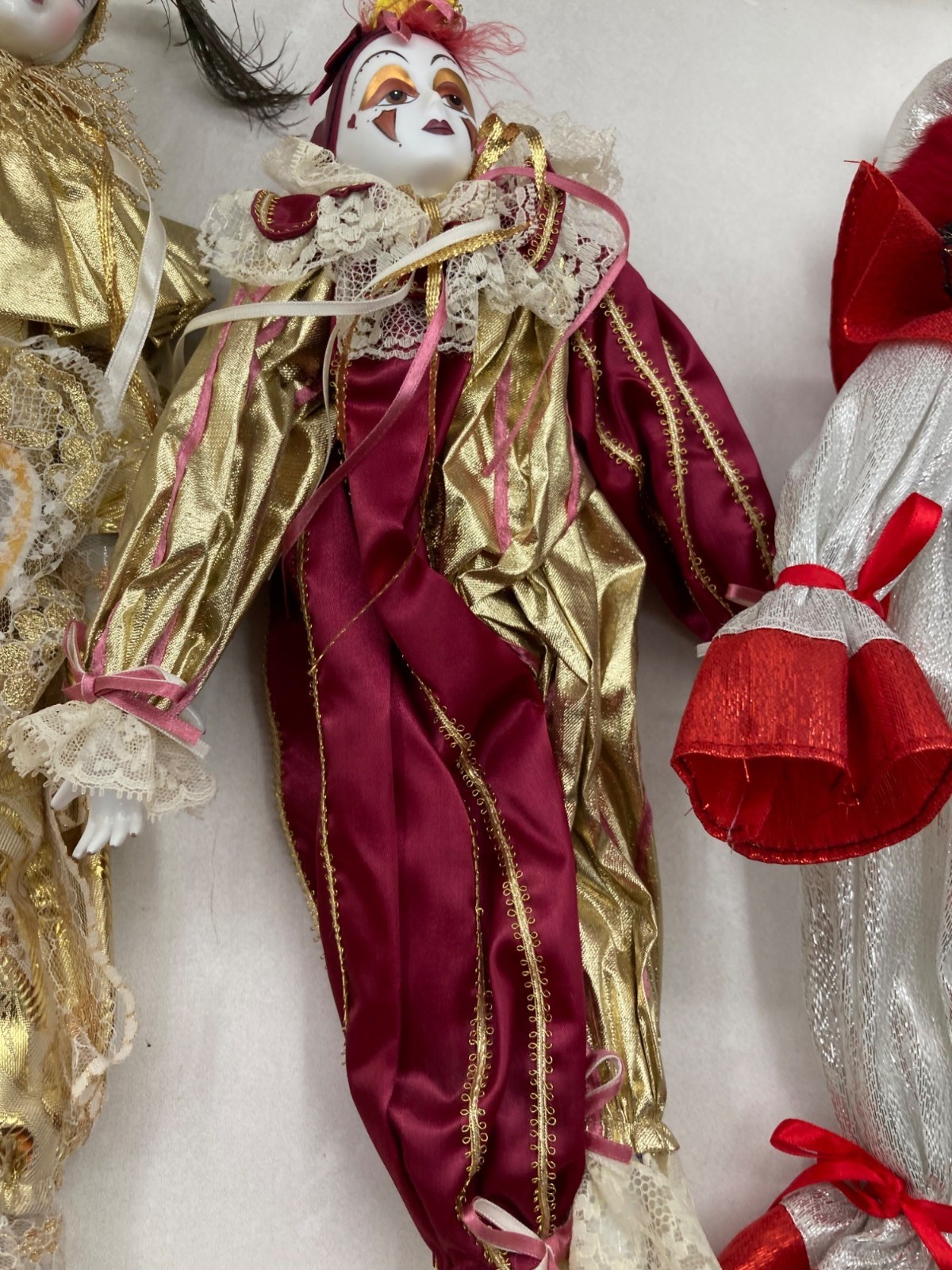 LOT OF 10 PORCELAIN COLLECTIBLE JESTER DOLLS WITH 5 STANDS