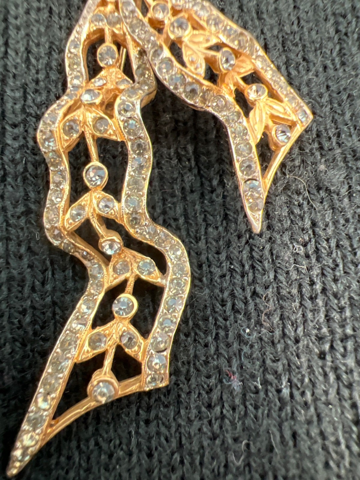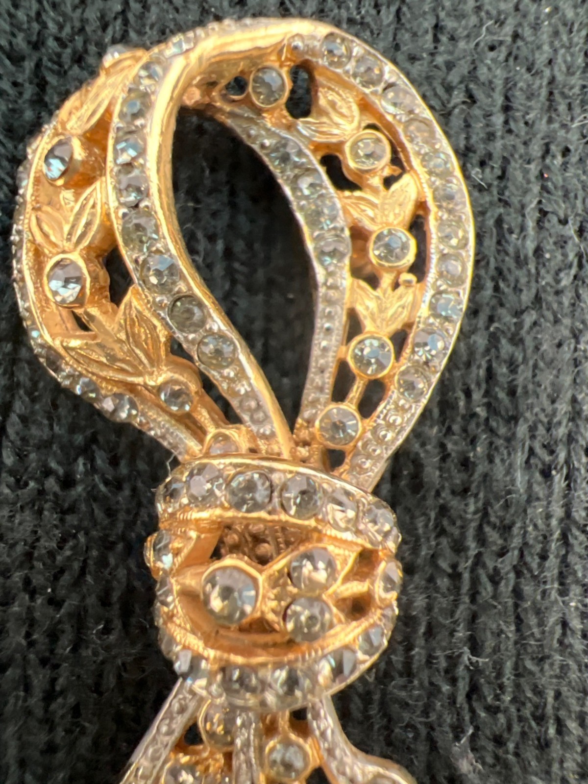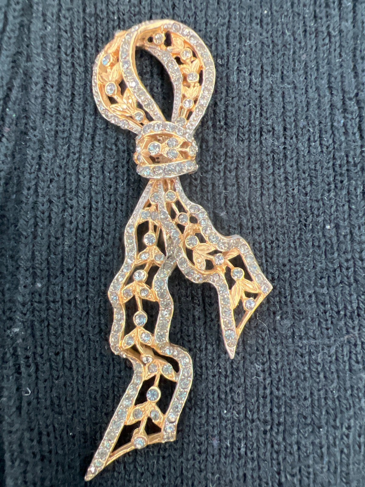 Lot of 2 Gold-Tone Brooch Pins: Jeweled Ribbon & Jeweled Chandelier