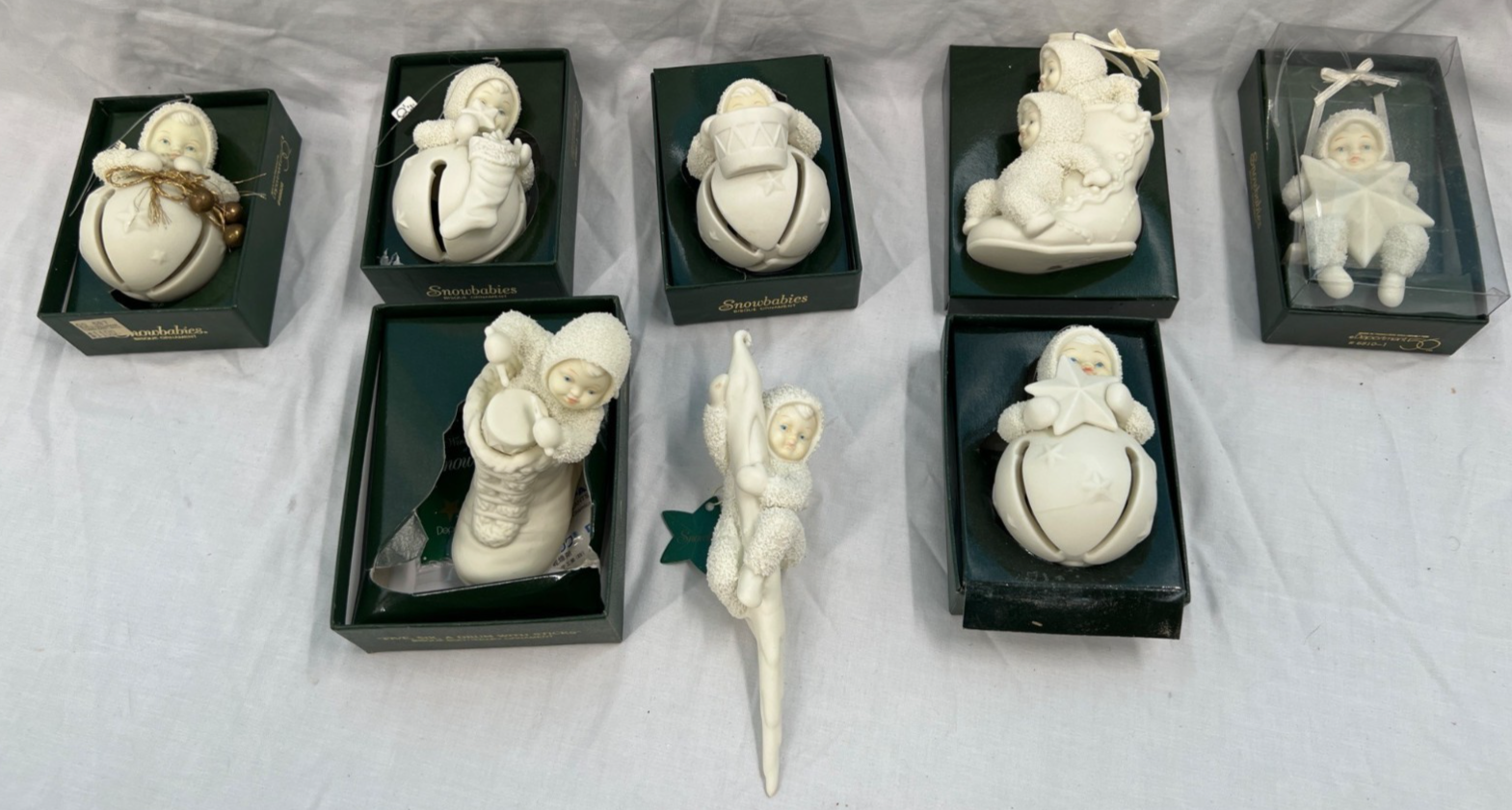 Lot of 8 DEPT 56 Snowbabies Bisque Christmas Ornaments in boxes