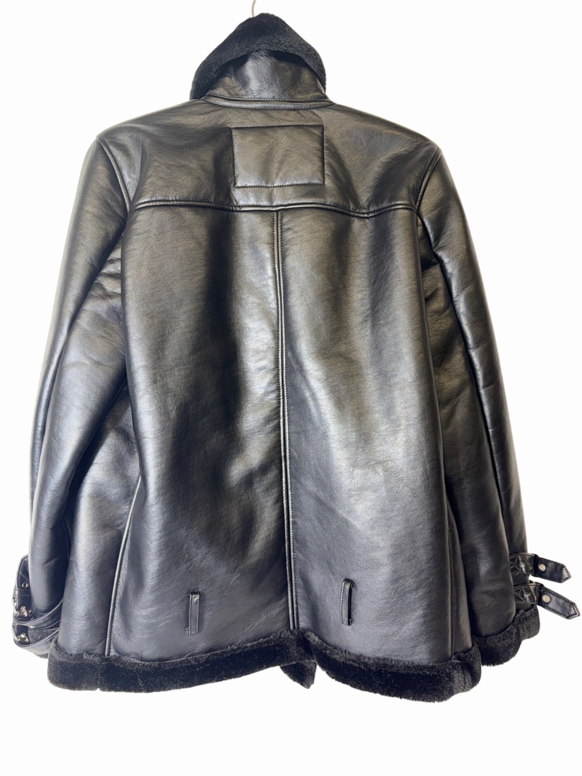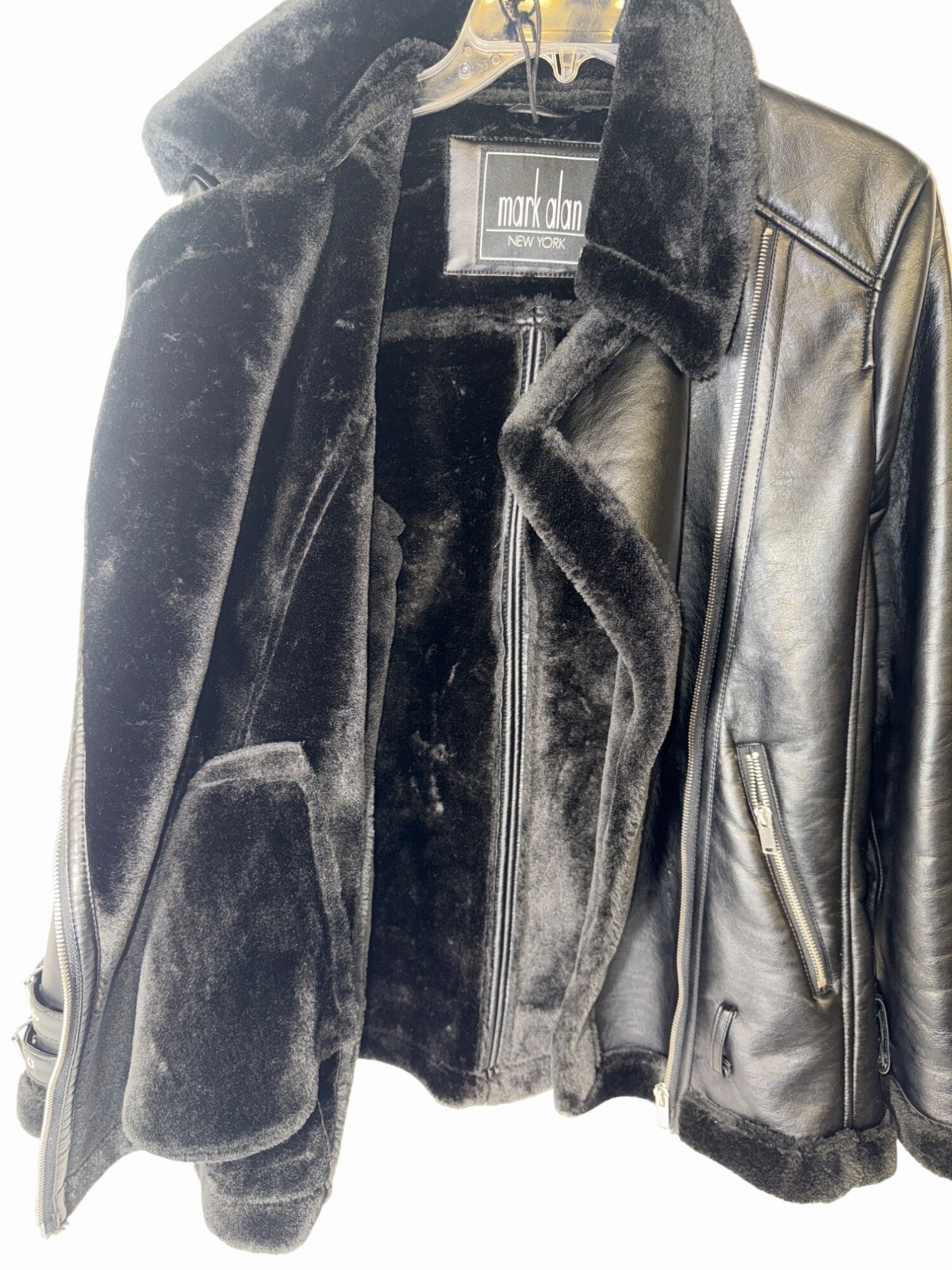 Mark Alan Black Faux Leather Shearling Lined Biker Jacket Buckle Detail Size L