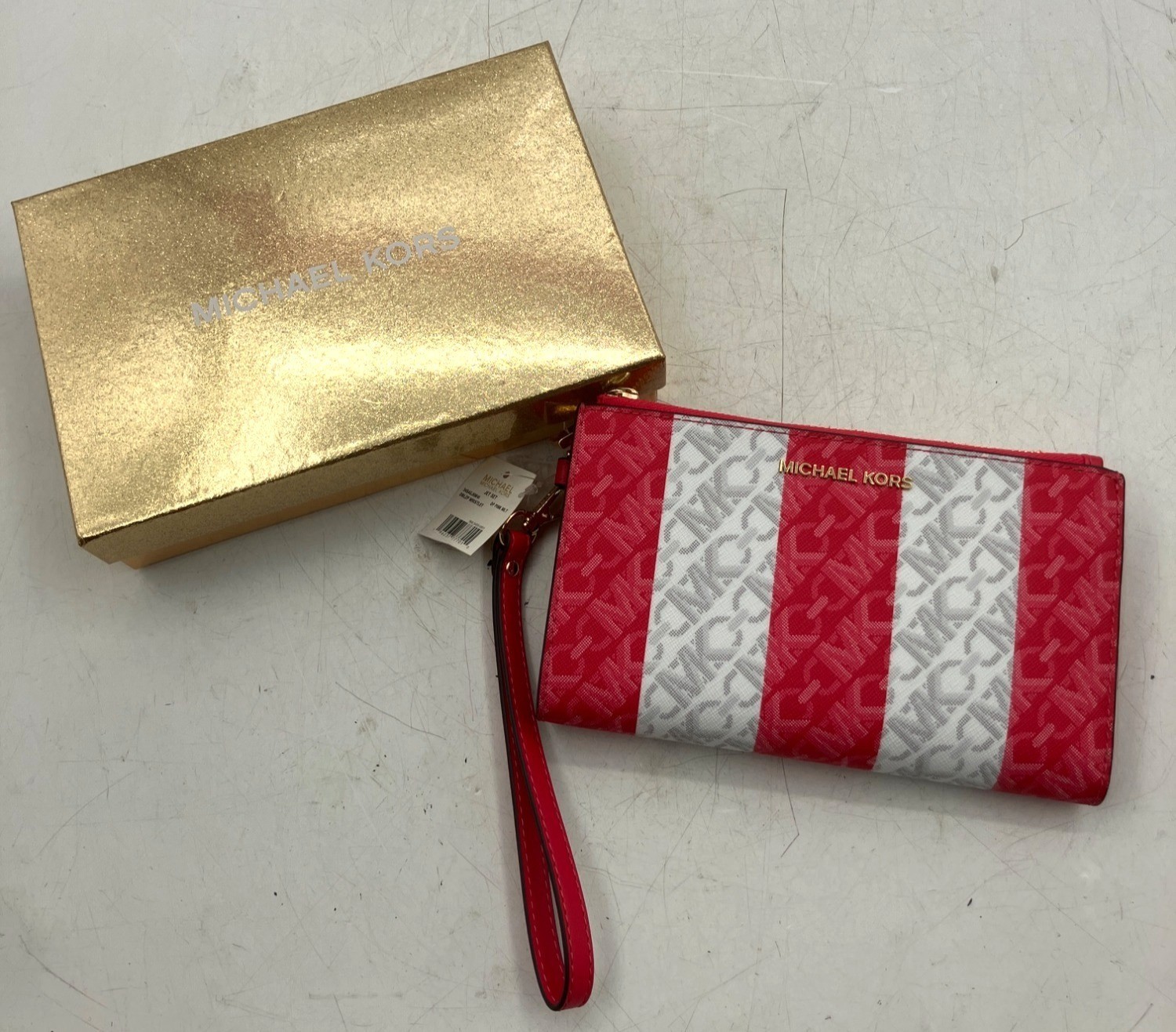 Michael Kors Jet Set Logo Double Zip Wristlet Red/White Stripe In Box- NWT!