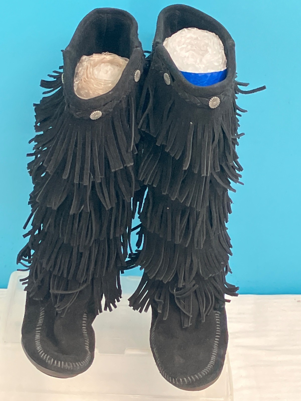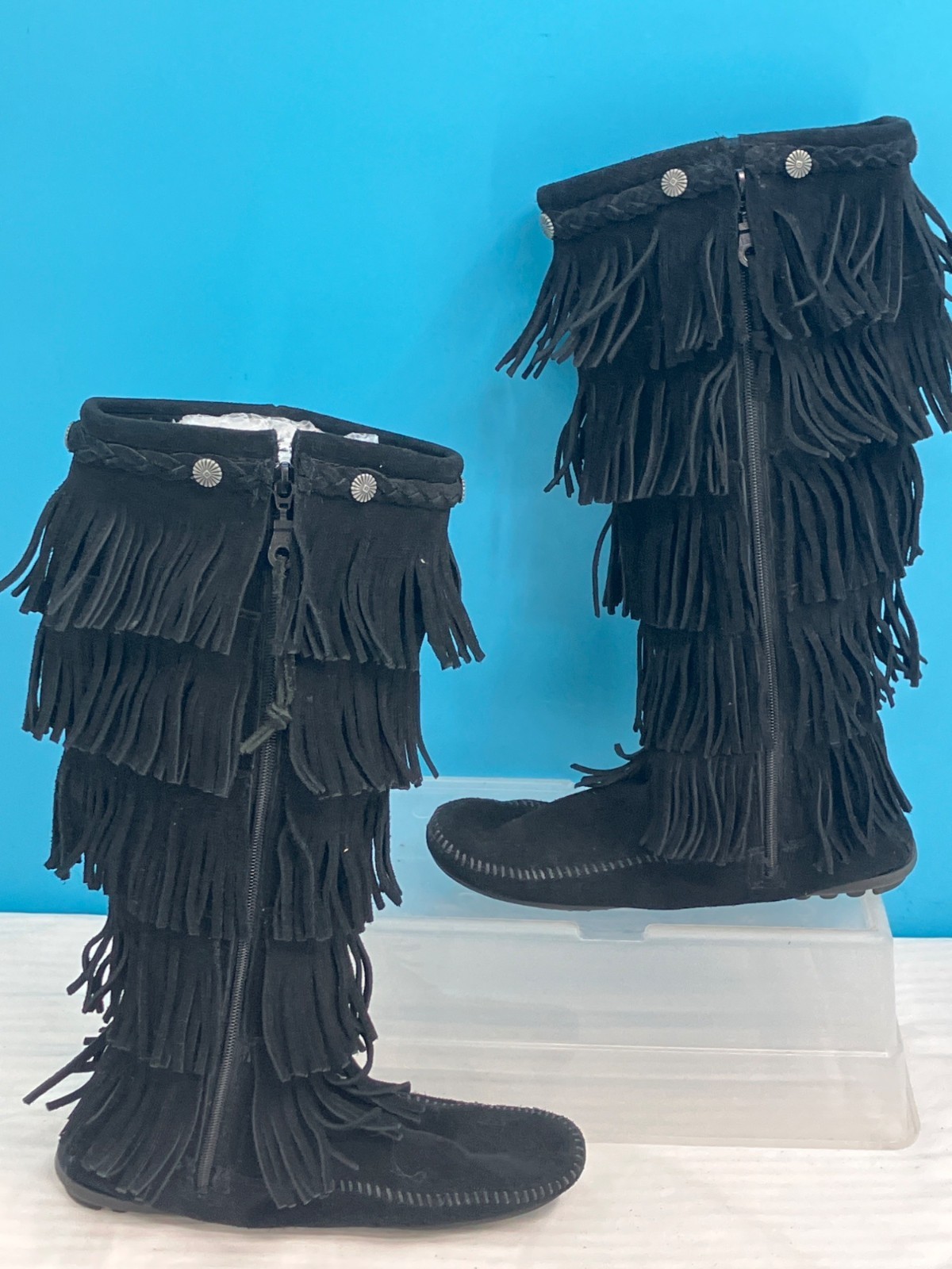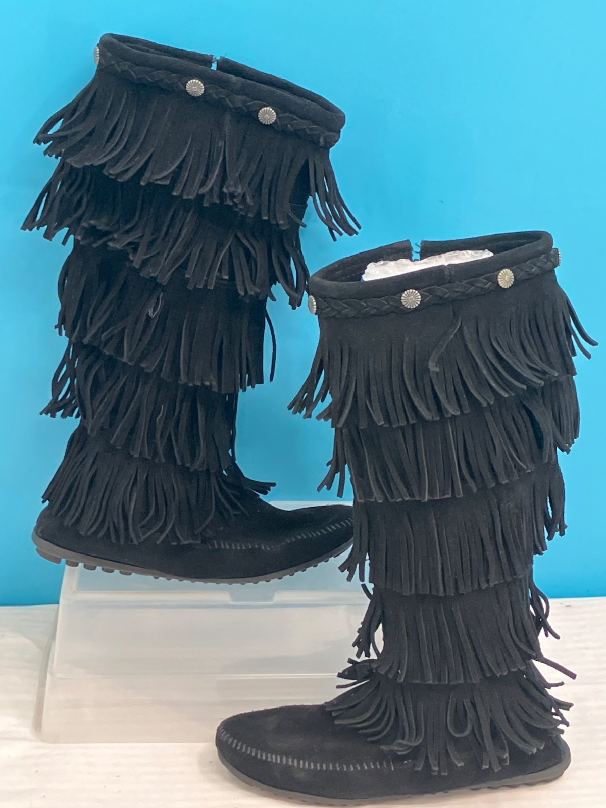 Minnetonka 1659 Black 5-Layer Fringe Moccasin Boots (size 8)
