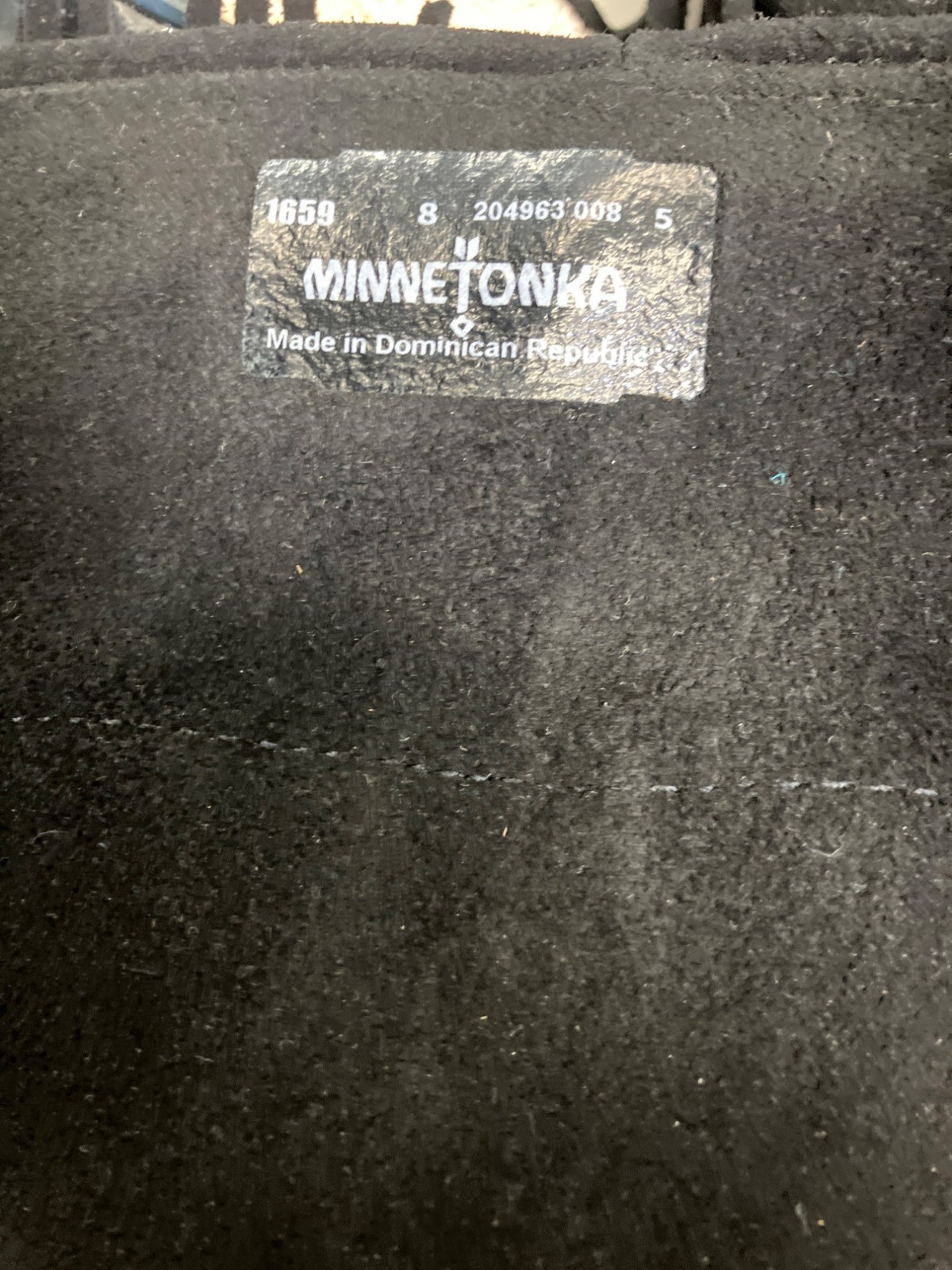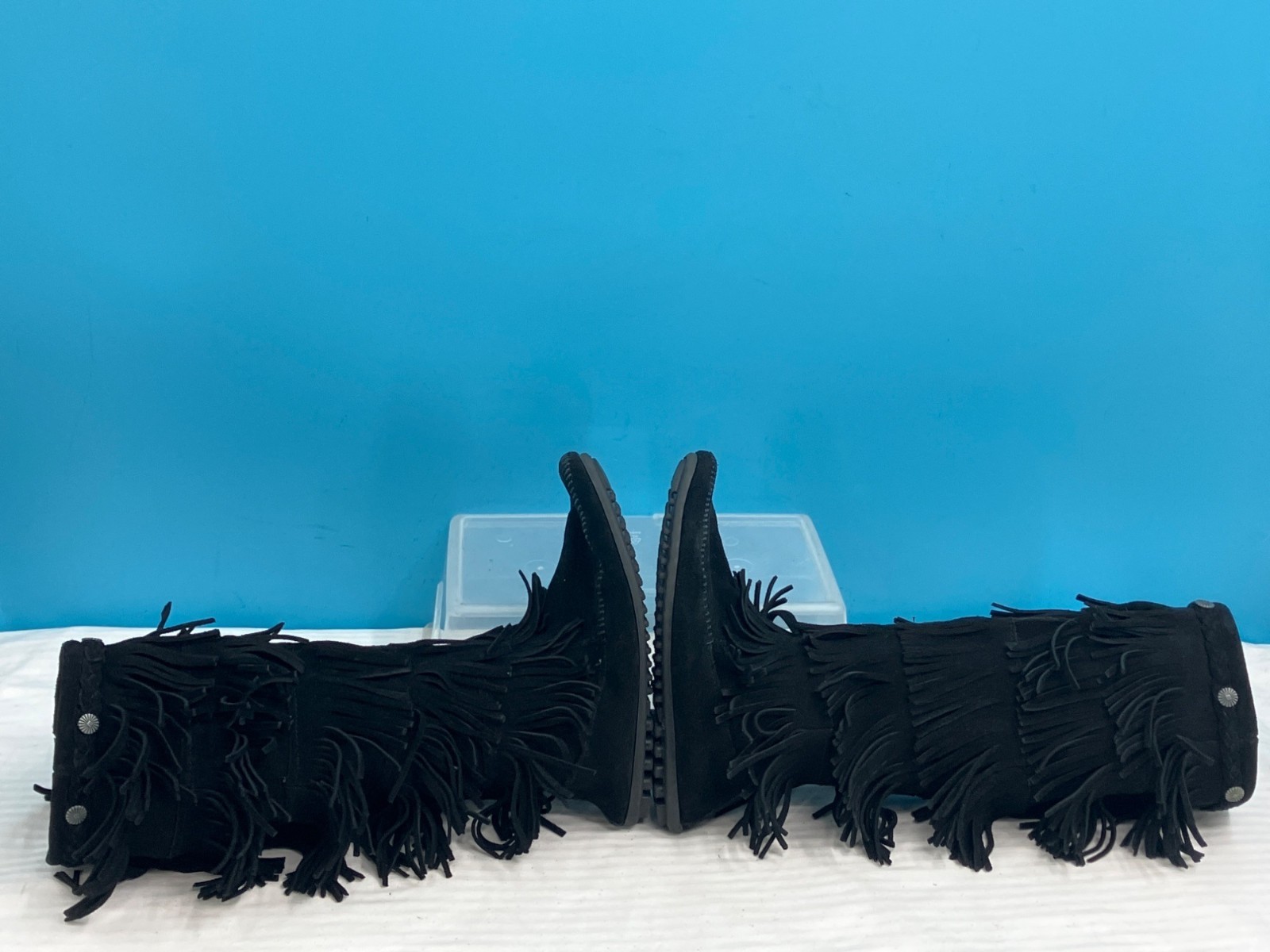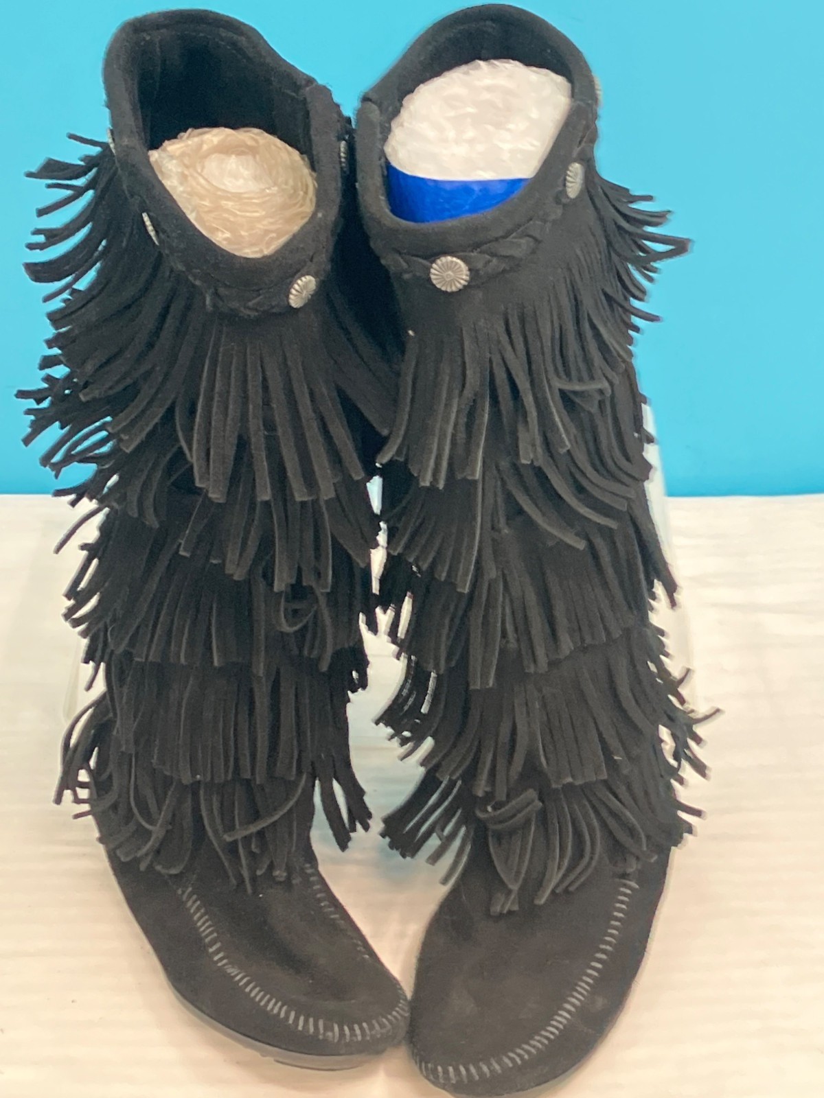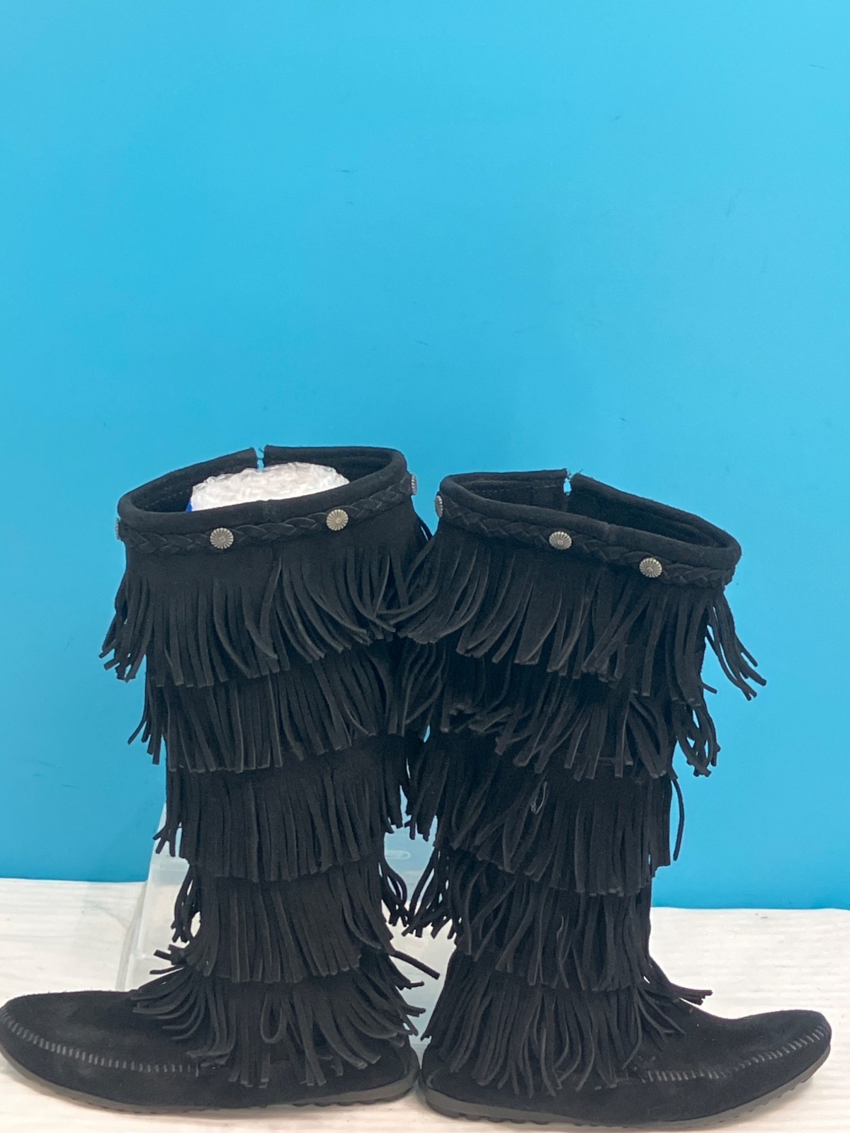Minnetonka 1659 Black 5-Layer Fringe Moccasin Boots (size 8)