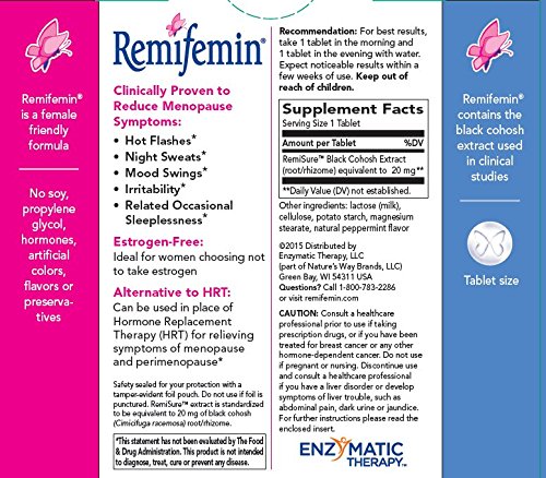 - Remifemin menopause relief* Clinically Proven to Reduce Menopause Symptoms: Hot Flashes*, Night Sweats*, Mood Swings*, Irritability*, Related Occasional Sleeplessness*, Estrogen-Free, so it is Ideal for women choosing not to take estrogen -- alternative to HRT: can be used in place of Hormone Replacement Therapy (HRT) for relieving symptoms of menopause and perimenopause* RemiSure extract is standardizedto be equivalent to 20 mg of black cohosh (Cimicifuga racemosa) root/rhizome