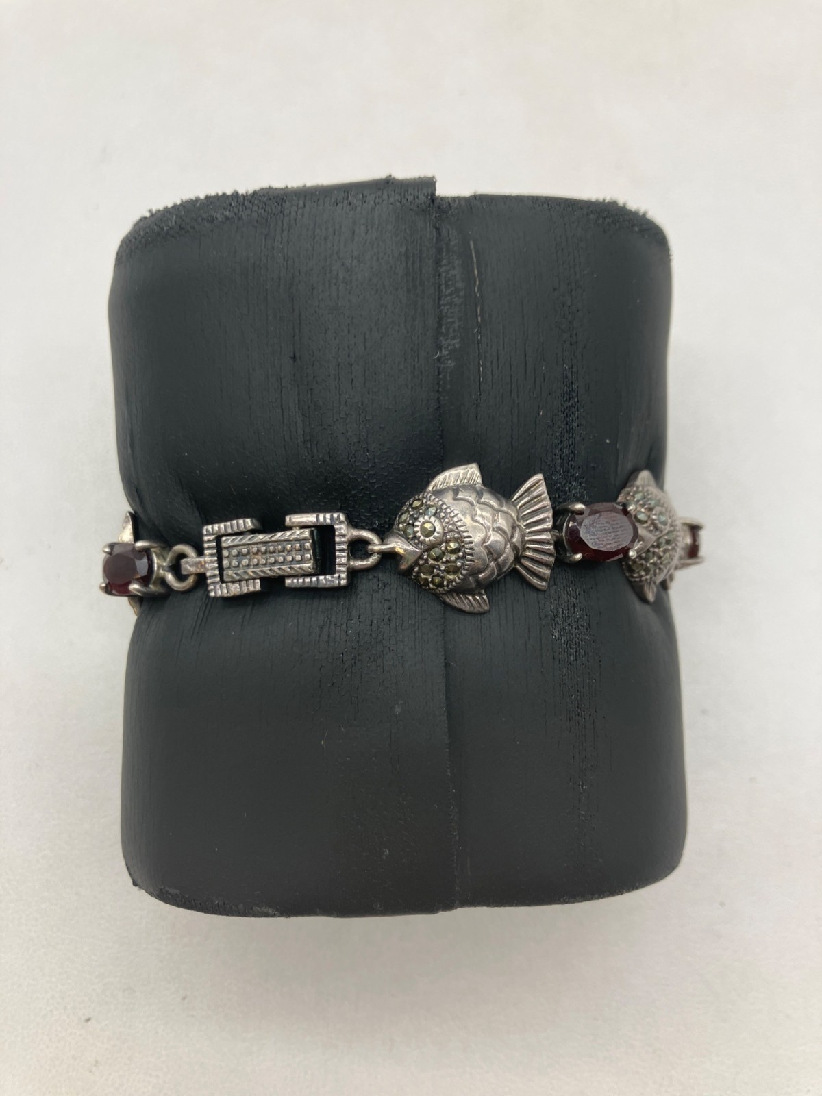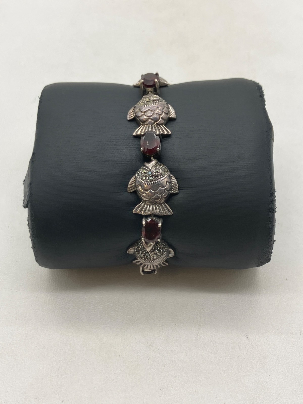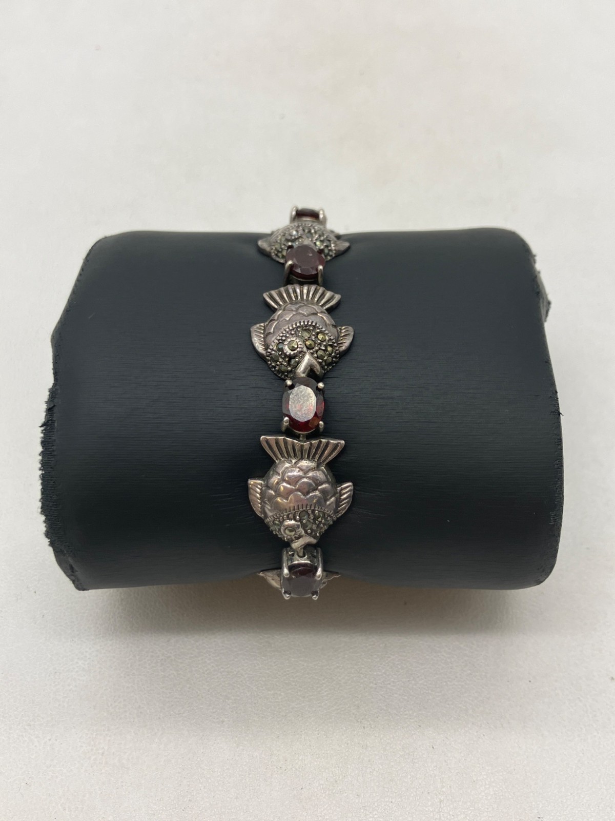Sterling Silver Garnet Fish Bracelet 7in - 26.69g
