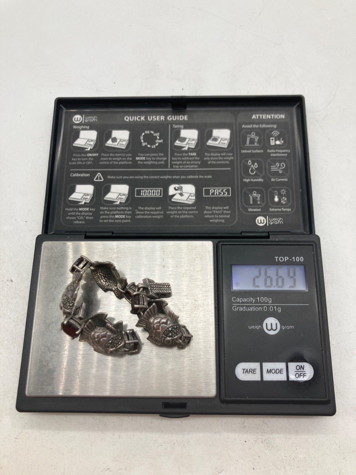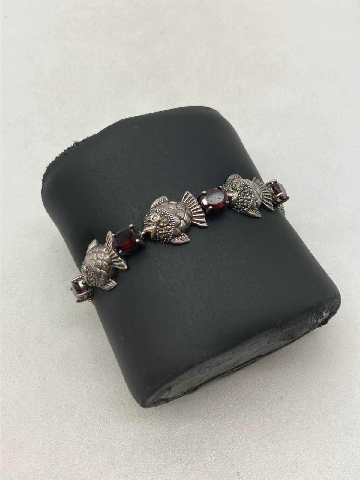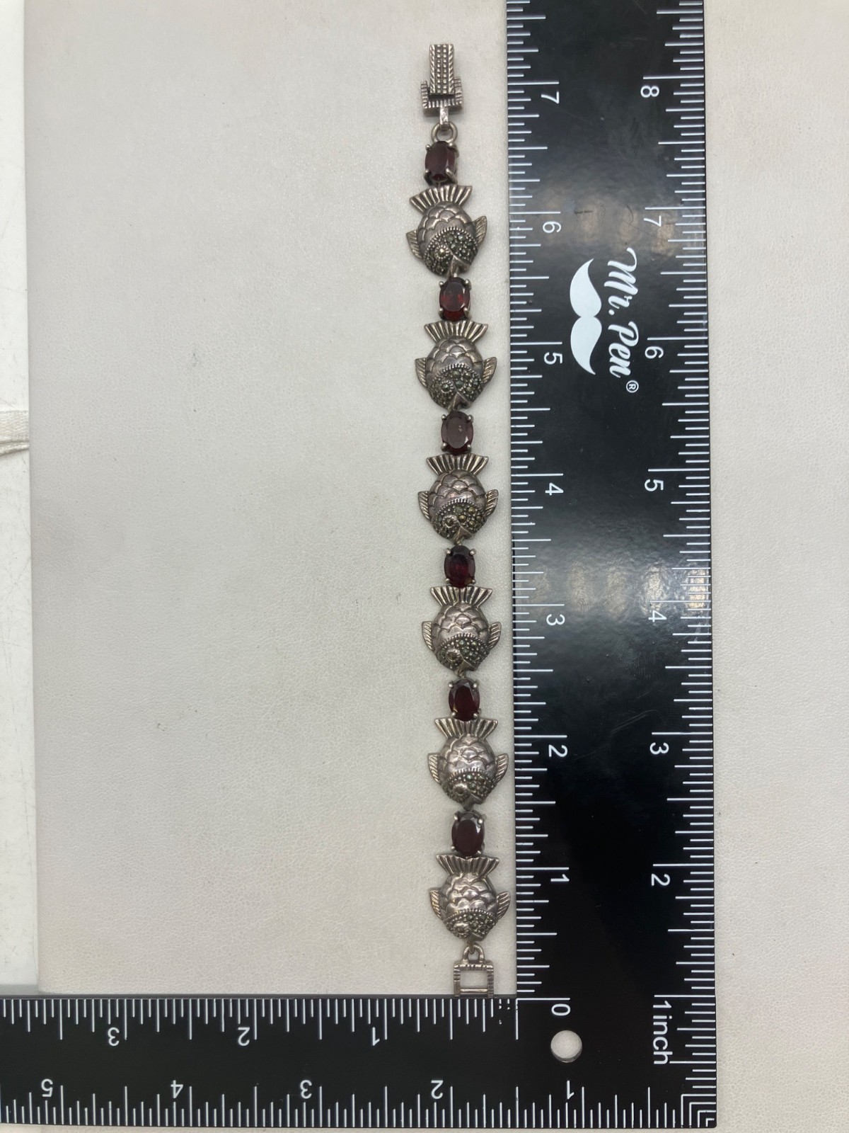 Sterling Silver Garnet Fish Bracelet 7in - 26.69g