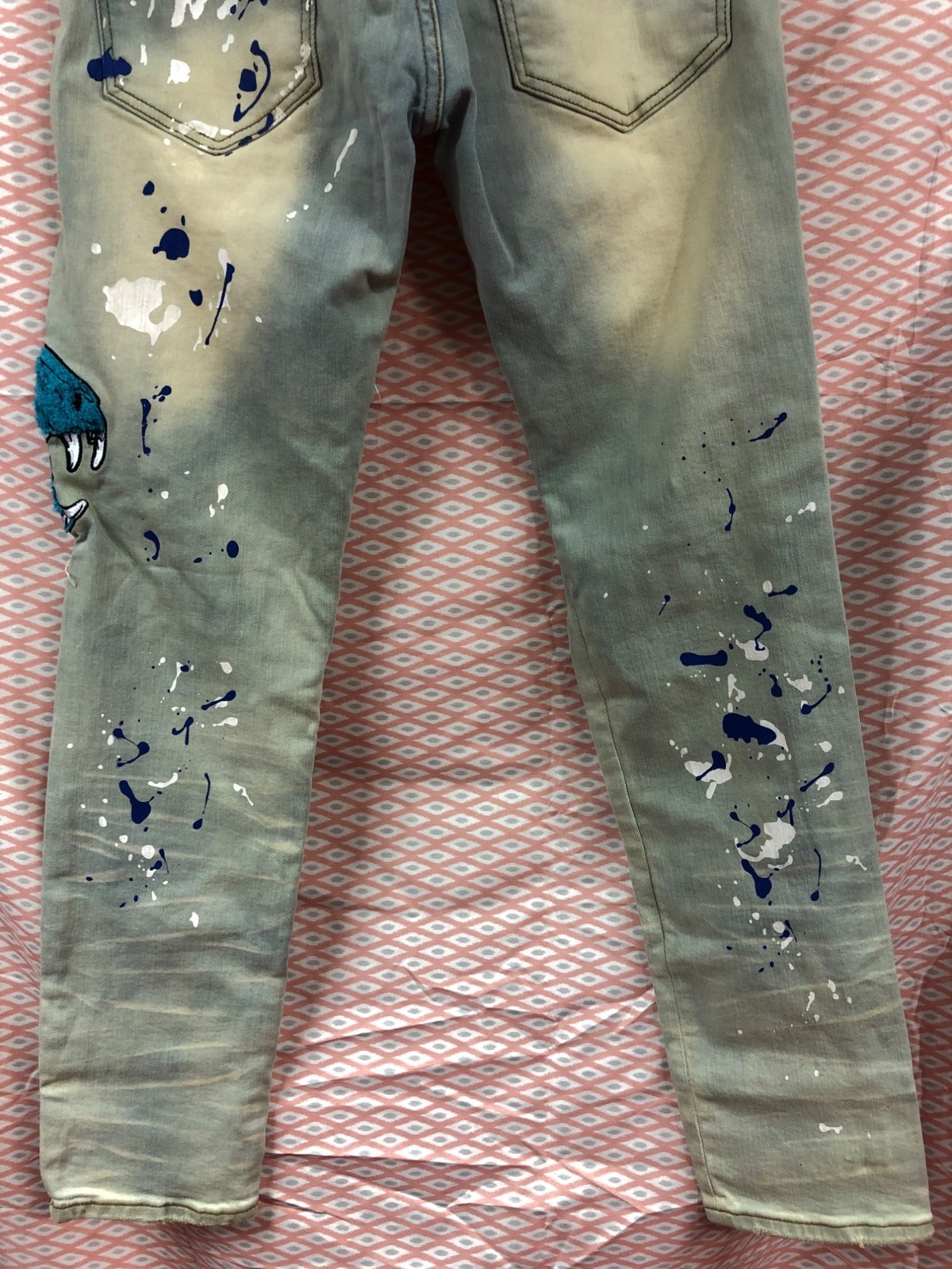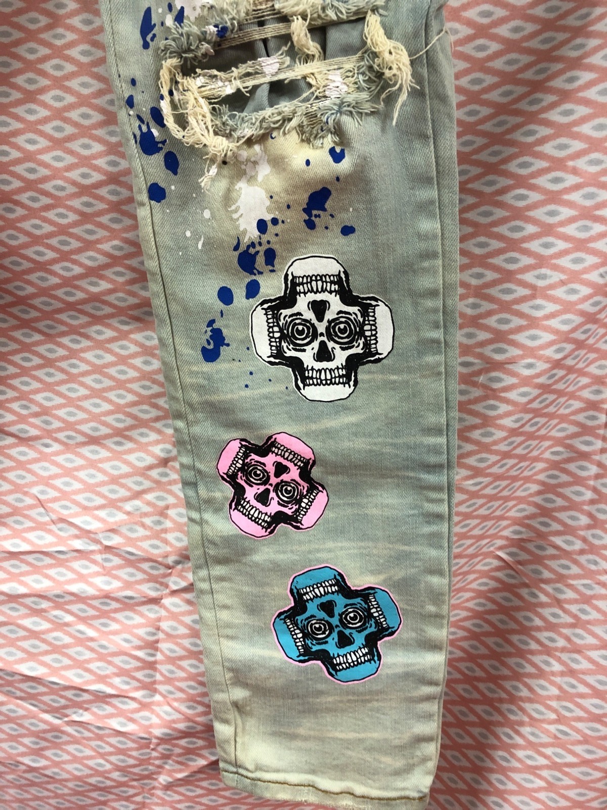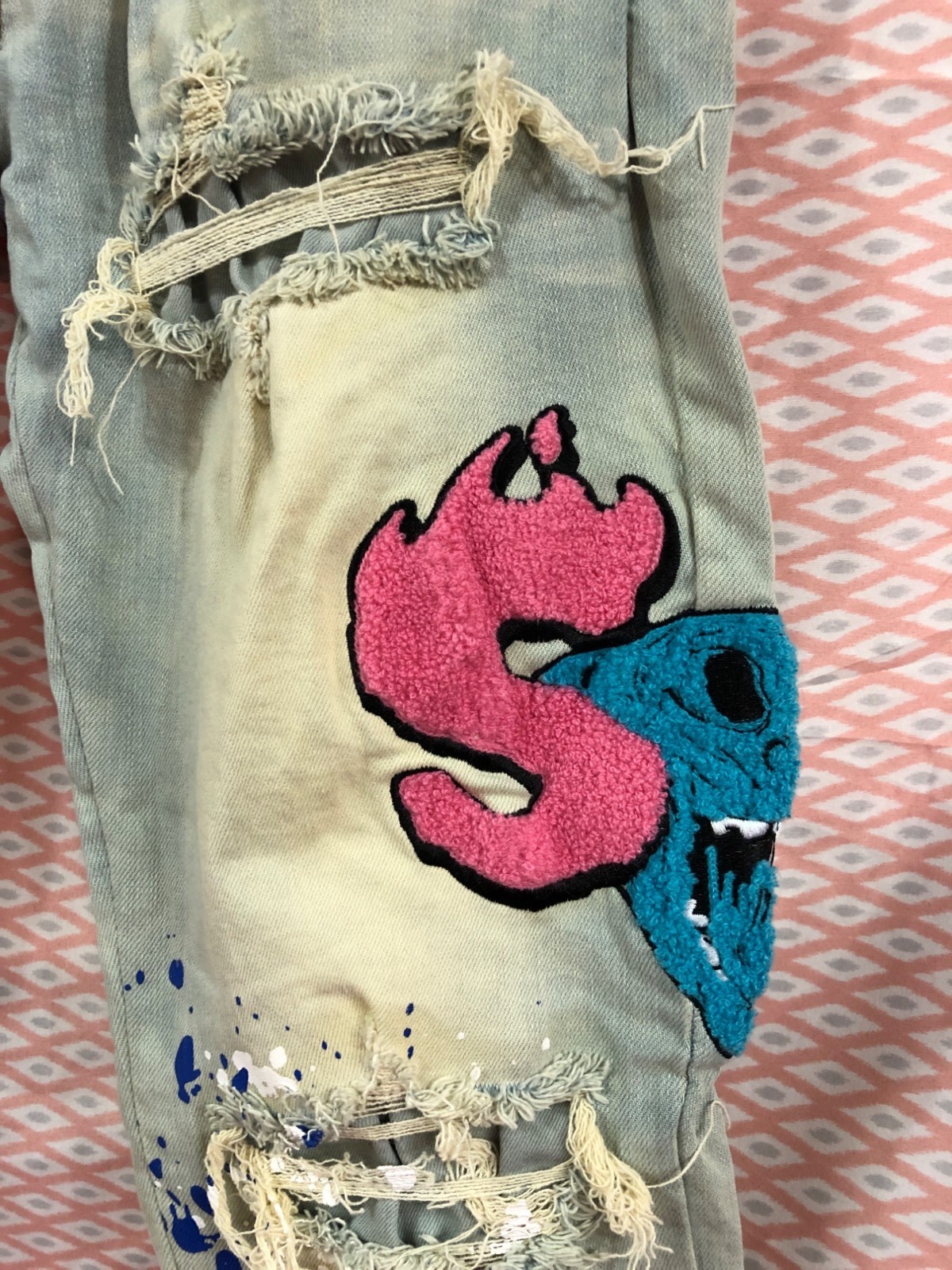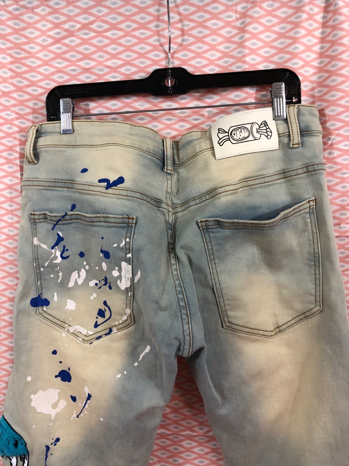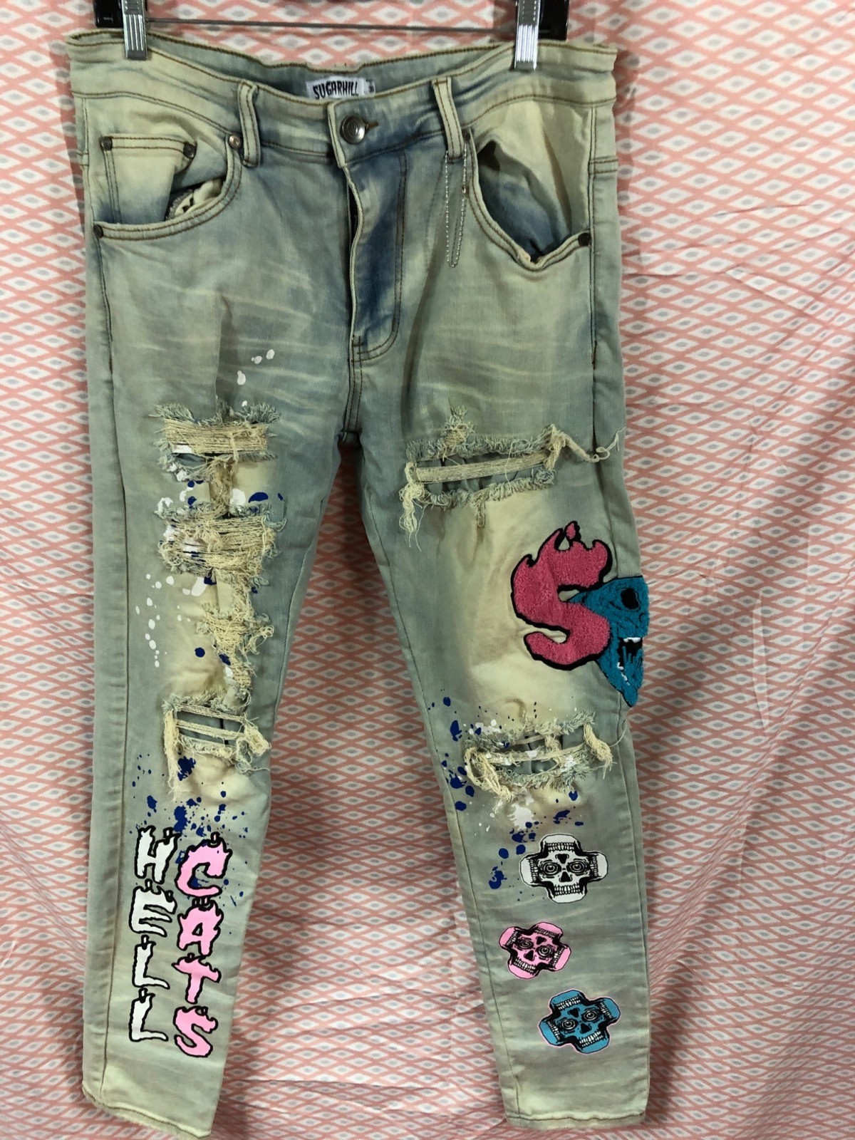 Sugarhill Mens Distressed Graphic Jeans With Patches Size 36 Inseam 31”