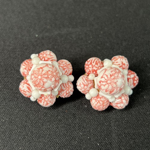 Vintage Celluloid Carved Handmade Clip On Cluster Earrings Hong Kong Estate