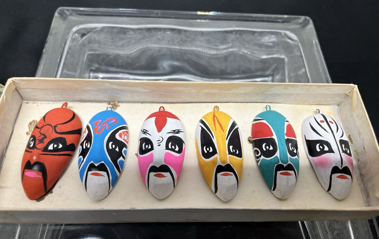 Vintage Set of 6 Asian Art Miniature Hand Painted Opera Masks In Box