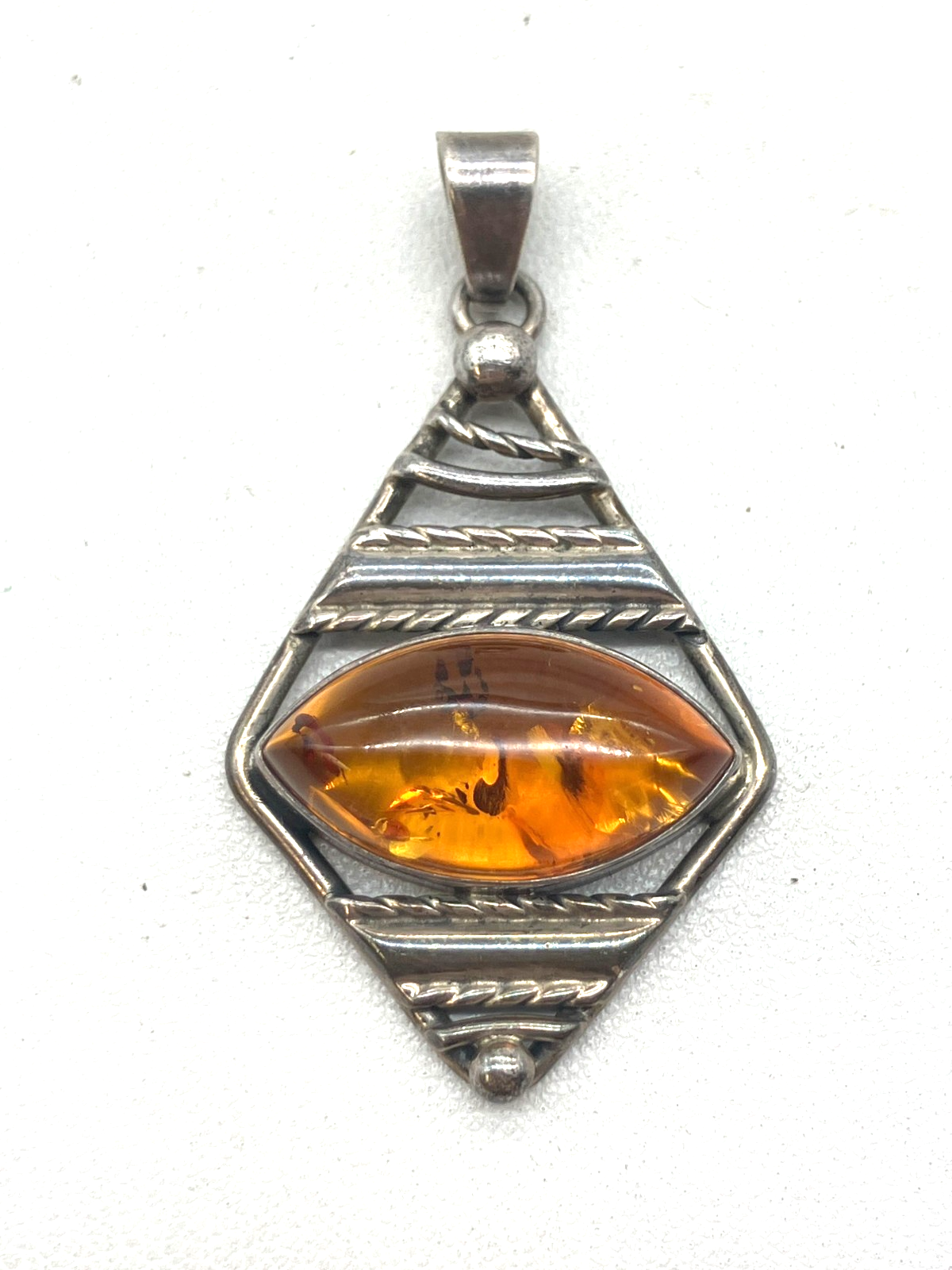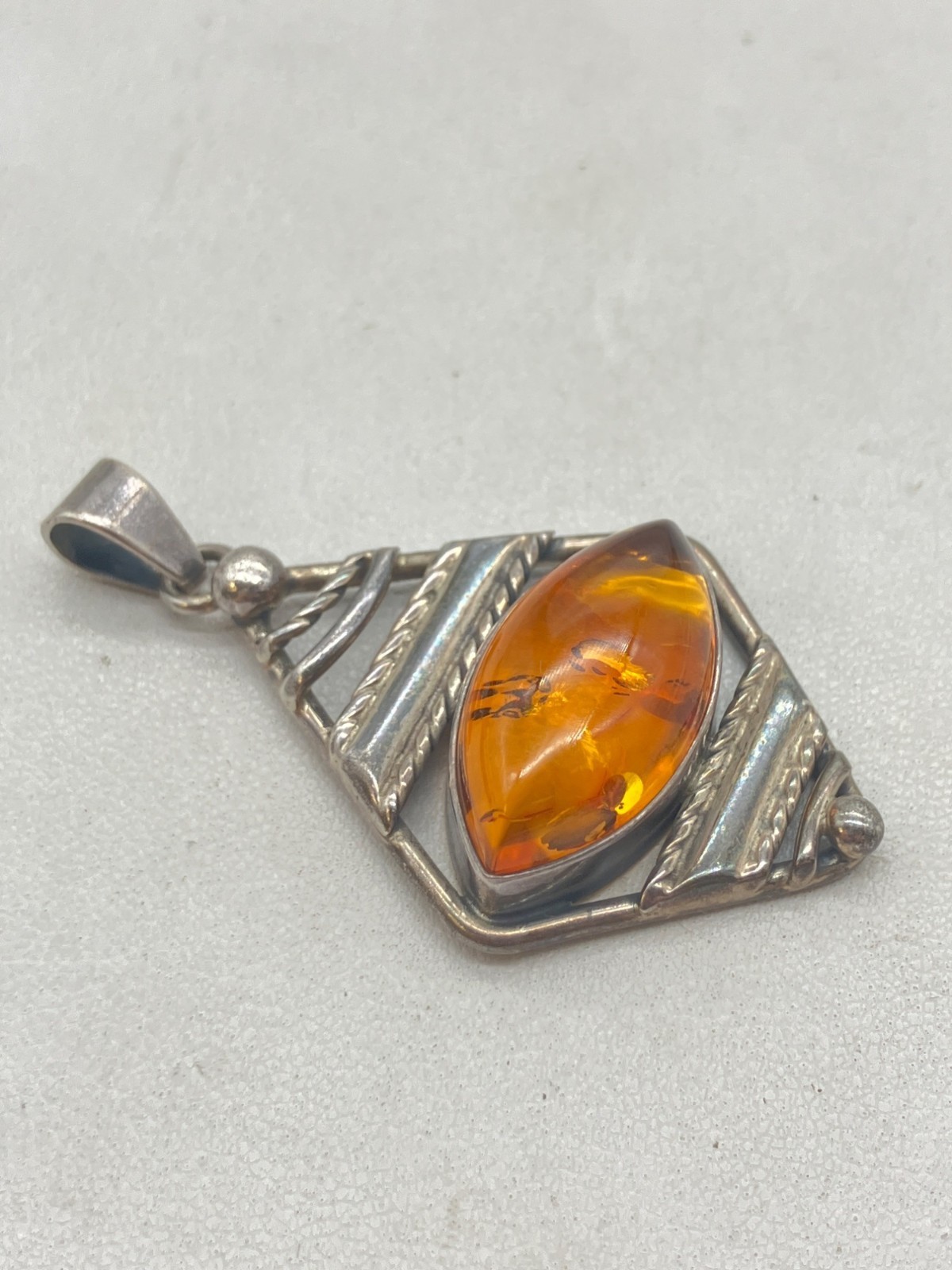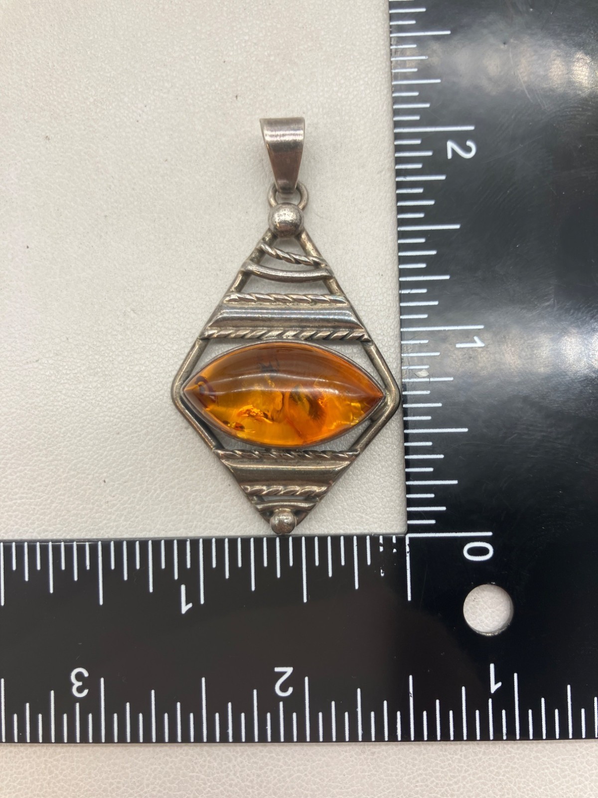 Vintage Sterling Silver Pendant With Marquise Amber Gemstone - 9.8g