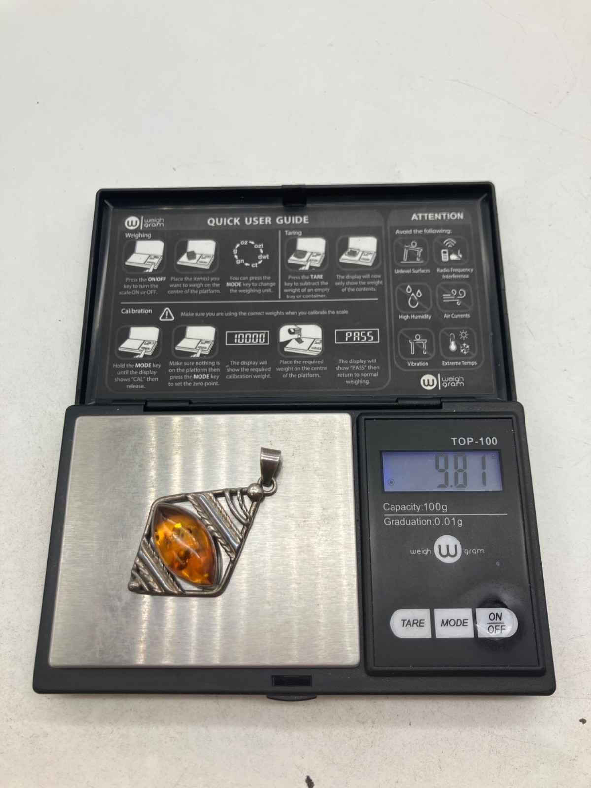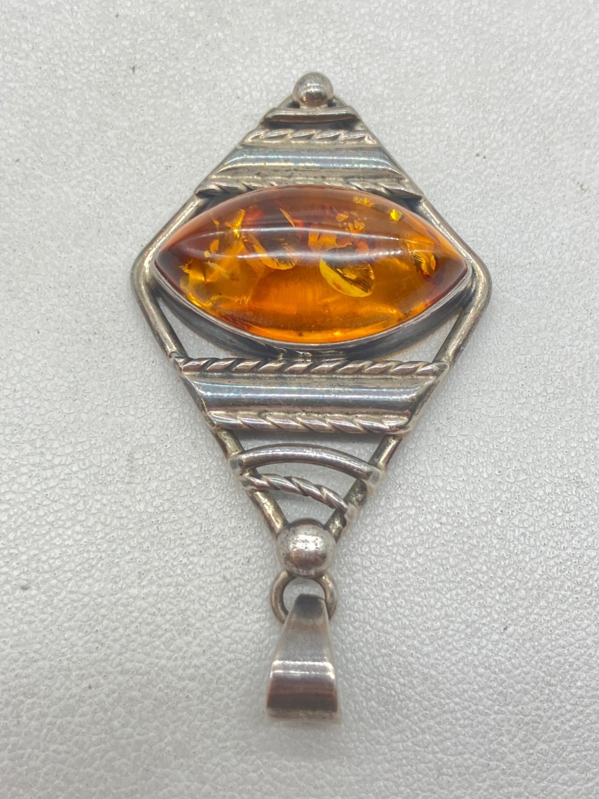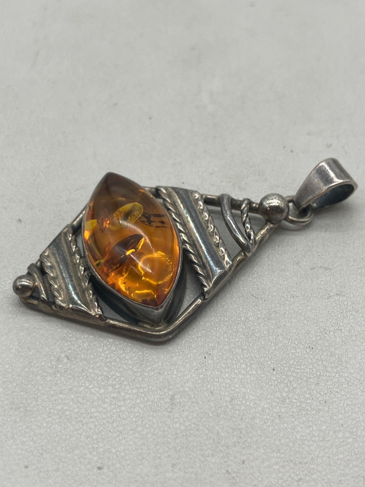 Vintage Sterling Silver Pendant With Marquise Amber Gemstone - 9.8g