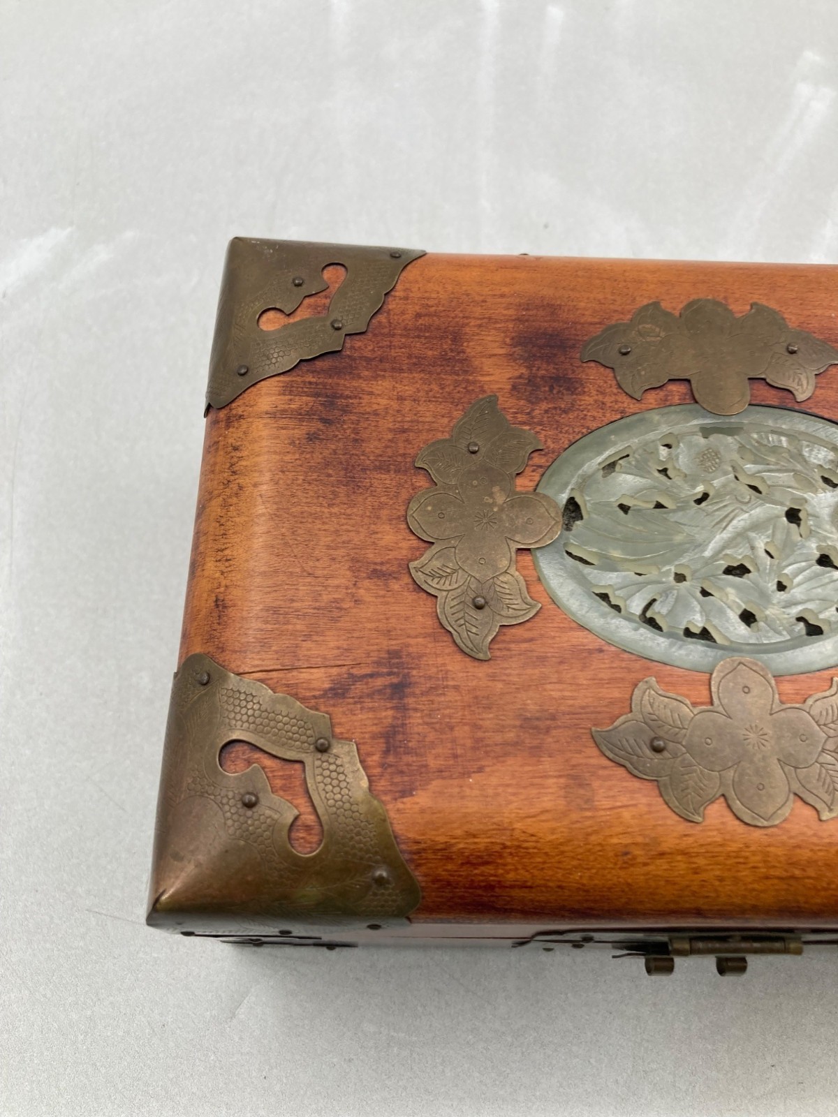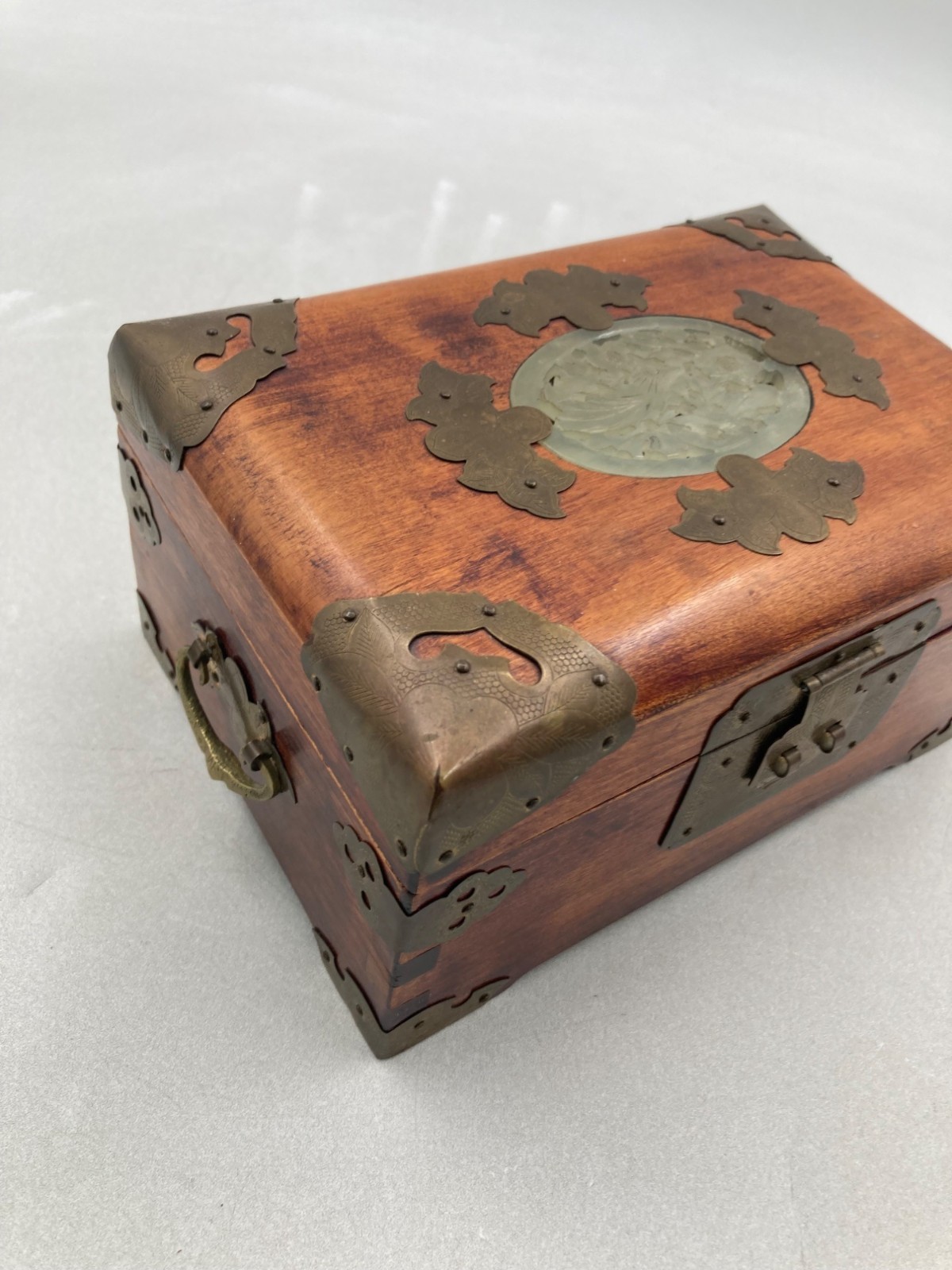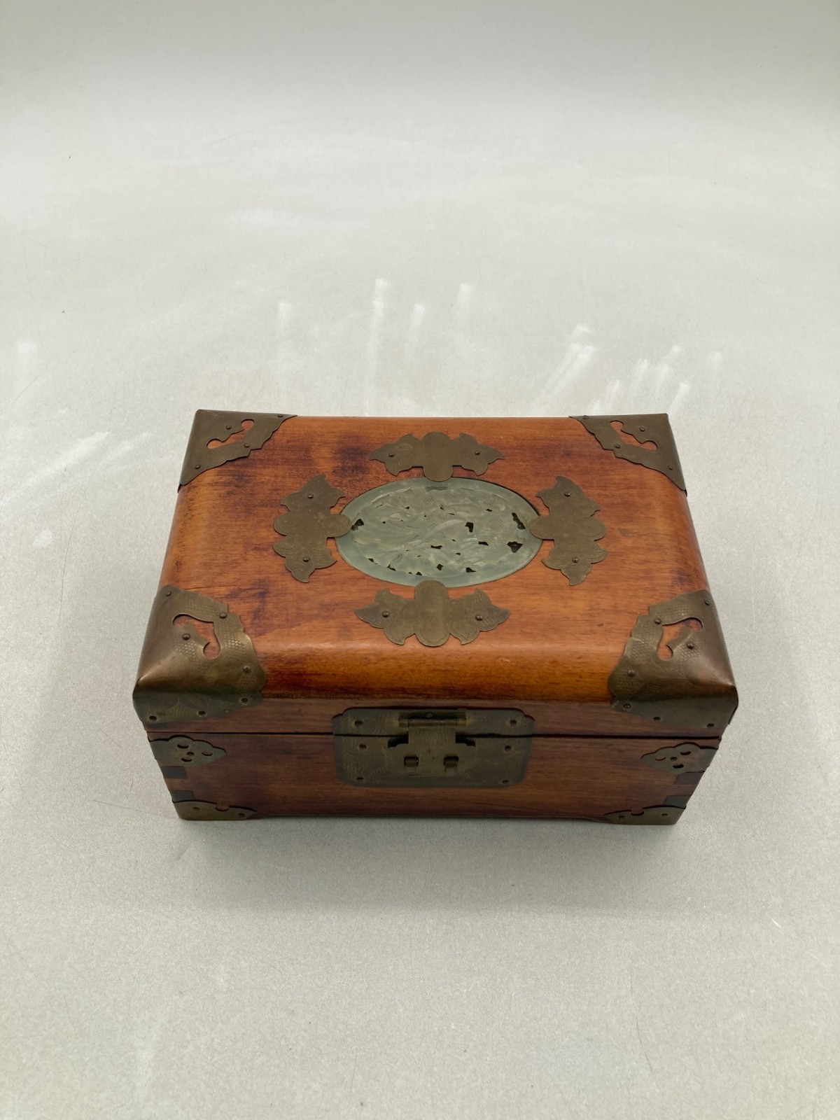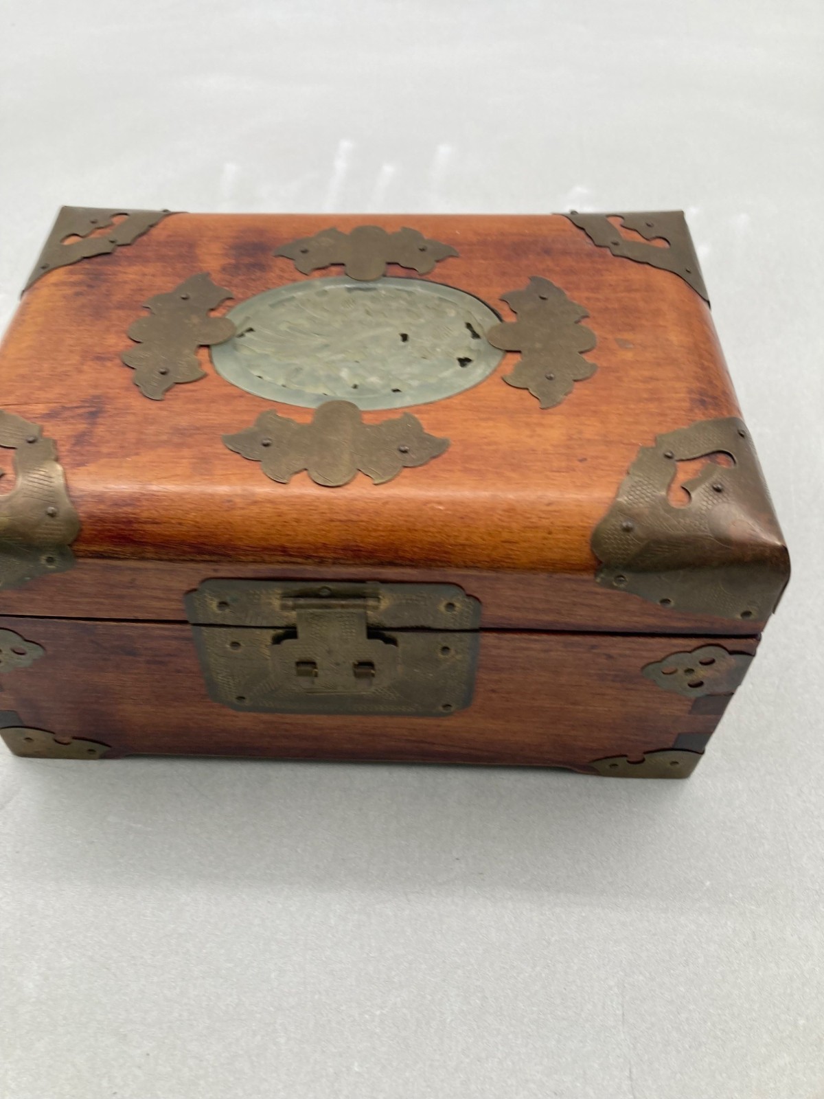 VINTAGE WOOD BRASS SHANGHAI CHINESE OVAL JADE INLAY SILK PADDED JEWELRY BOX