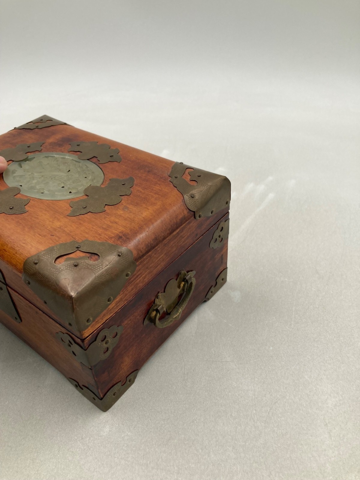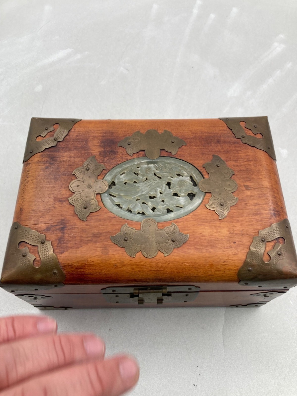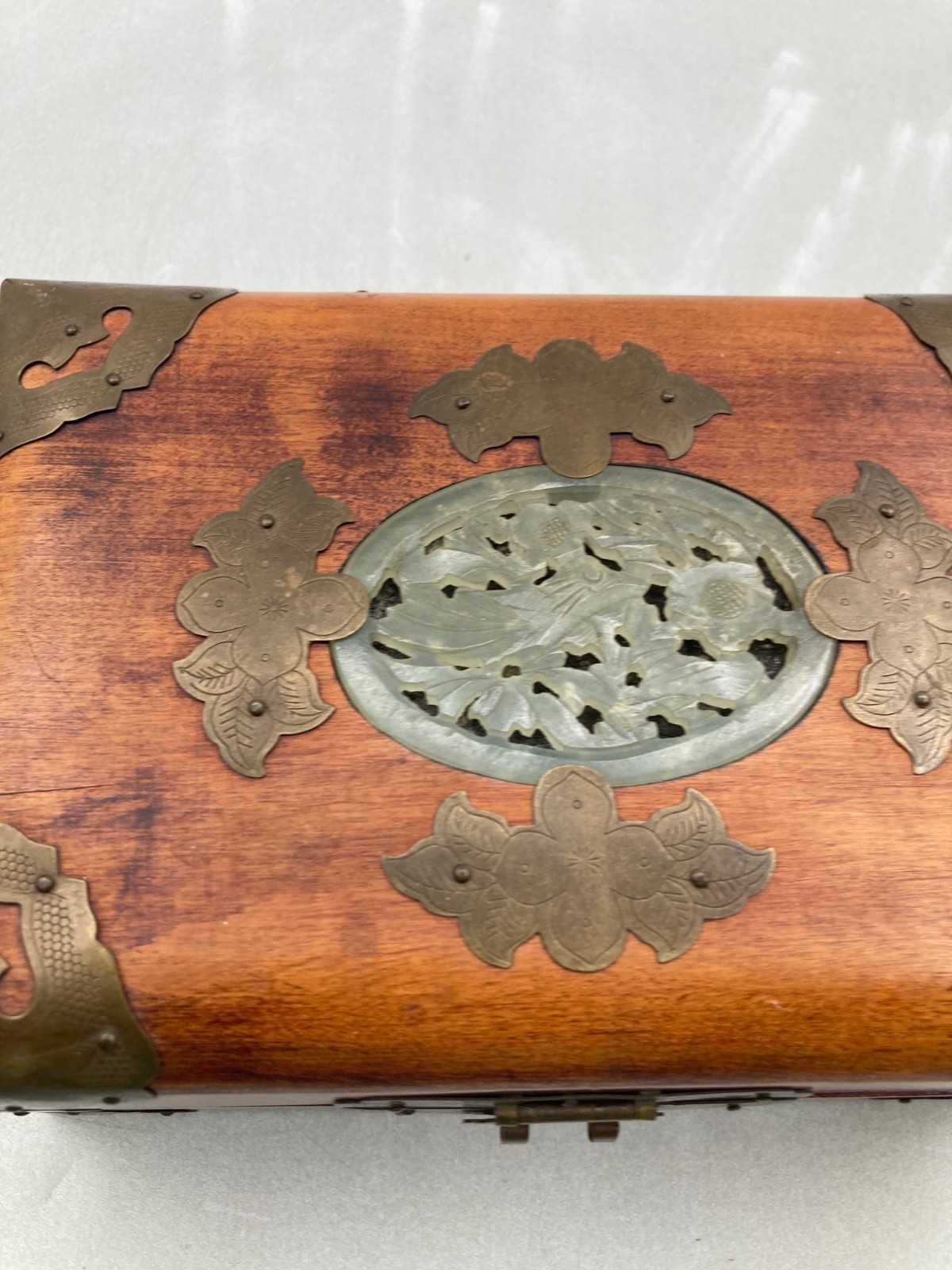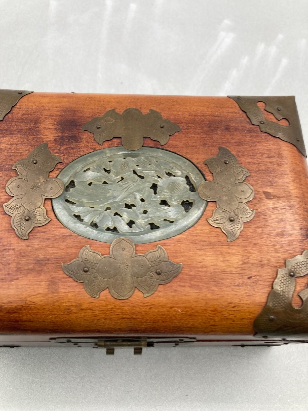 VINTAGE WOOD BRASS SHANGHAI CHINESE OVAL JADE INLAY SILK PADDED JEWELRY BOX
