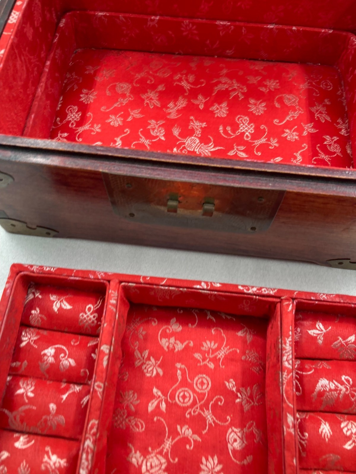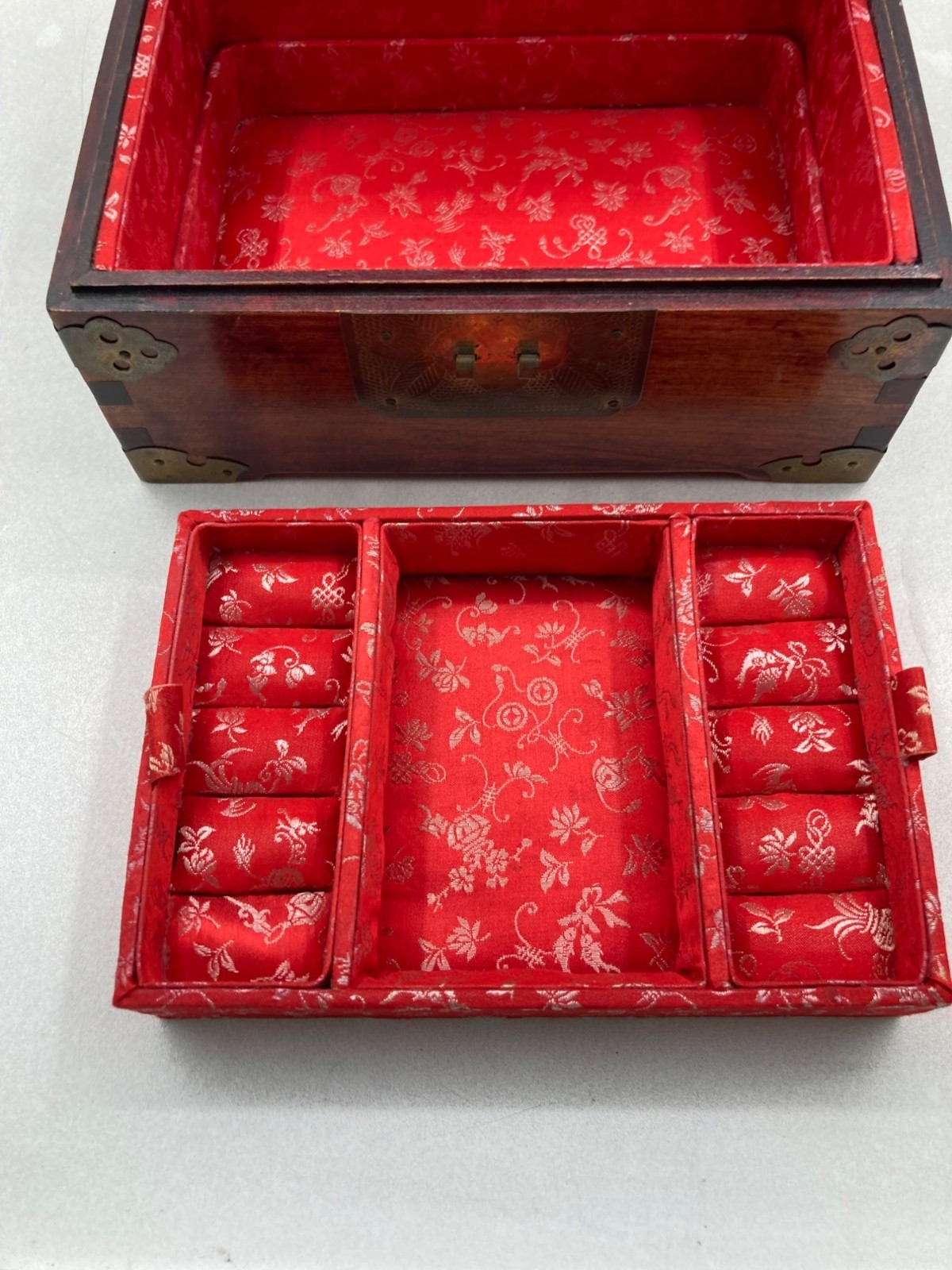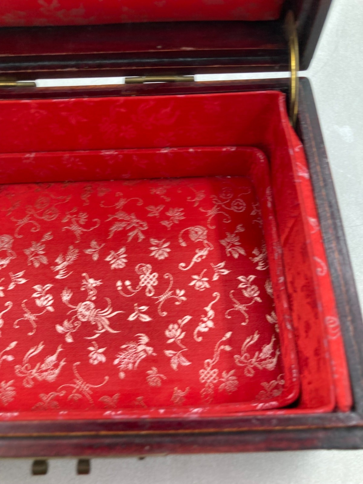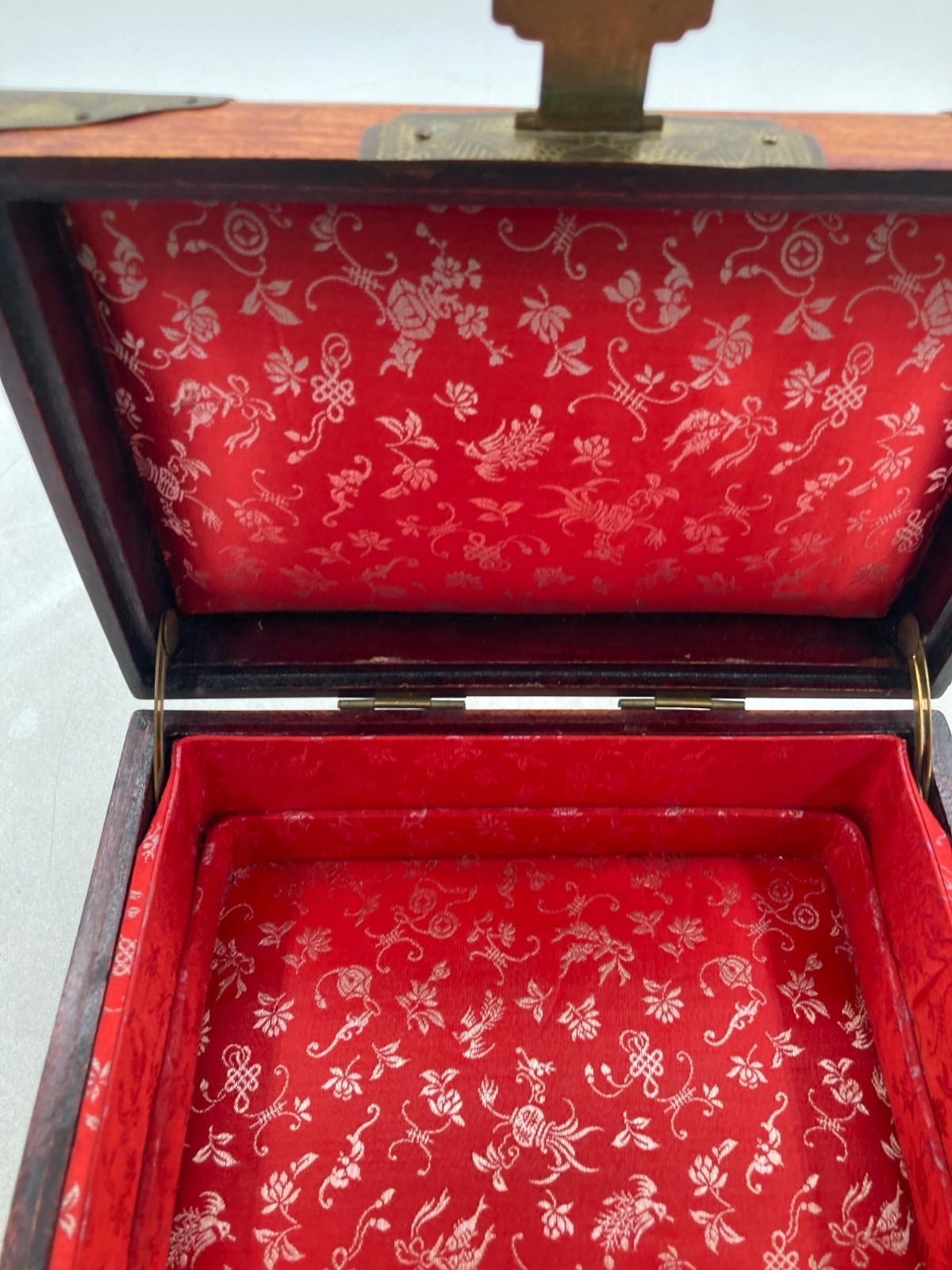 VINTAGE WOOD BRASS SHANGHAI CHINESE OVAL JADE INLAY SILK PADDED JEWELRY BOX