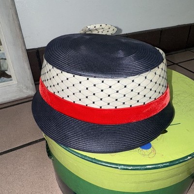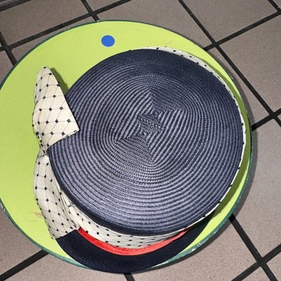 Vtg 1950s Jan Leslie Navy Straw Pillbox Hat Ivory / Red Bow -Red/white / Blue